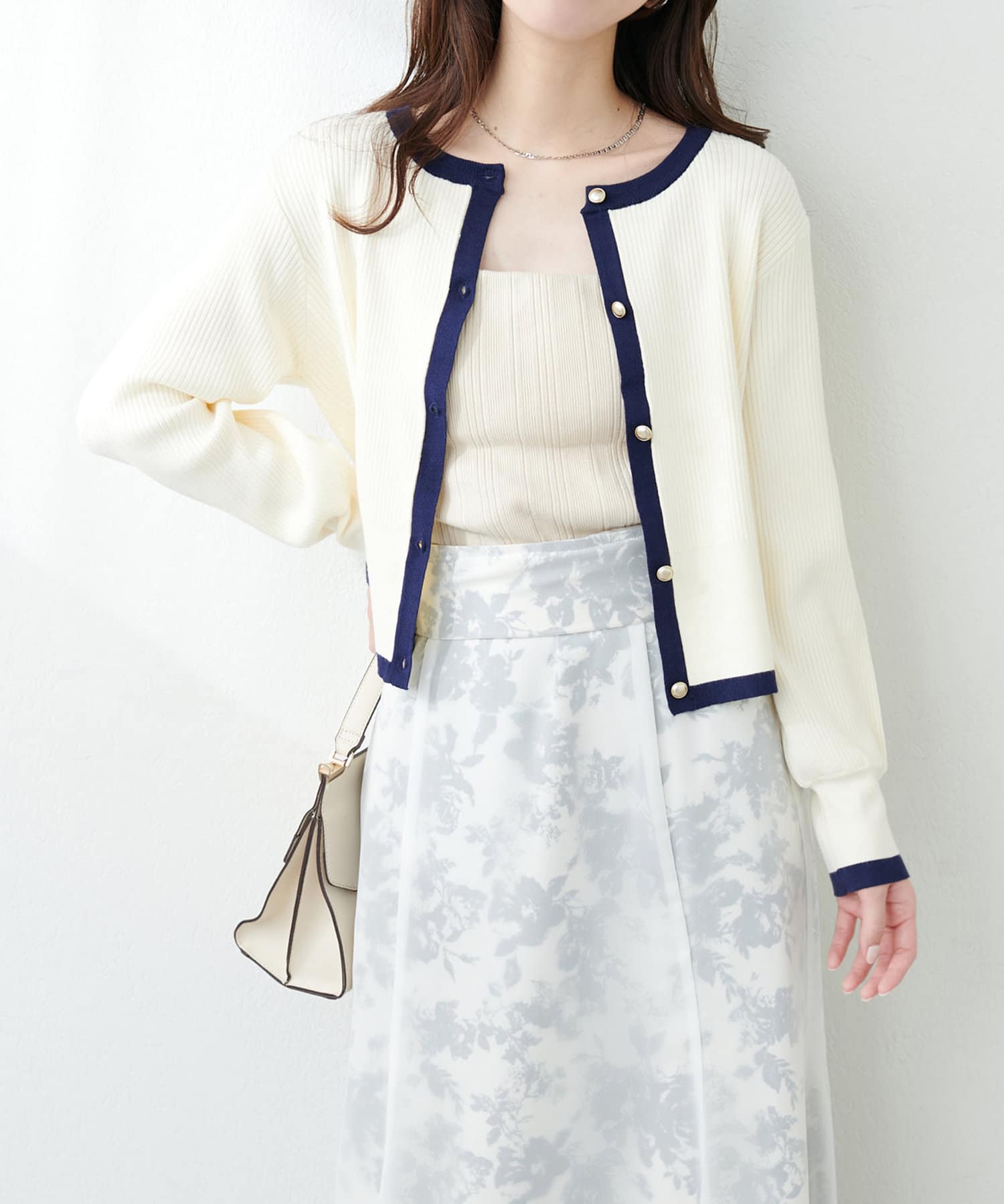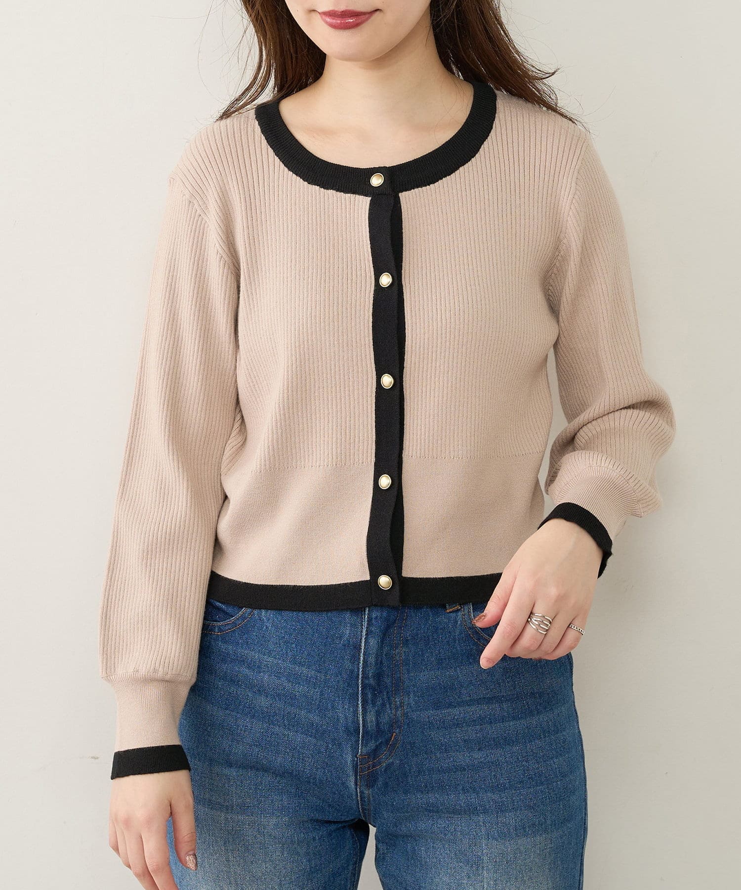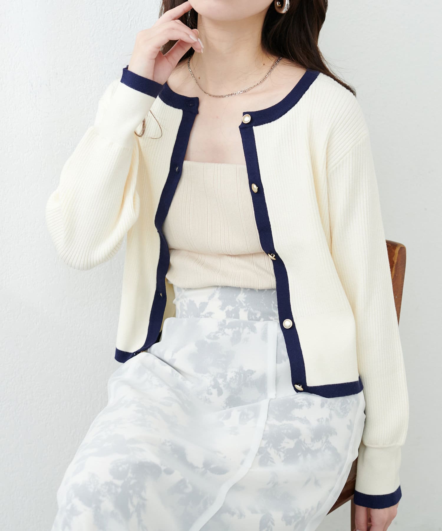 袖口や首回りに配色デザインを施し、カーディガンとしてはもちろん、