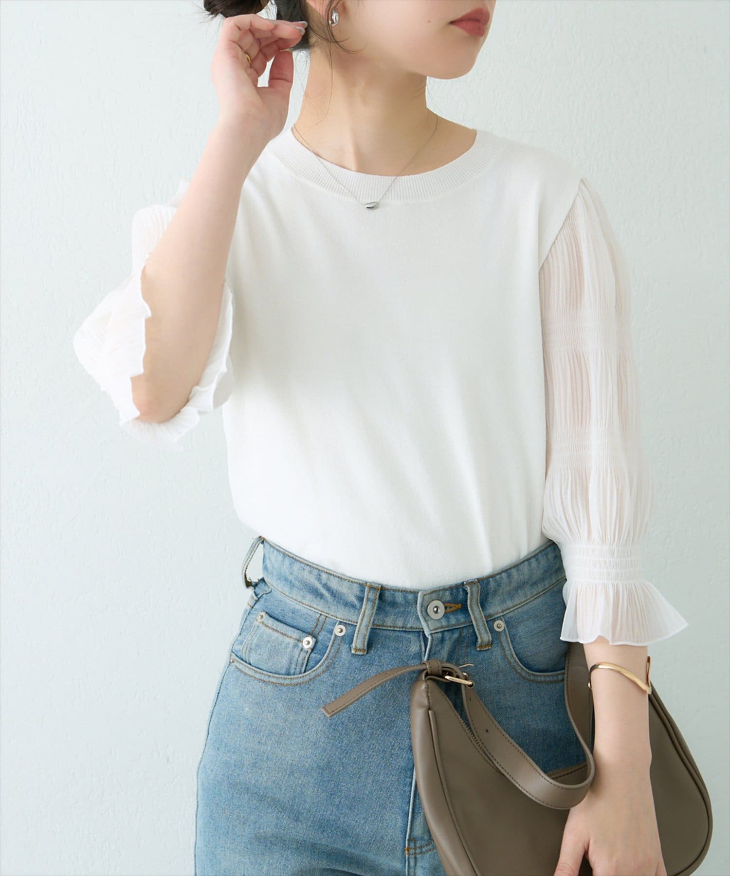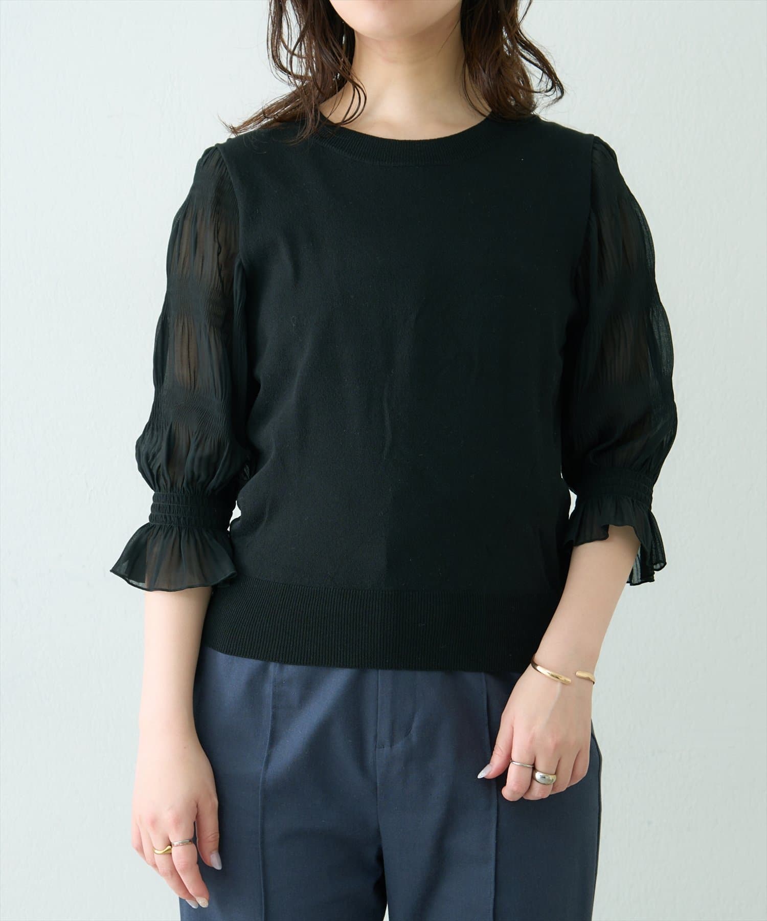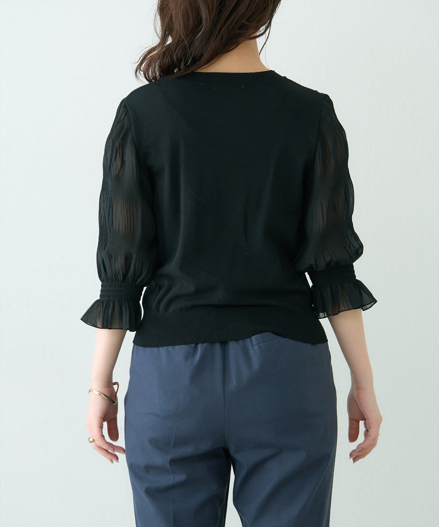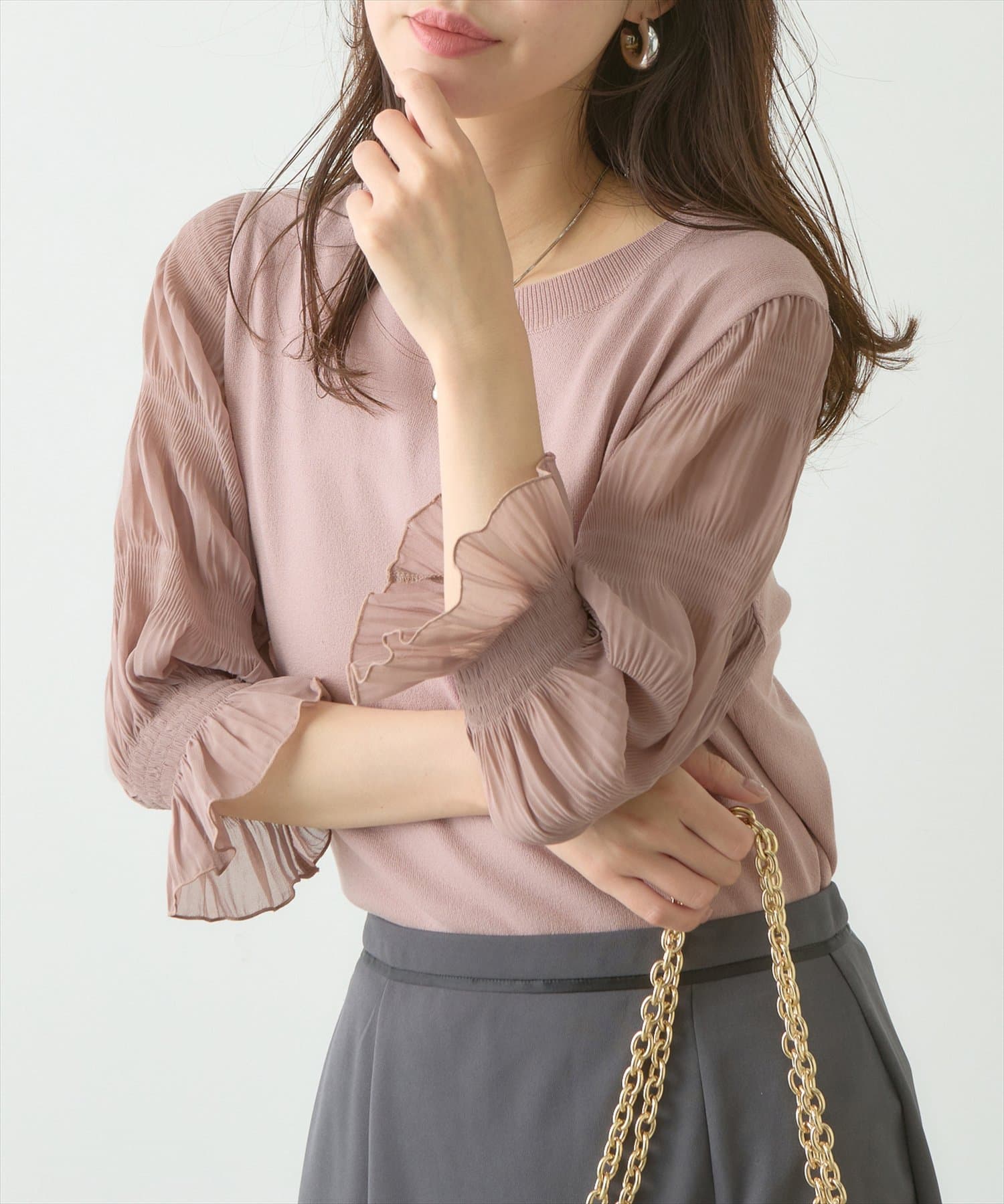 さらっとした着心地の良いニット地を採用し、袖部分をマジョリカプリーツにすることで