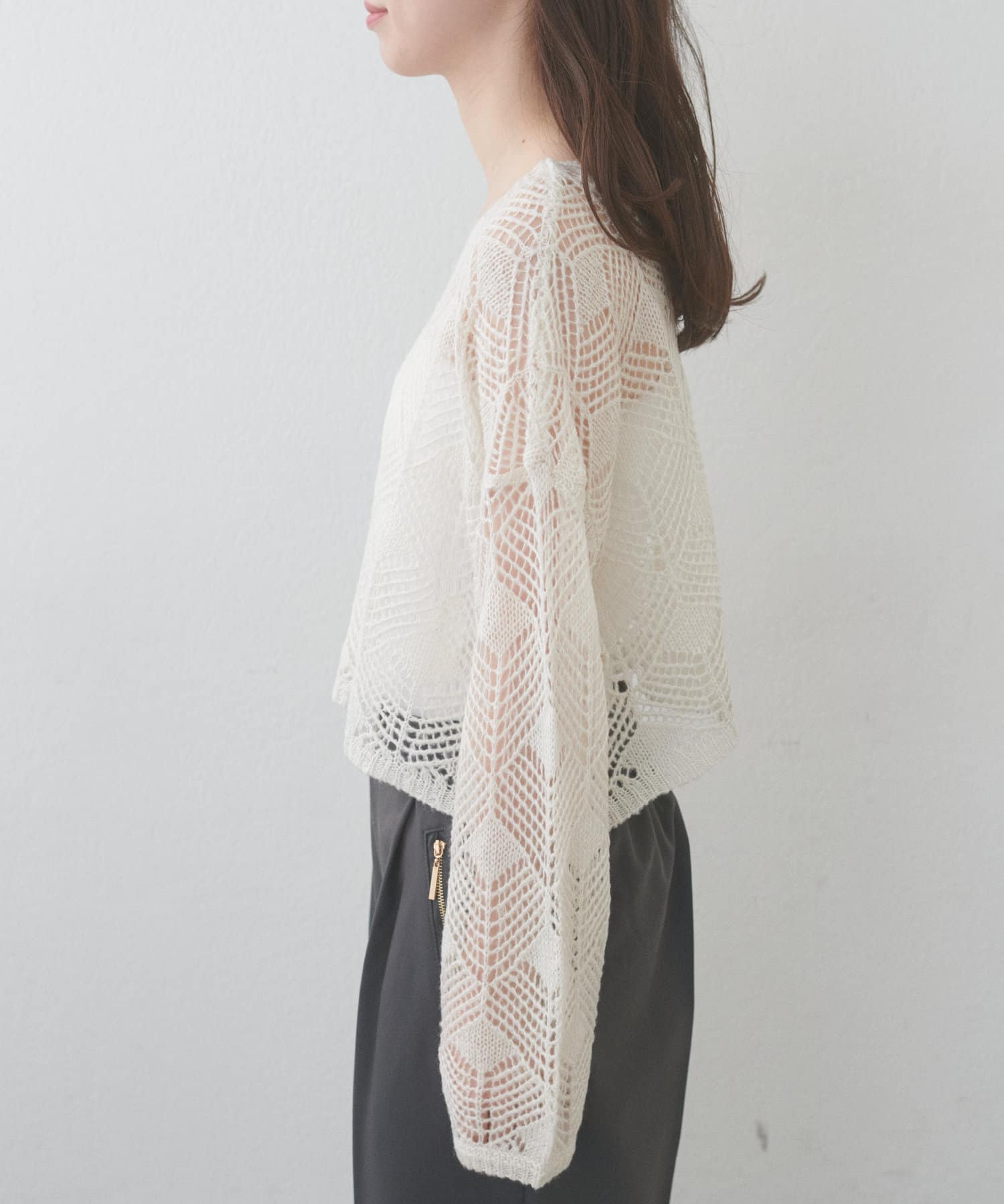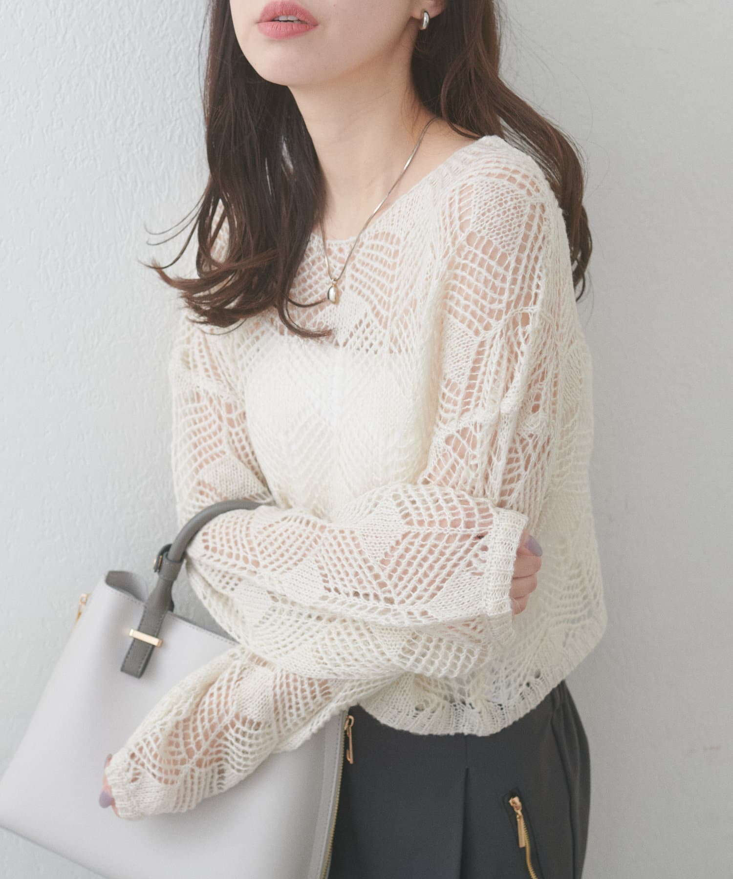 やや肩を落としたドロップショルダーと、ゆとりのあるネックラインが女性らしさを引き立ててくれます。