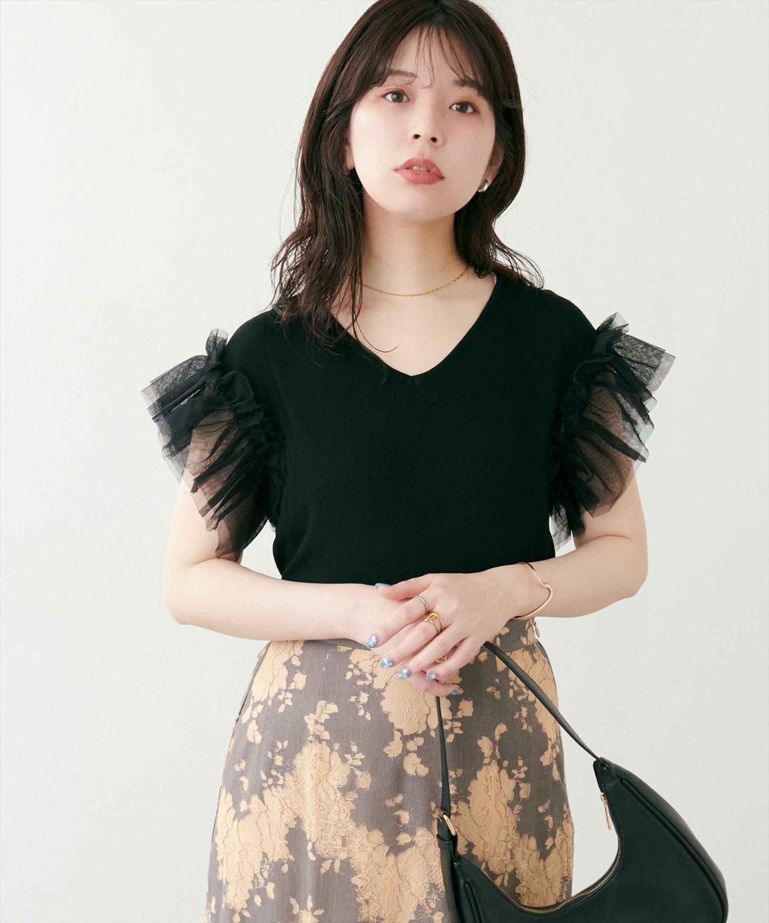 袖はふわっとしたチュール素材で、異素材のコントラストでコーディネートをアップデート。