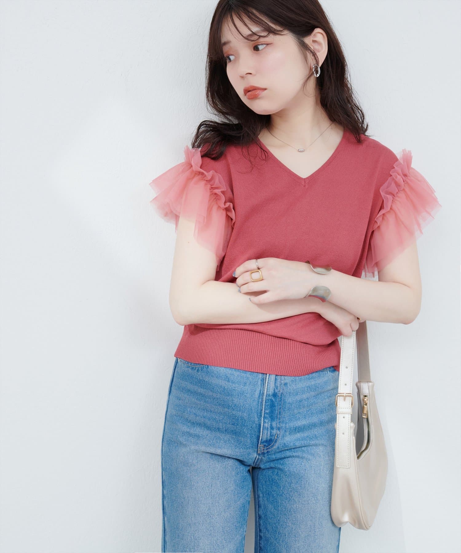 お袖にチュールをたっぷり使った華やかなニットトップス。