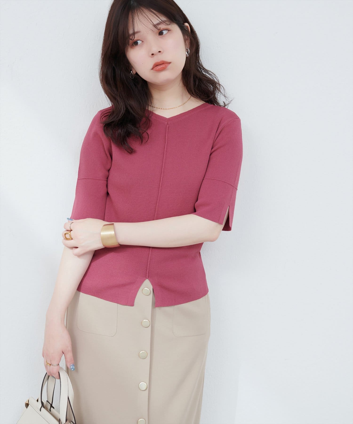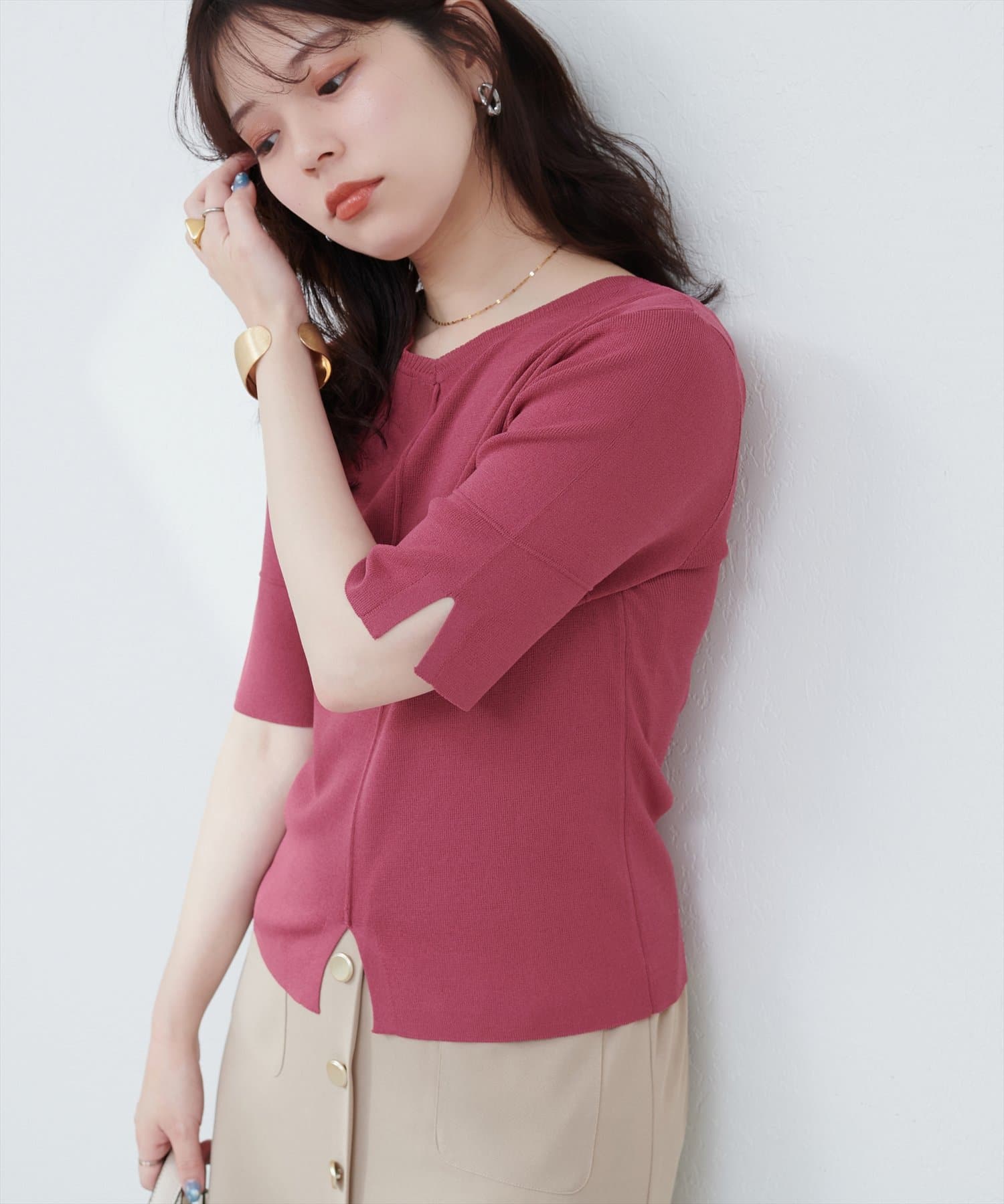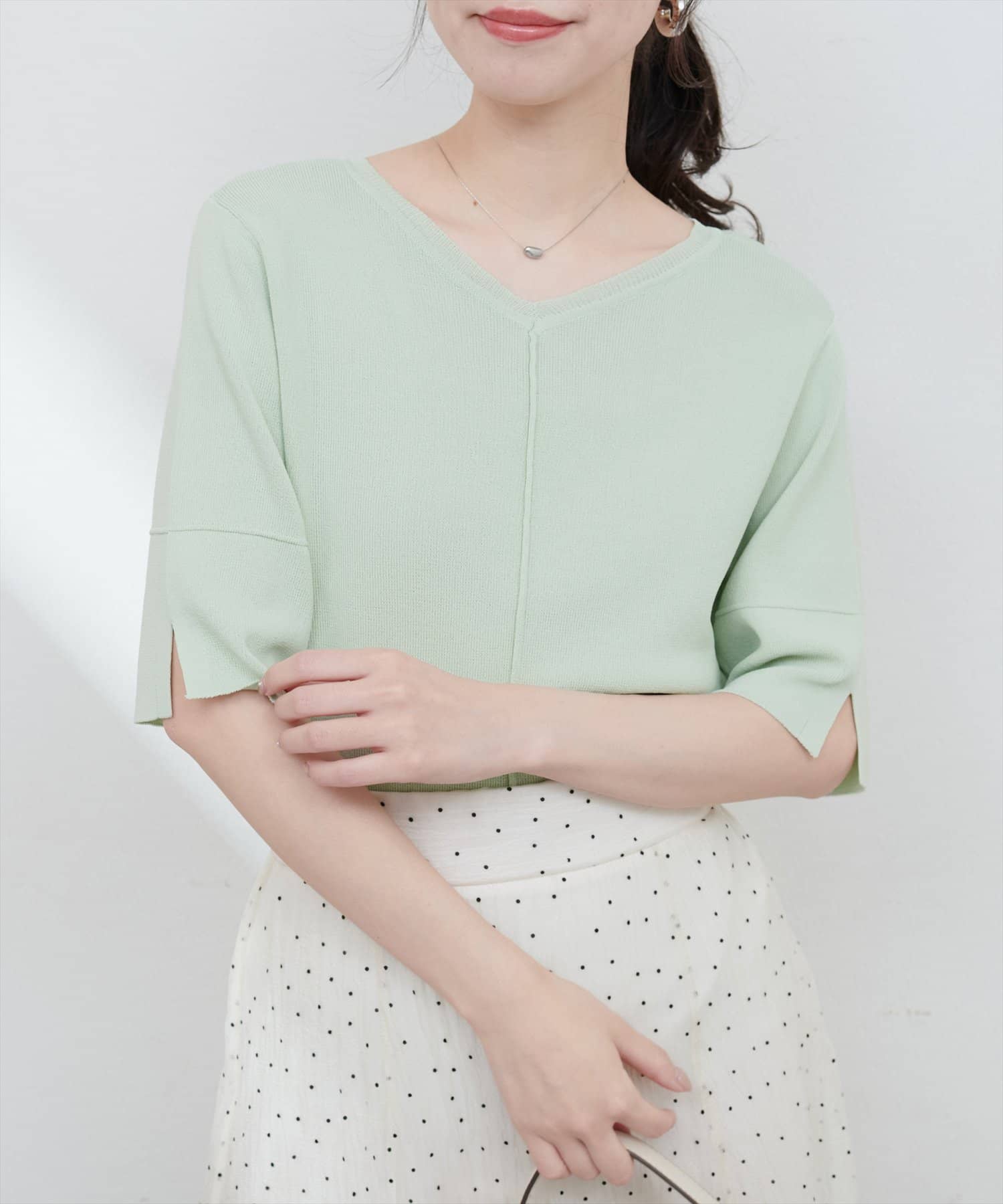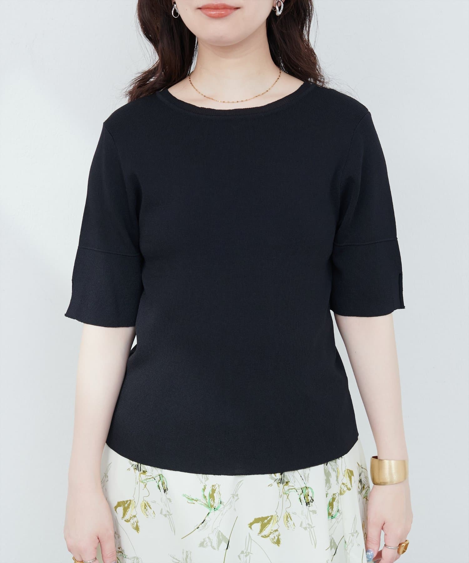 シンプルでどんなボトムスにも合わせやすいニットトップス。