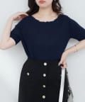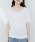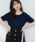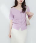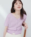 Vネックをフロントにして、ボタンは上品なパール調でさりげないアクセントに。
