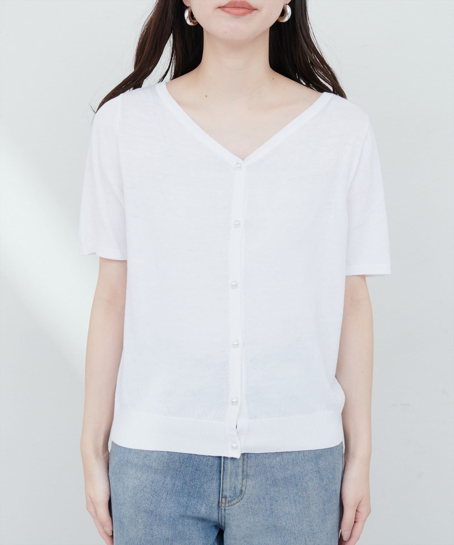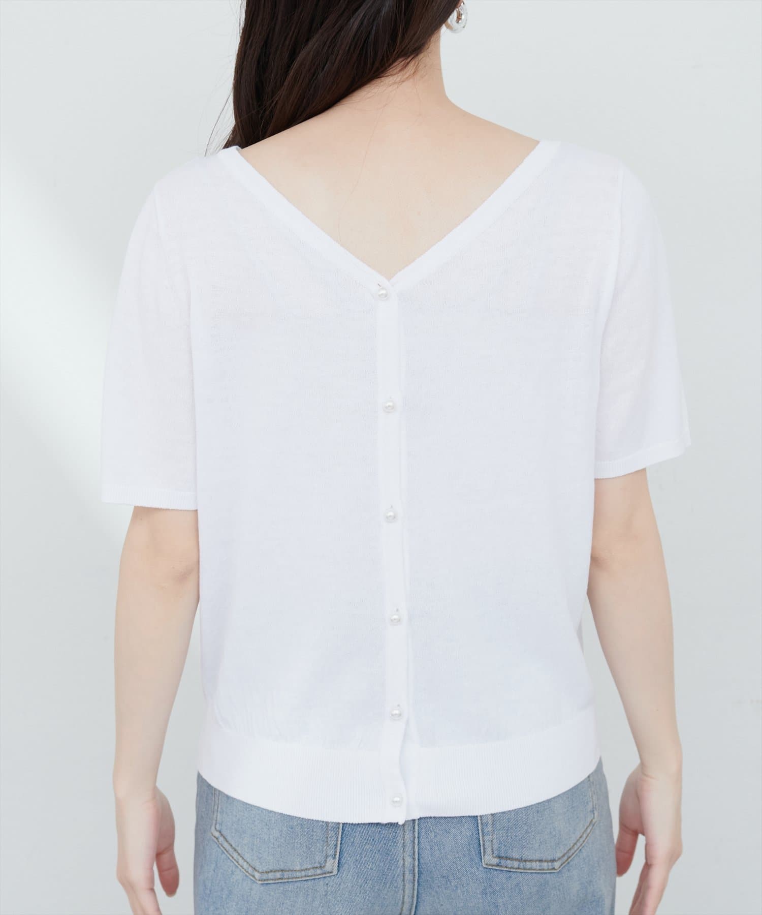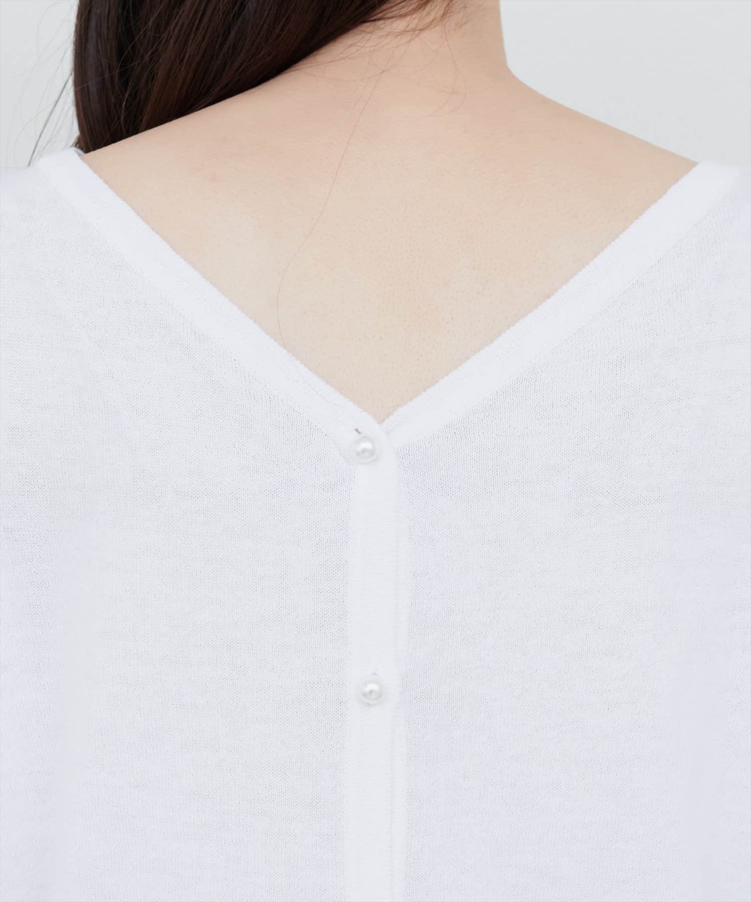 Vネックをフロントにして、ボタンは上品なパール調でさりげないアクセントに。