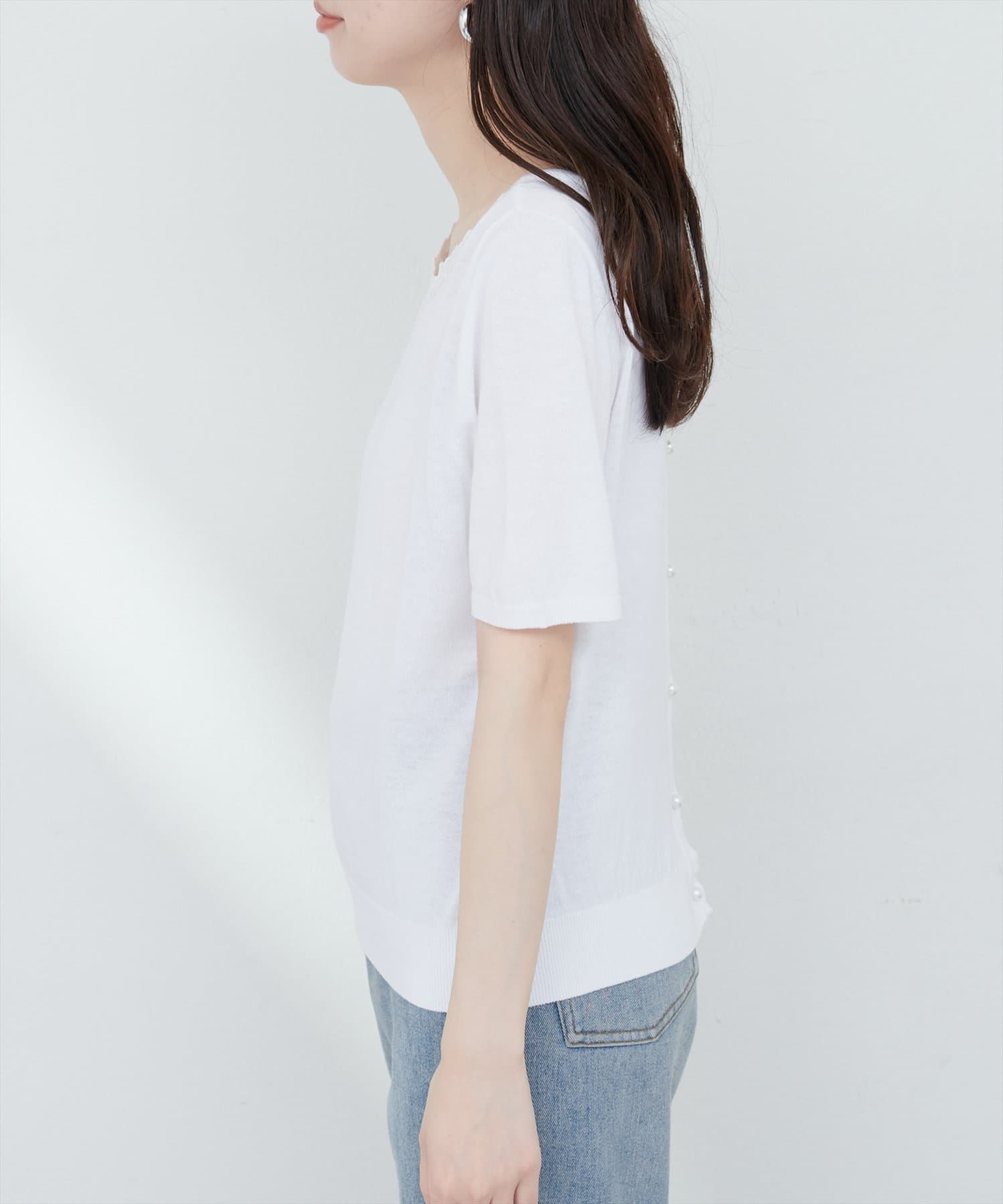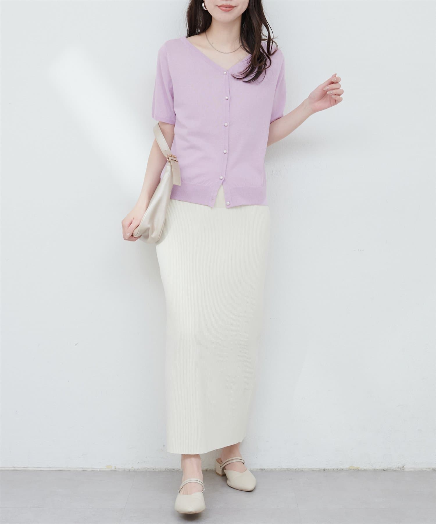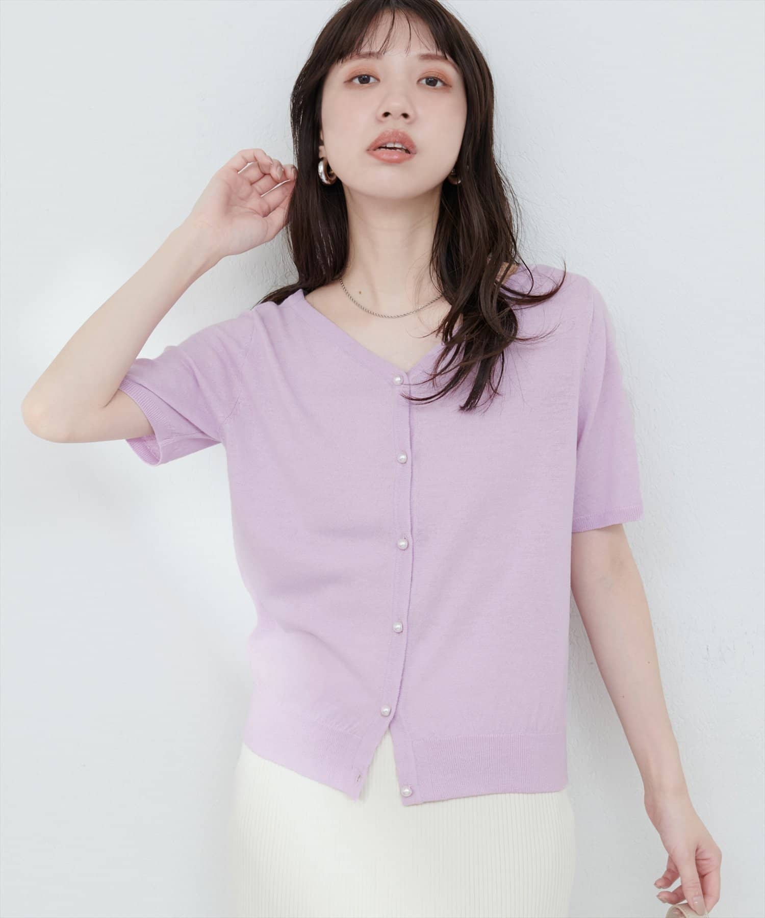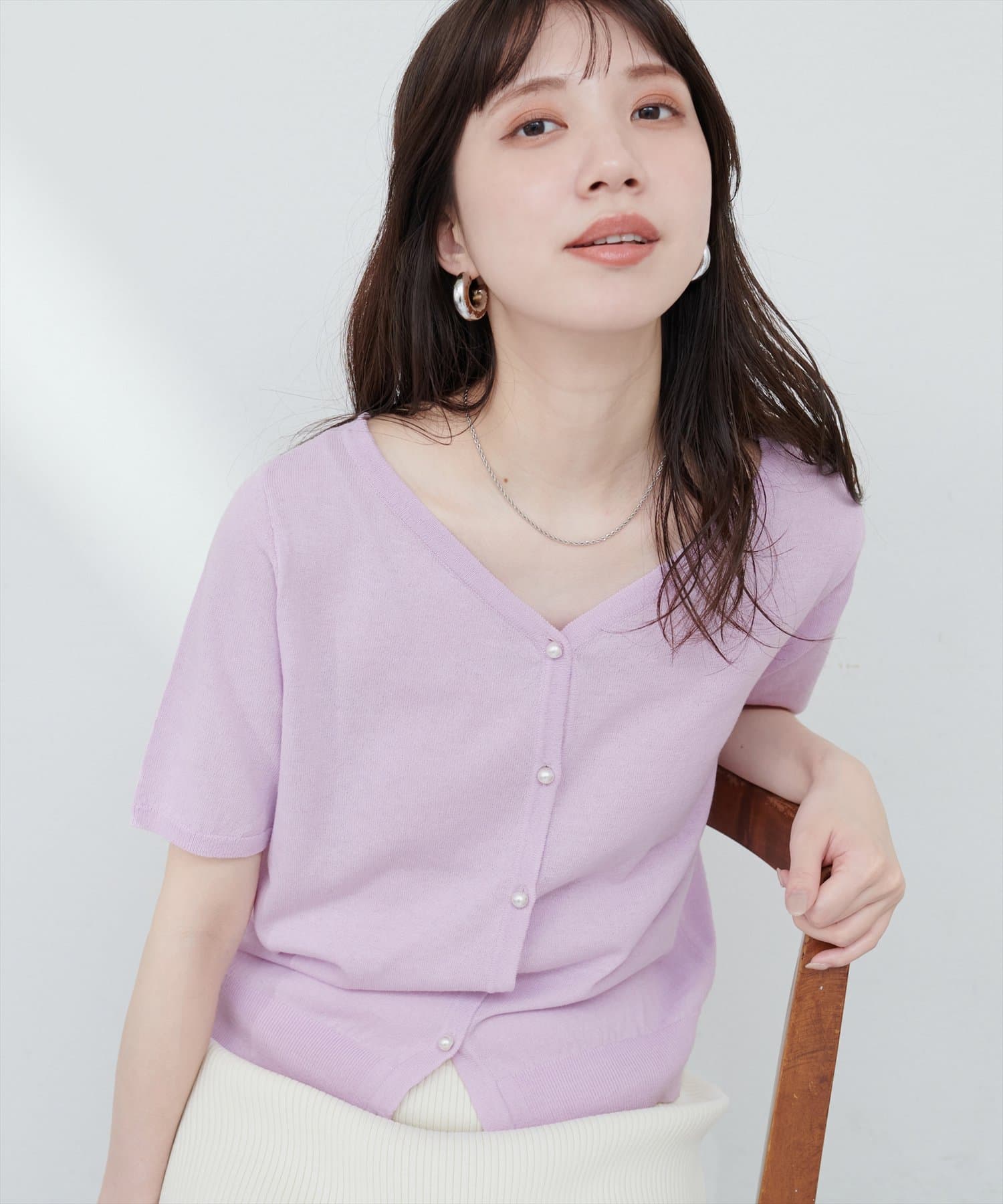 Vネックをフロントにして、ボタンは上品なパール調でさりげないアクセントに。
