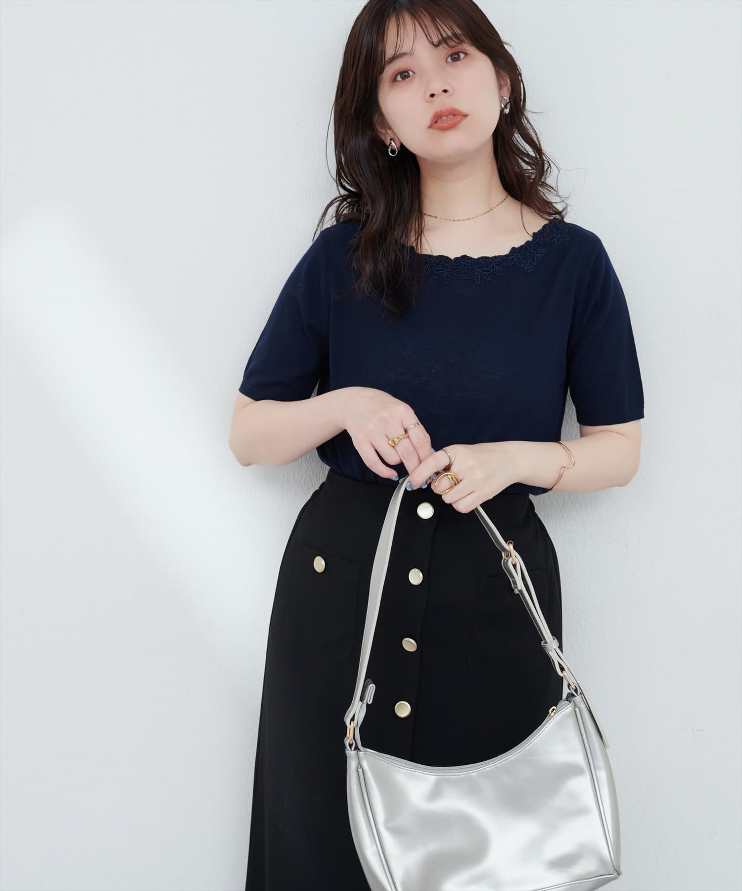 フロントに刺繍をあしらったデザインは、上品で洗練された印象を与え、顔周りを華やかに演出。