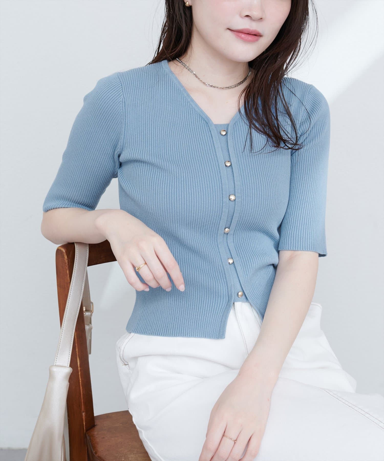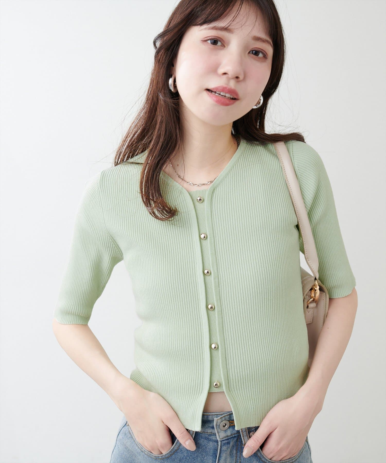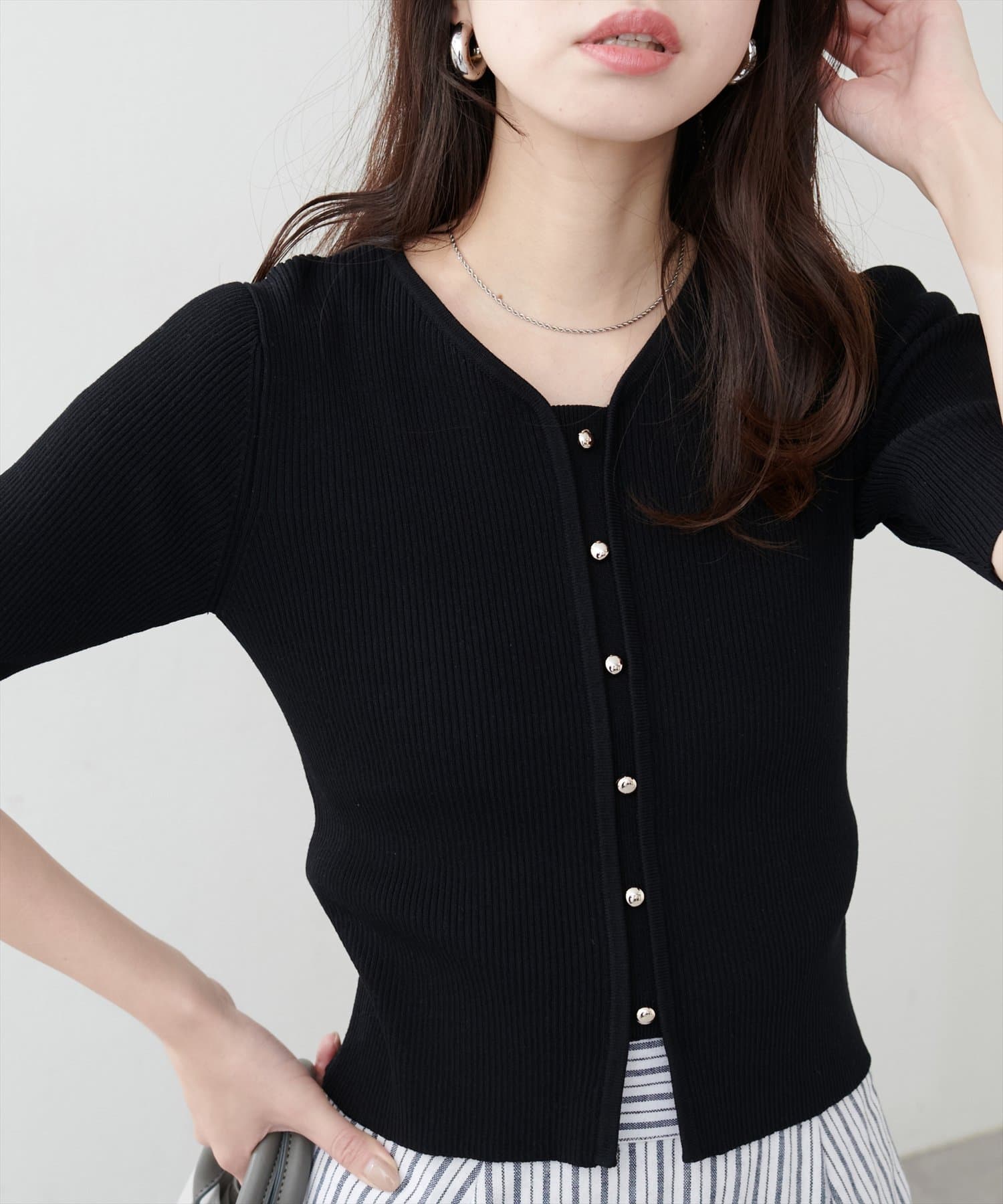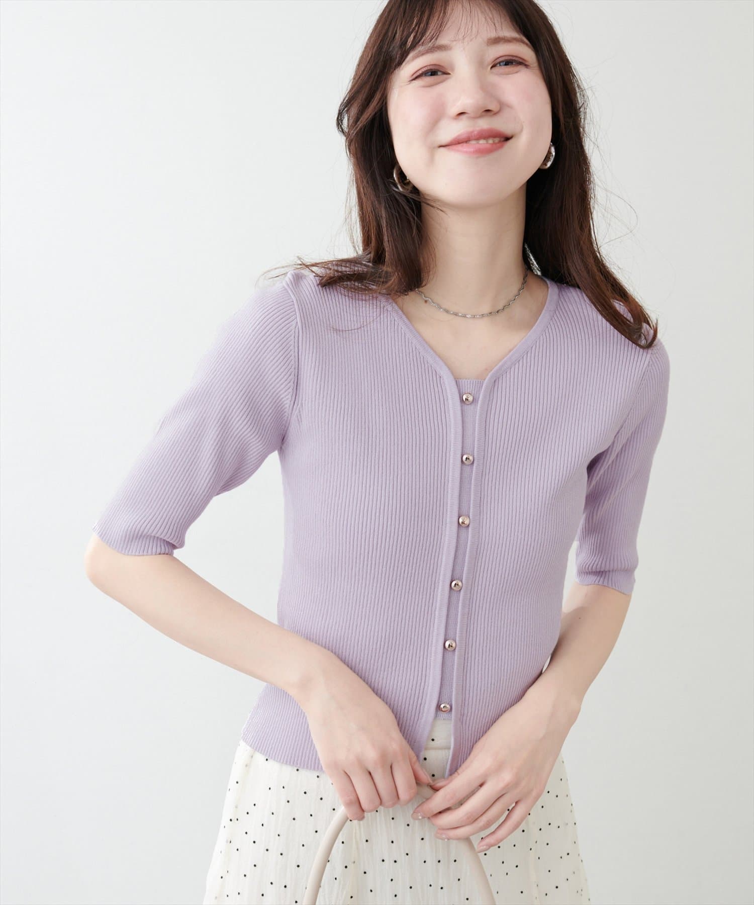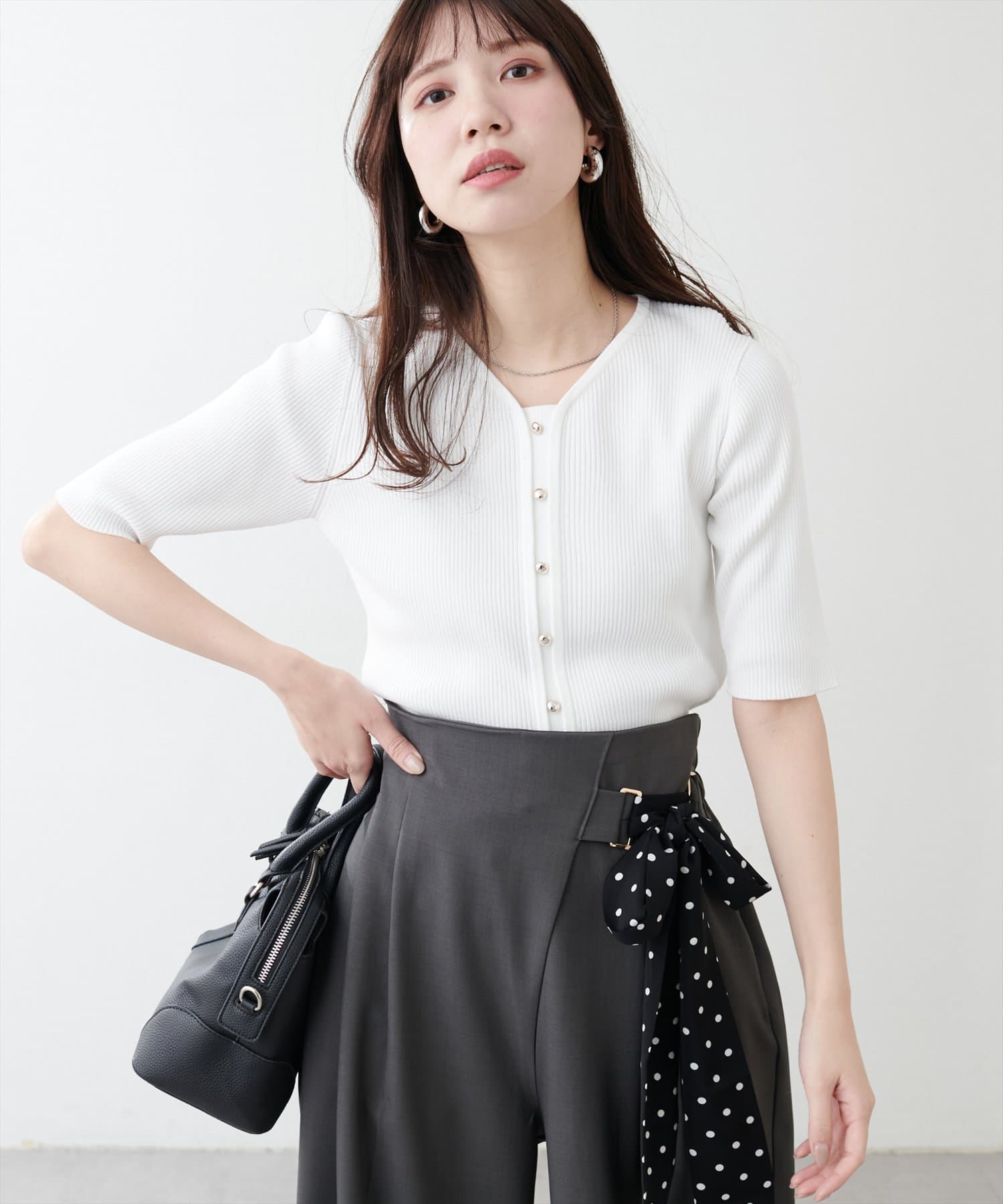 フロントの切り替えでカーディガン風デザインのニットトップス。