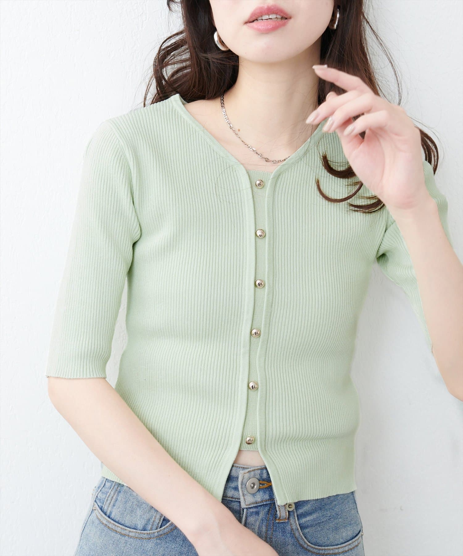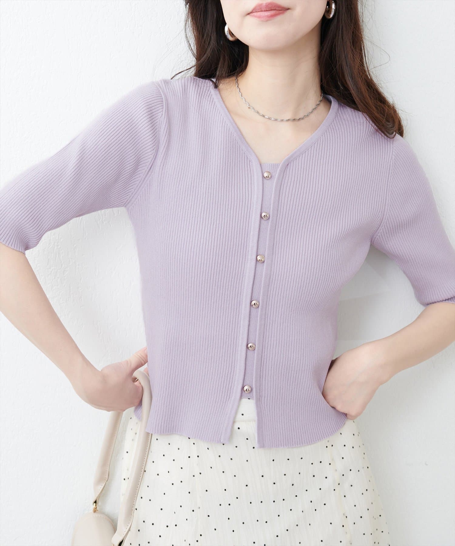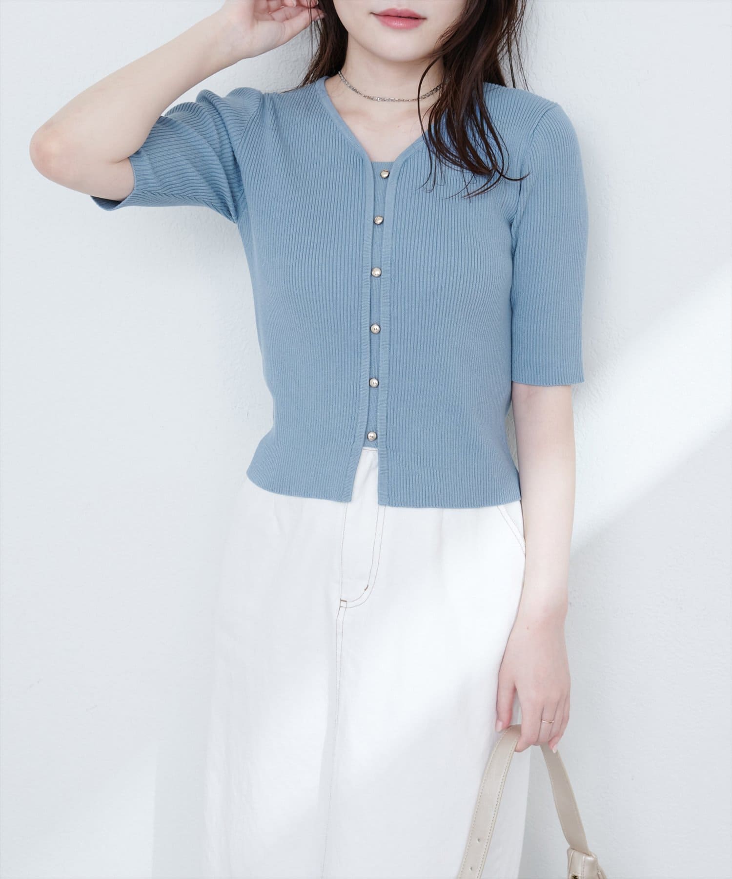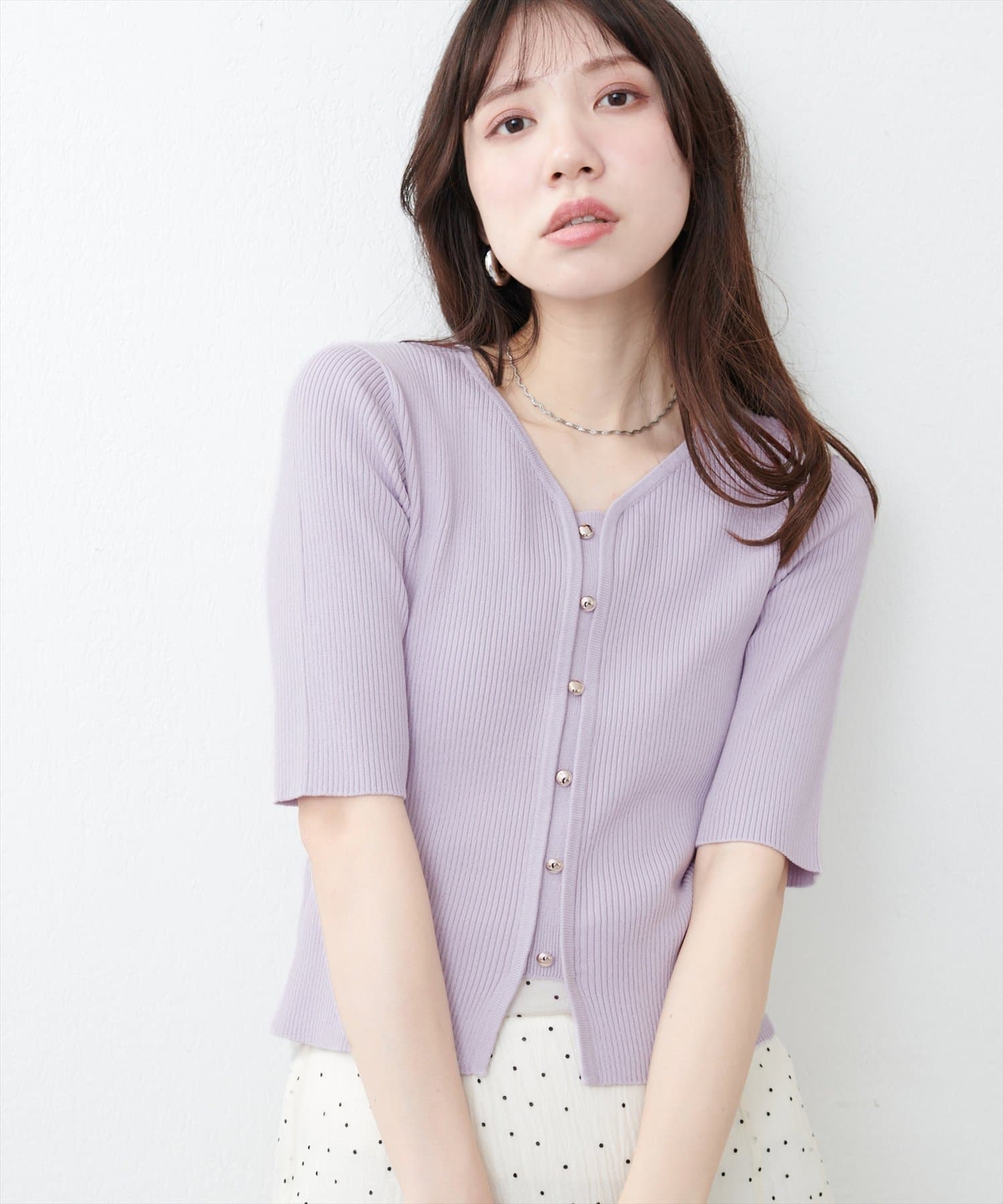 フロントの切り替えでカーディガン風デザインのニットトップス。