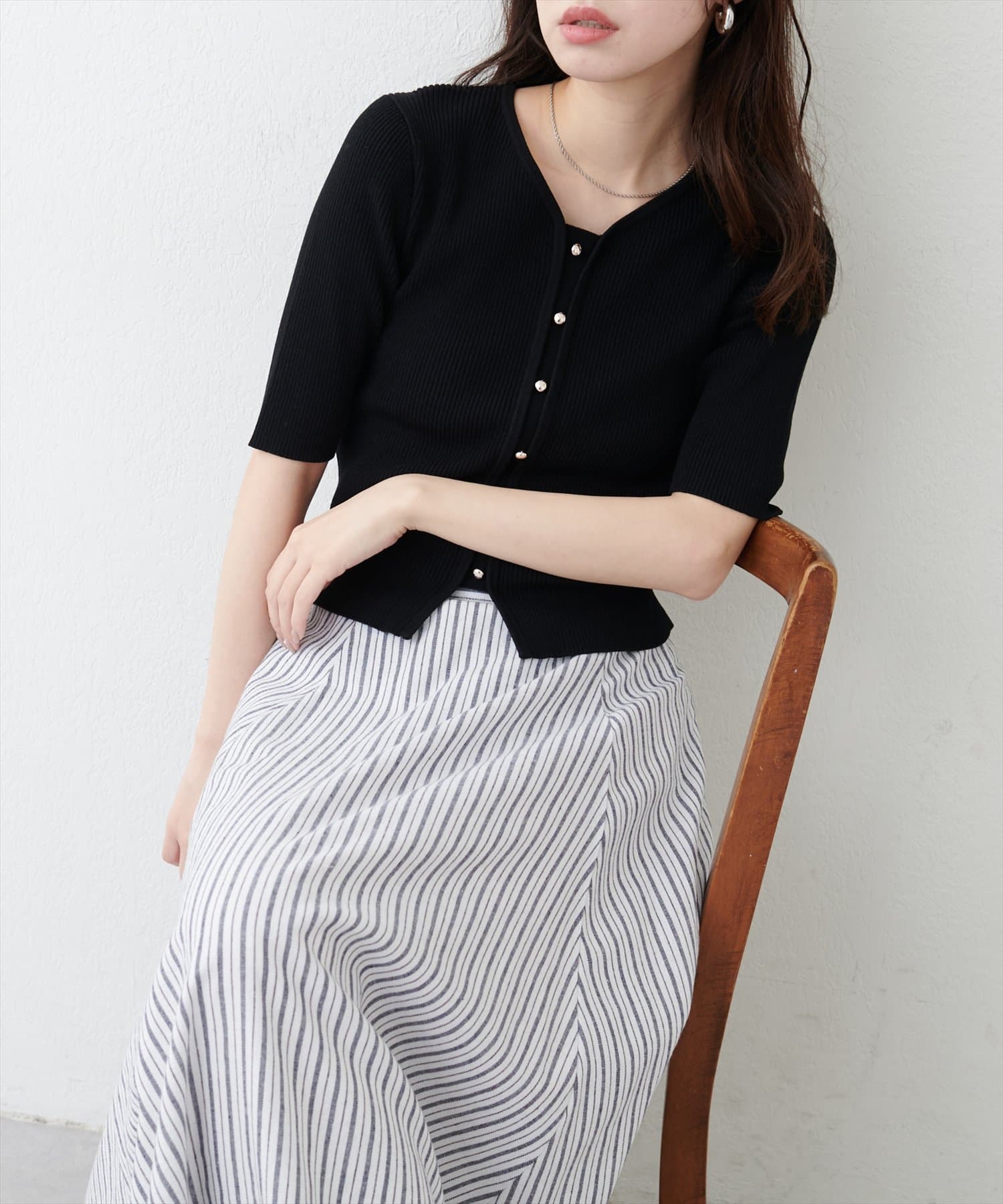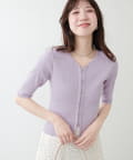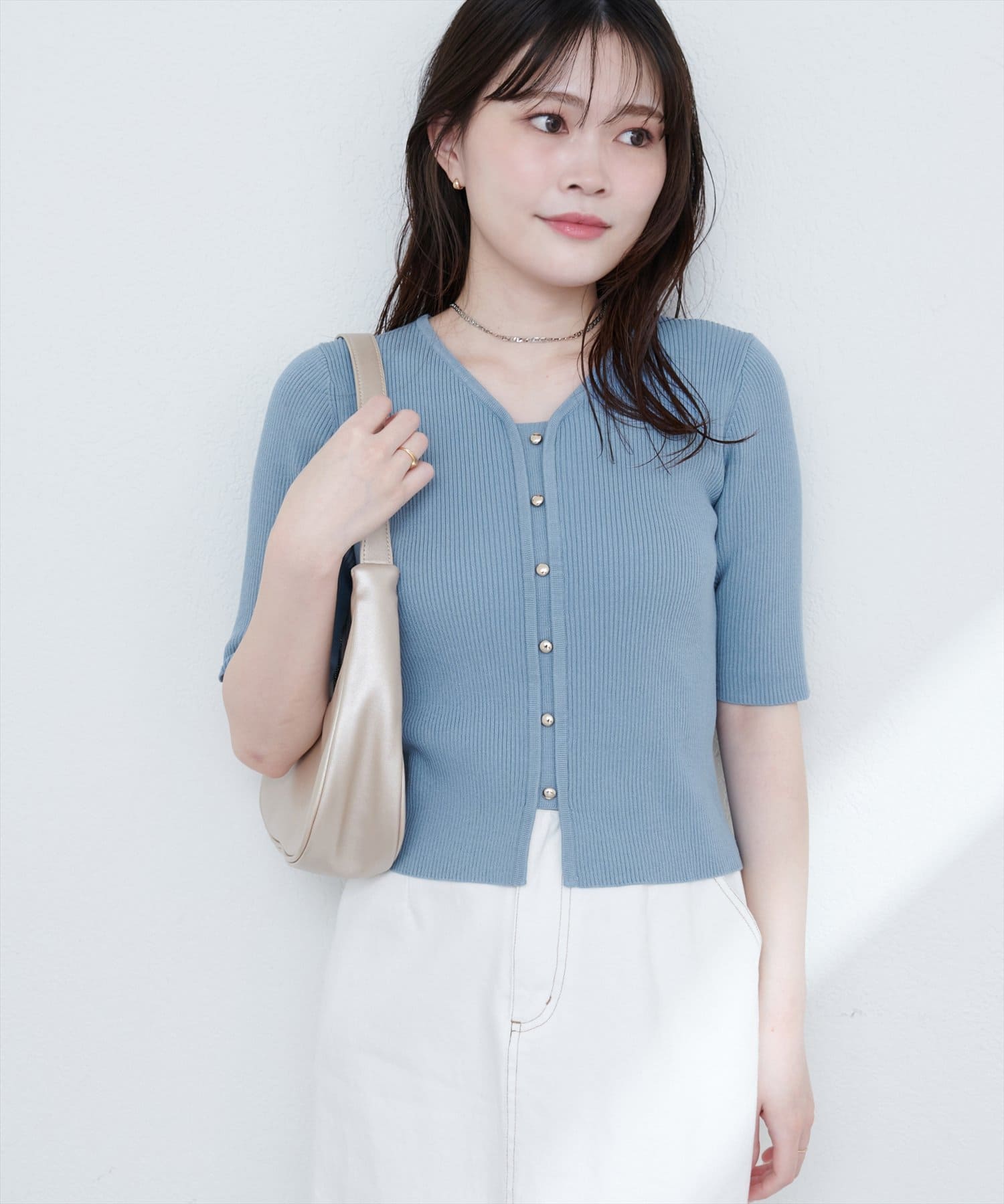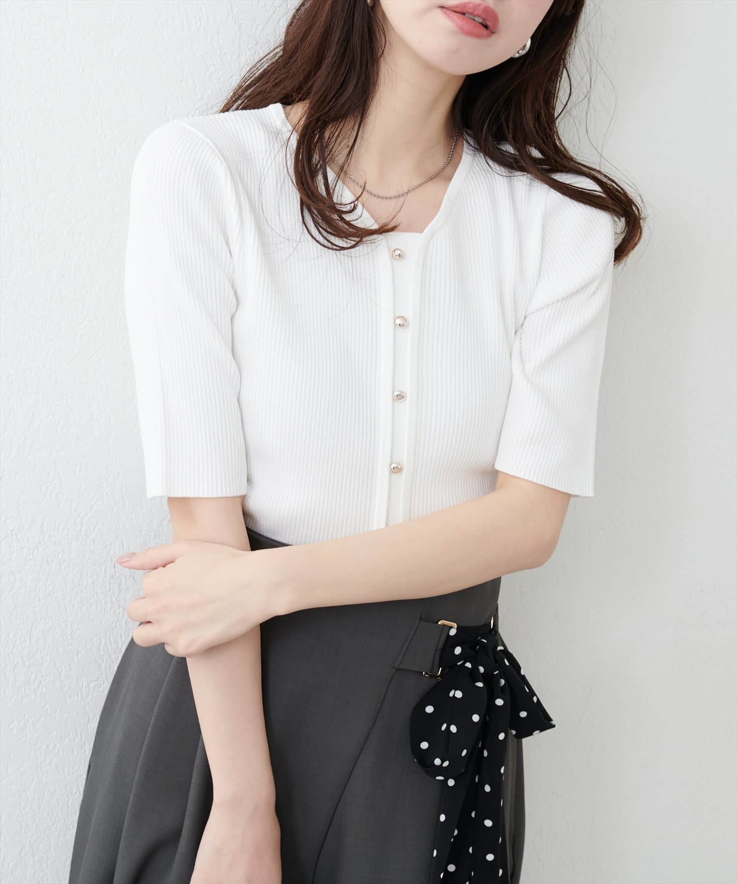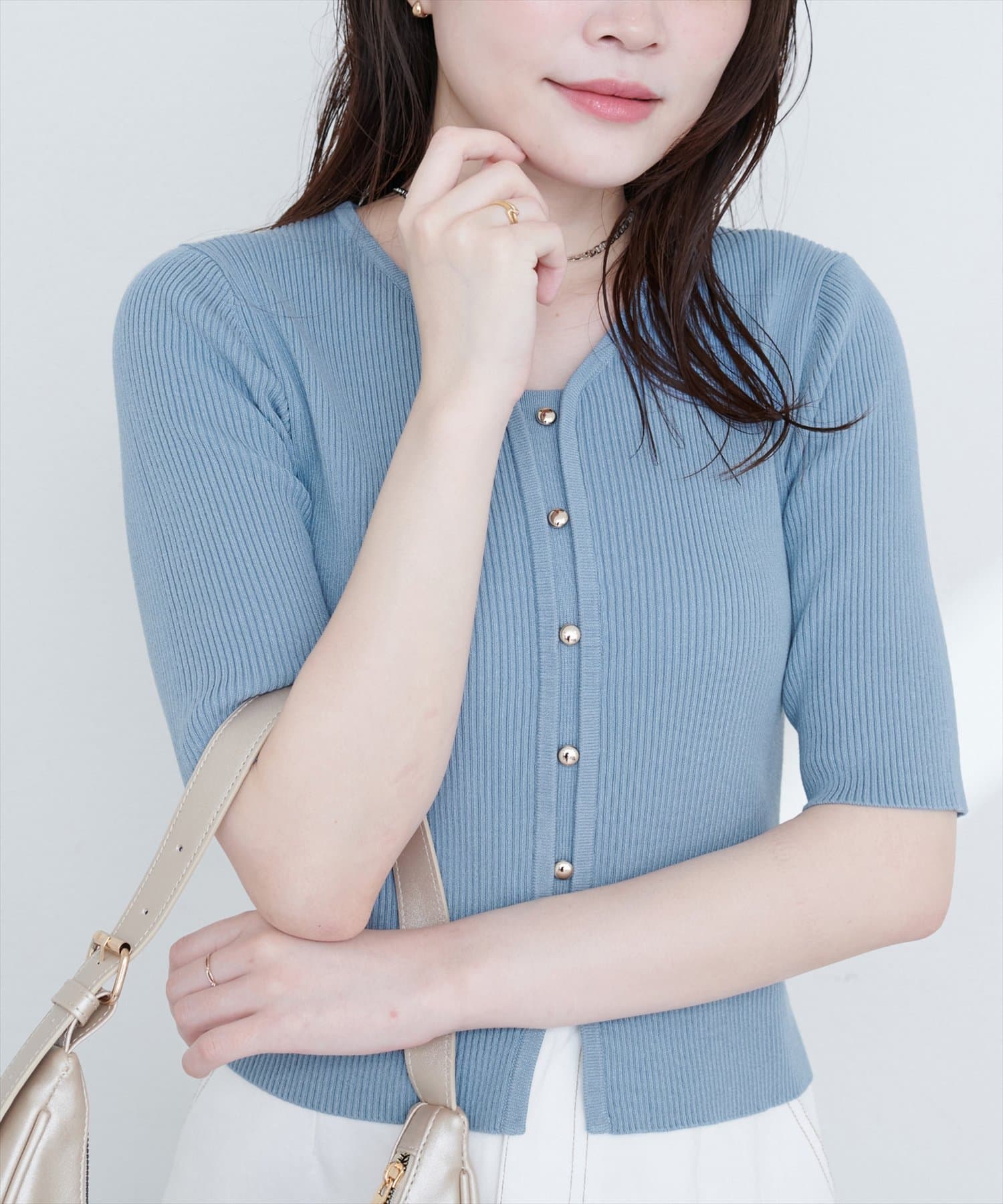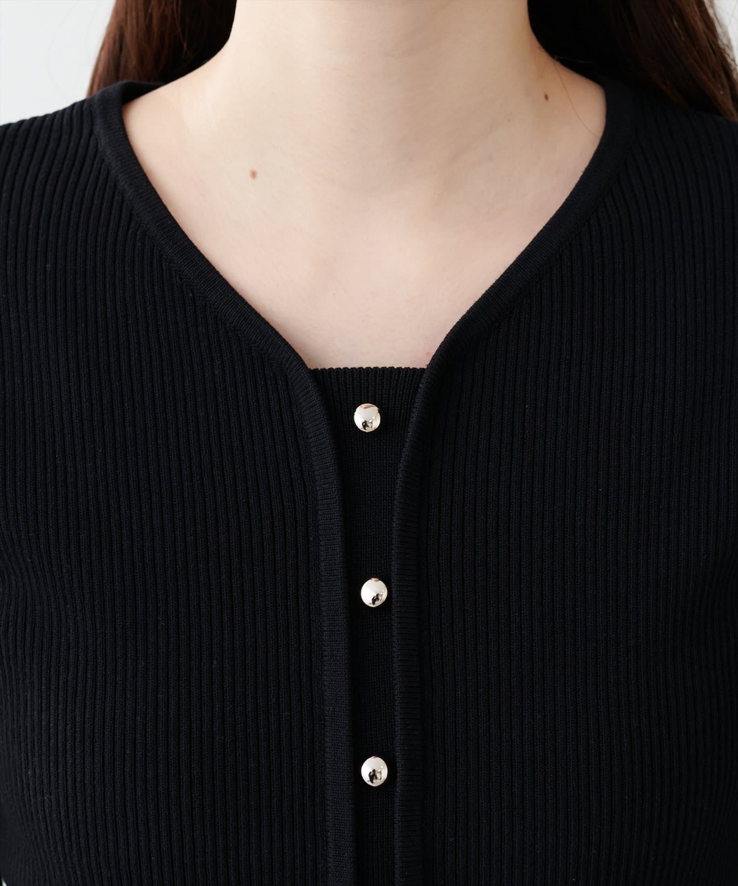フロントの切り替えでカーディガン風デザインのニットトップス。
