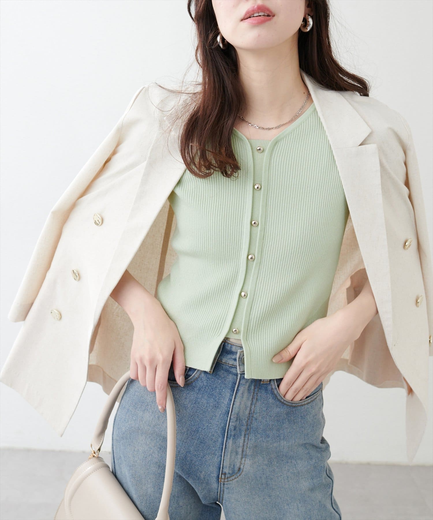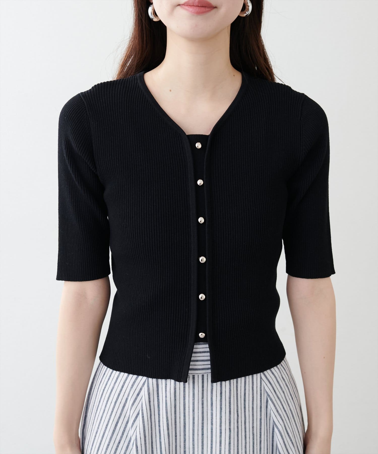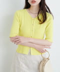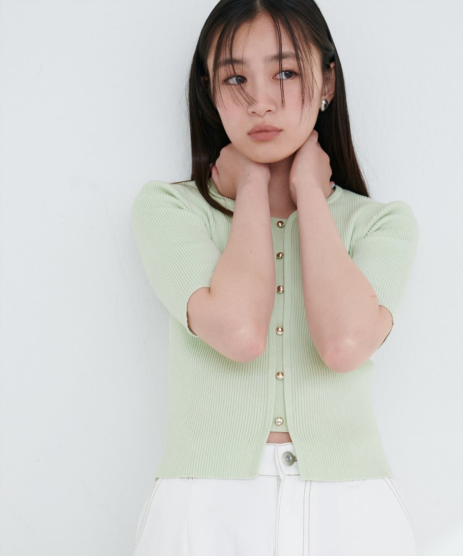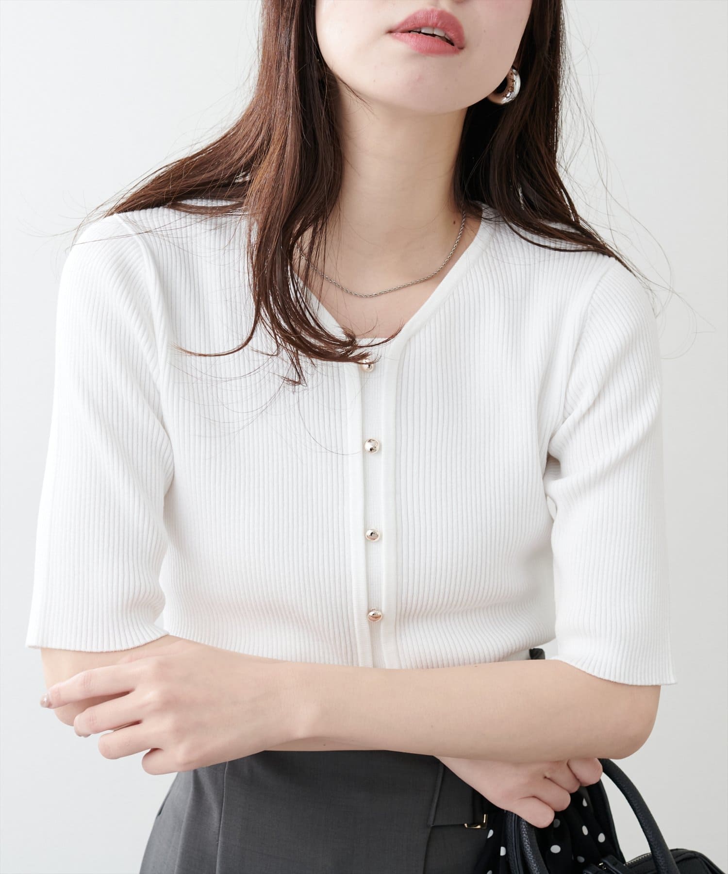 フロントの切り替えでカーディガン風デザインのニットトップス。