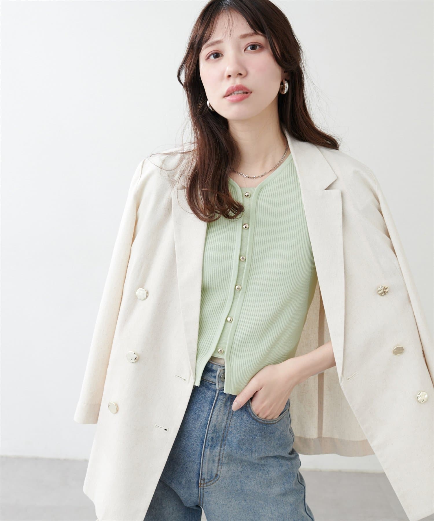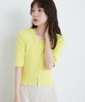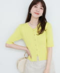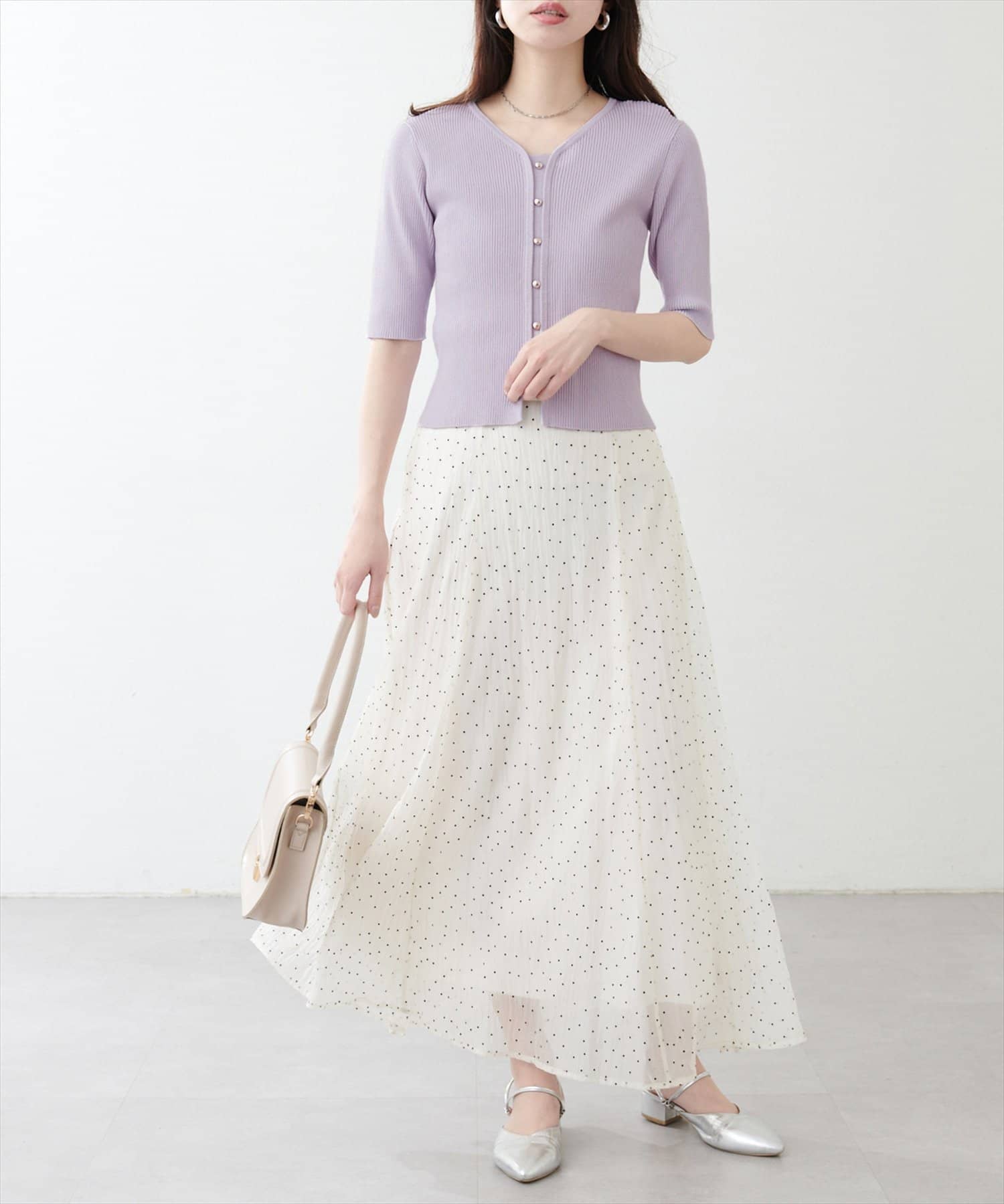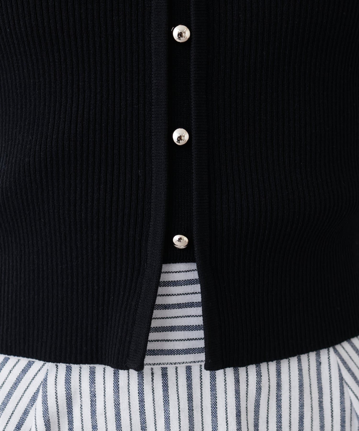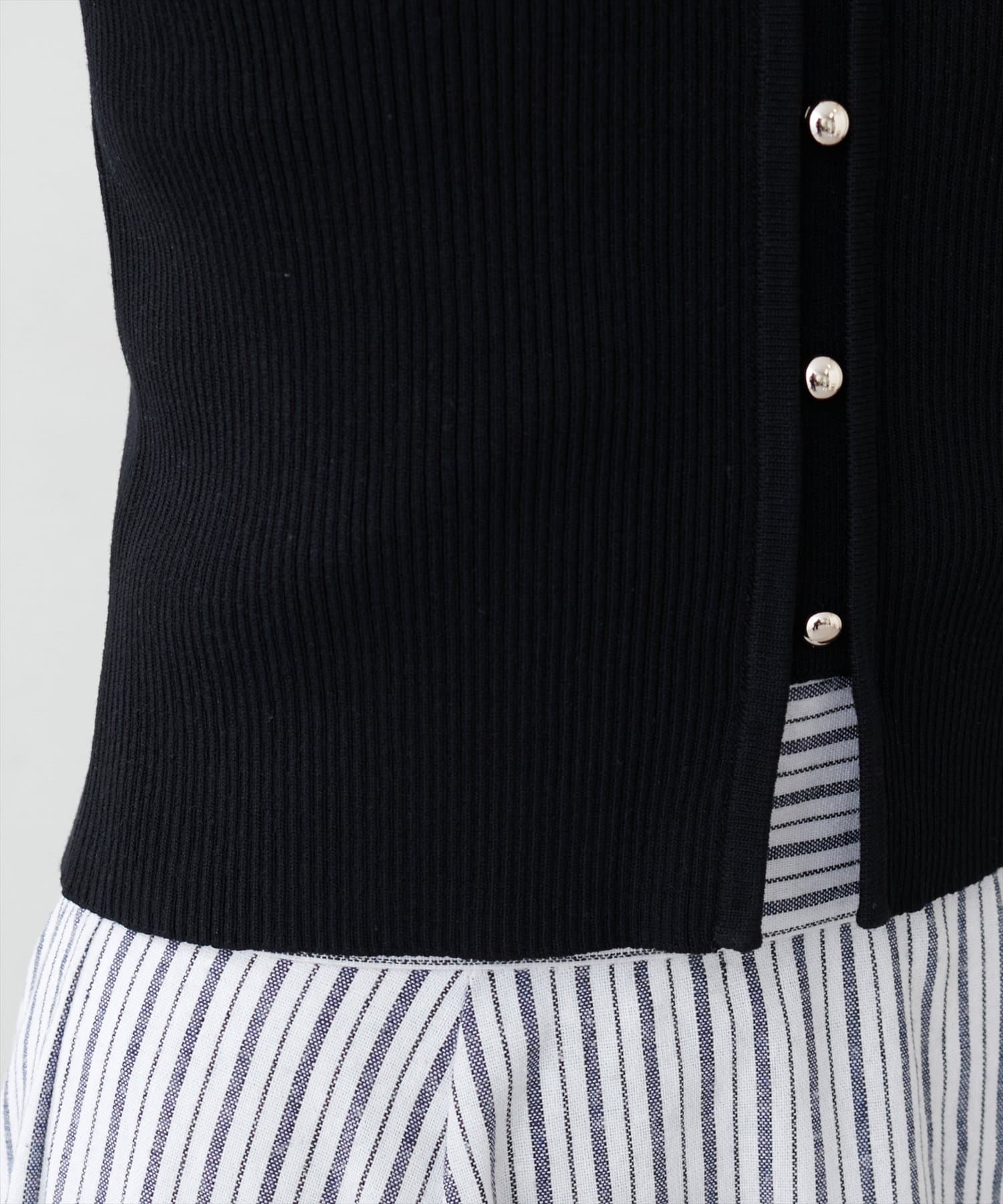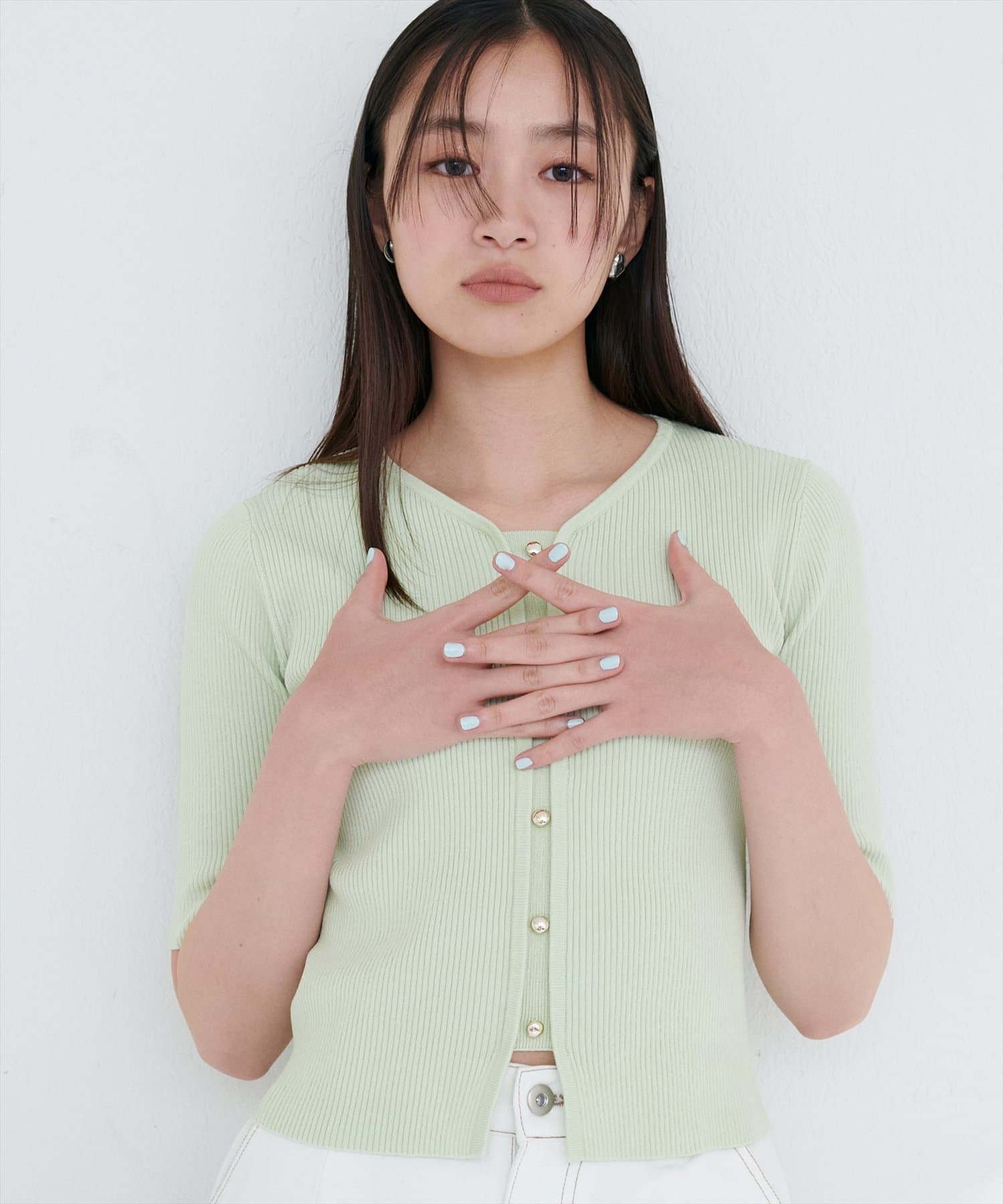 フロントの切り替えでカーディガン風デザインのニットトップス。