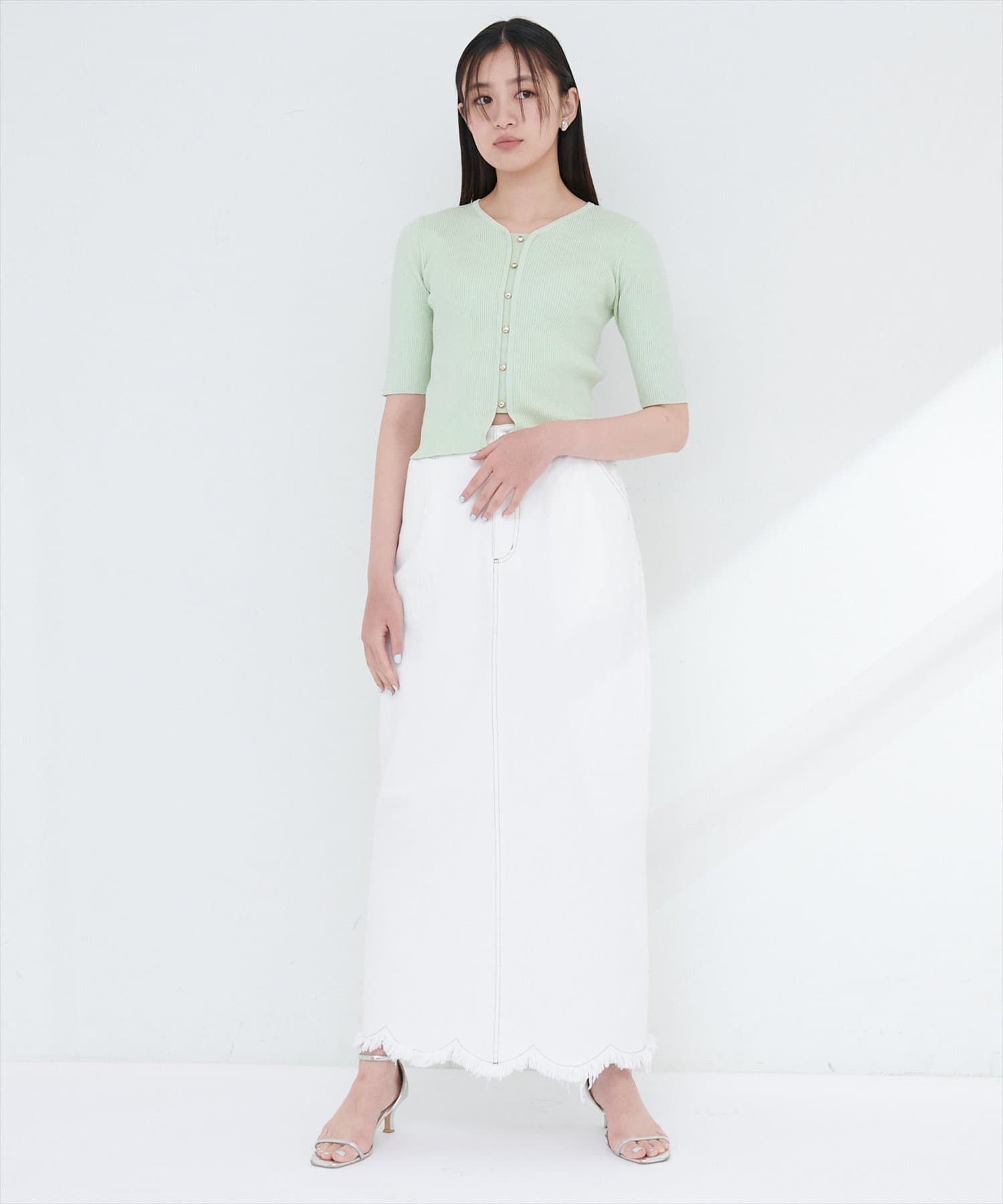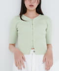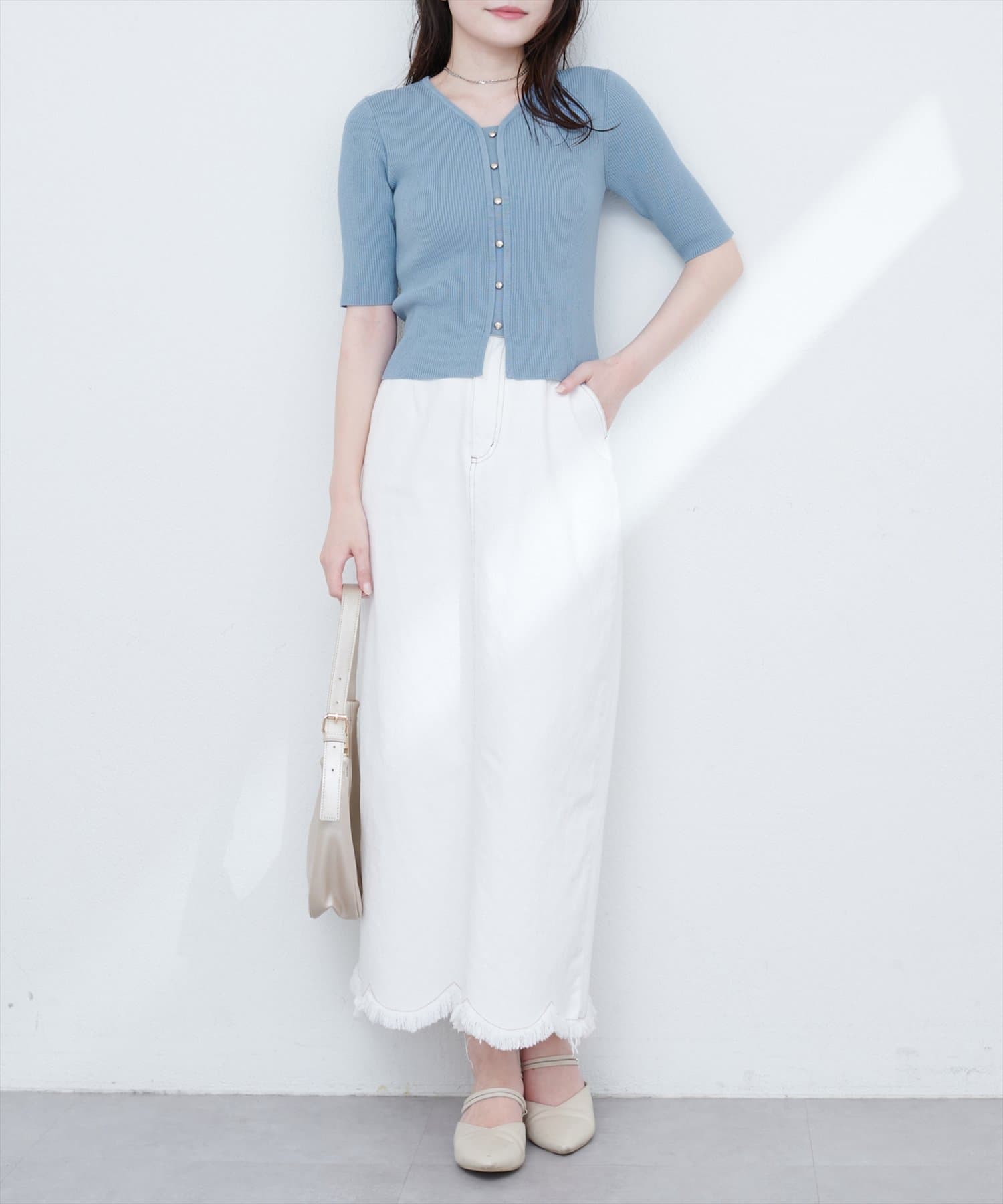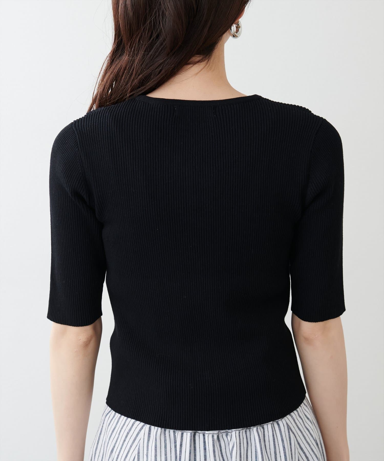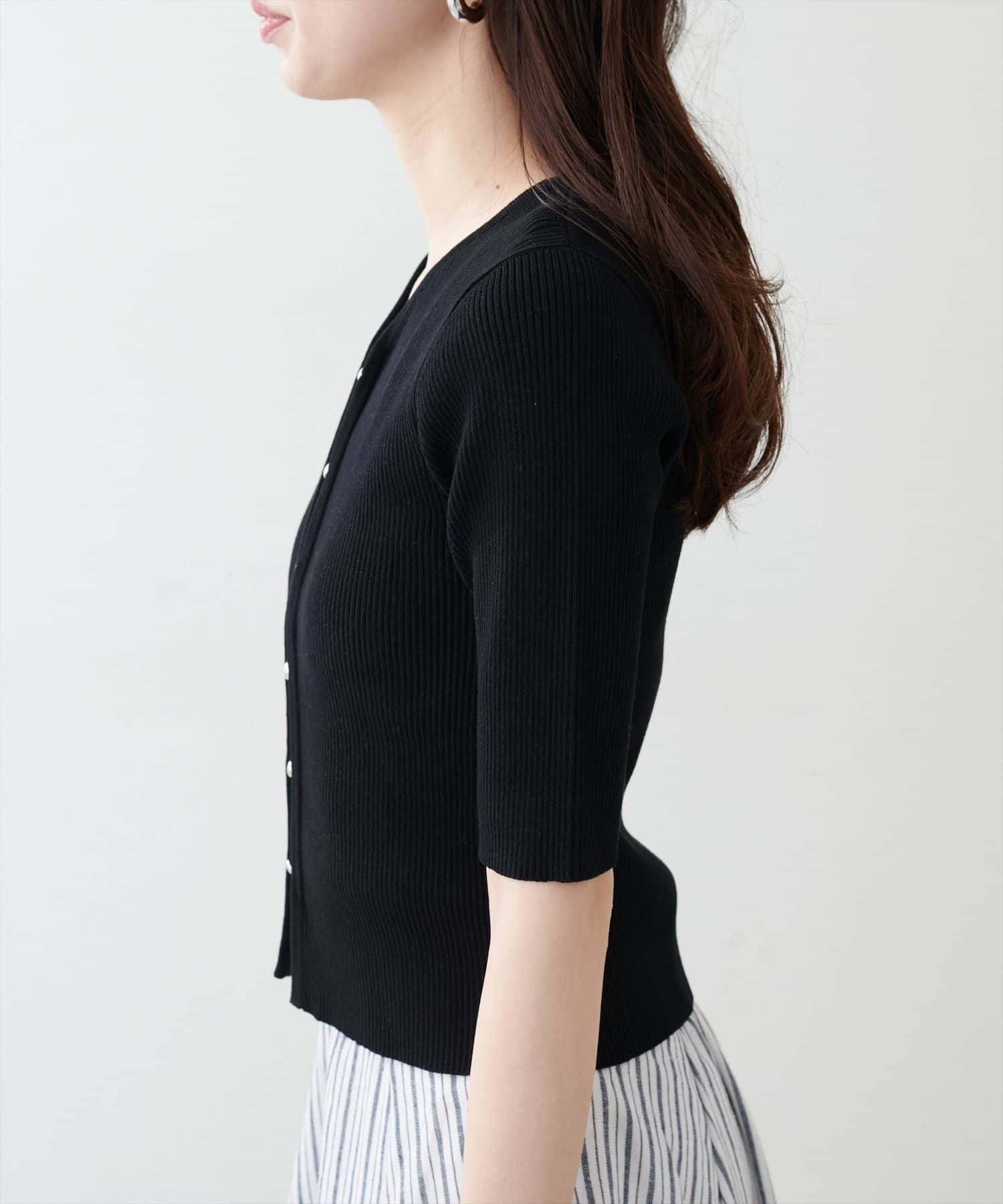 フロントの切り替えでカーディガン風デザインのニットトップス。