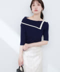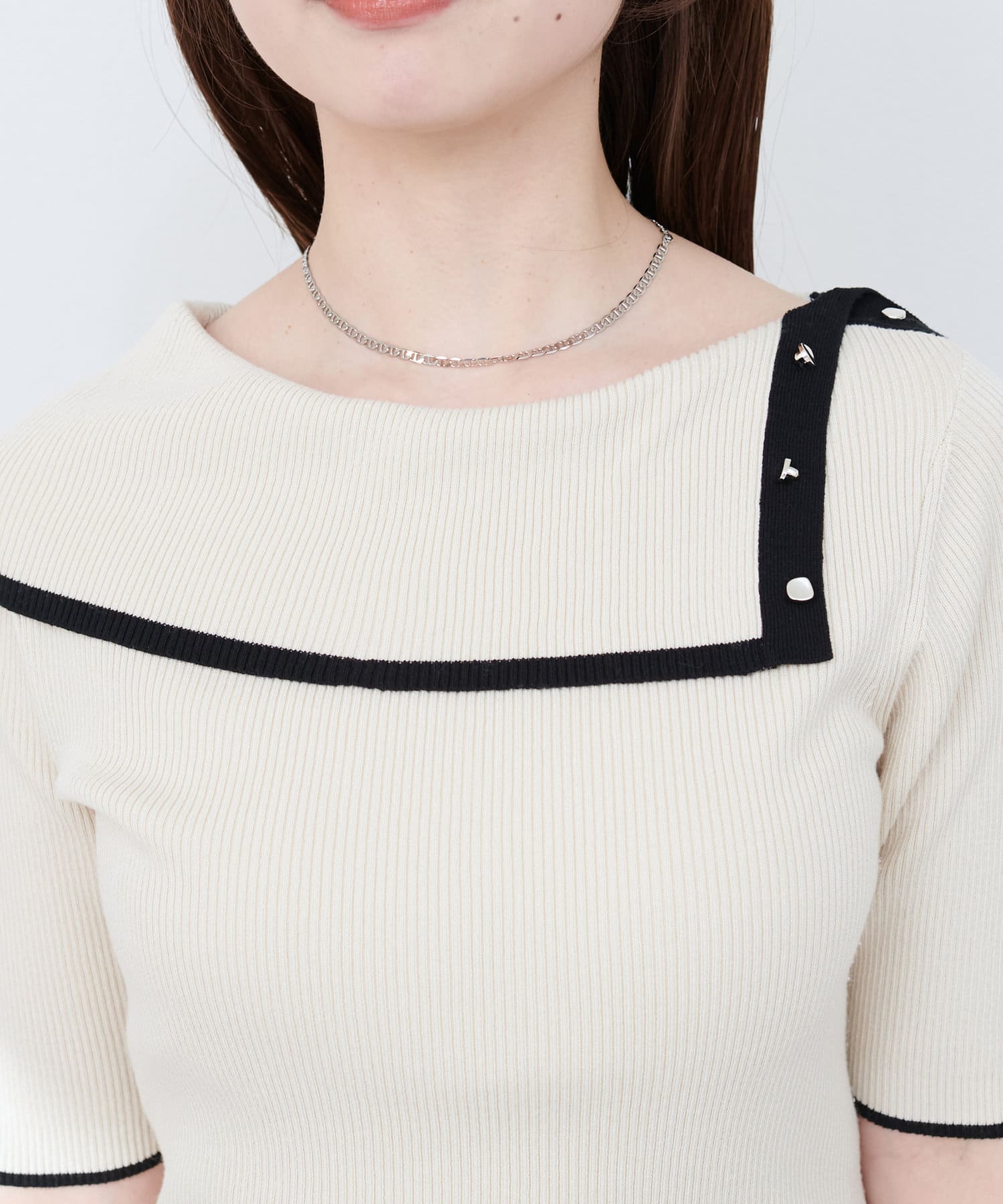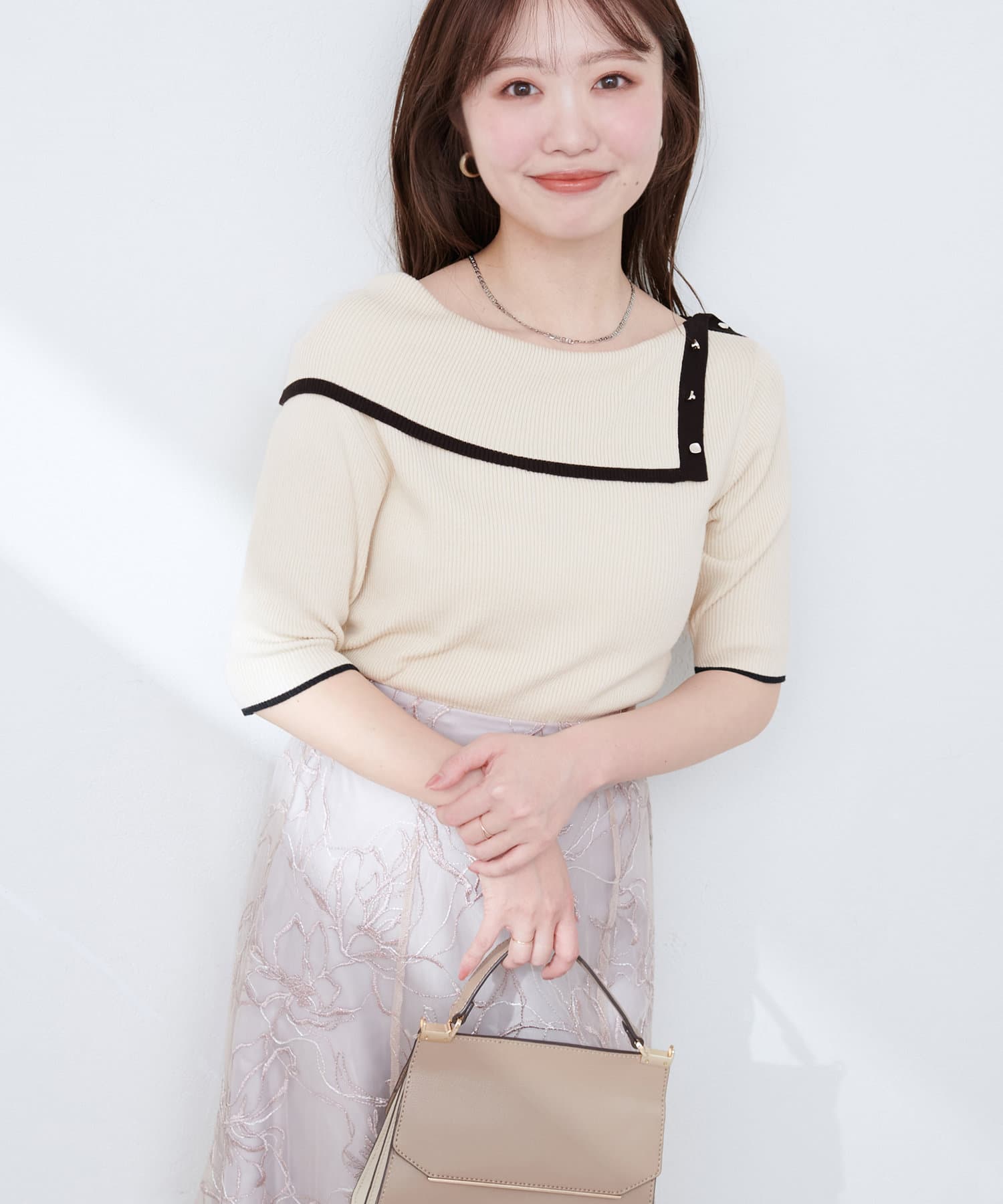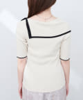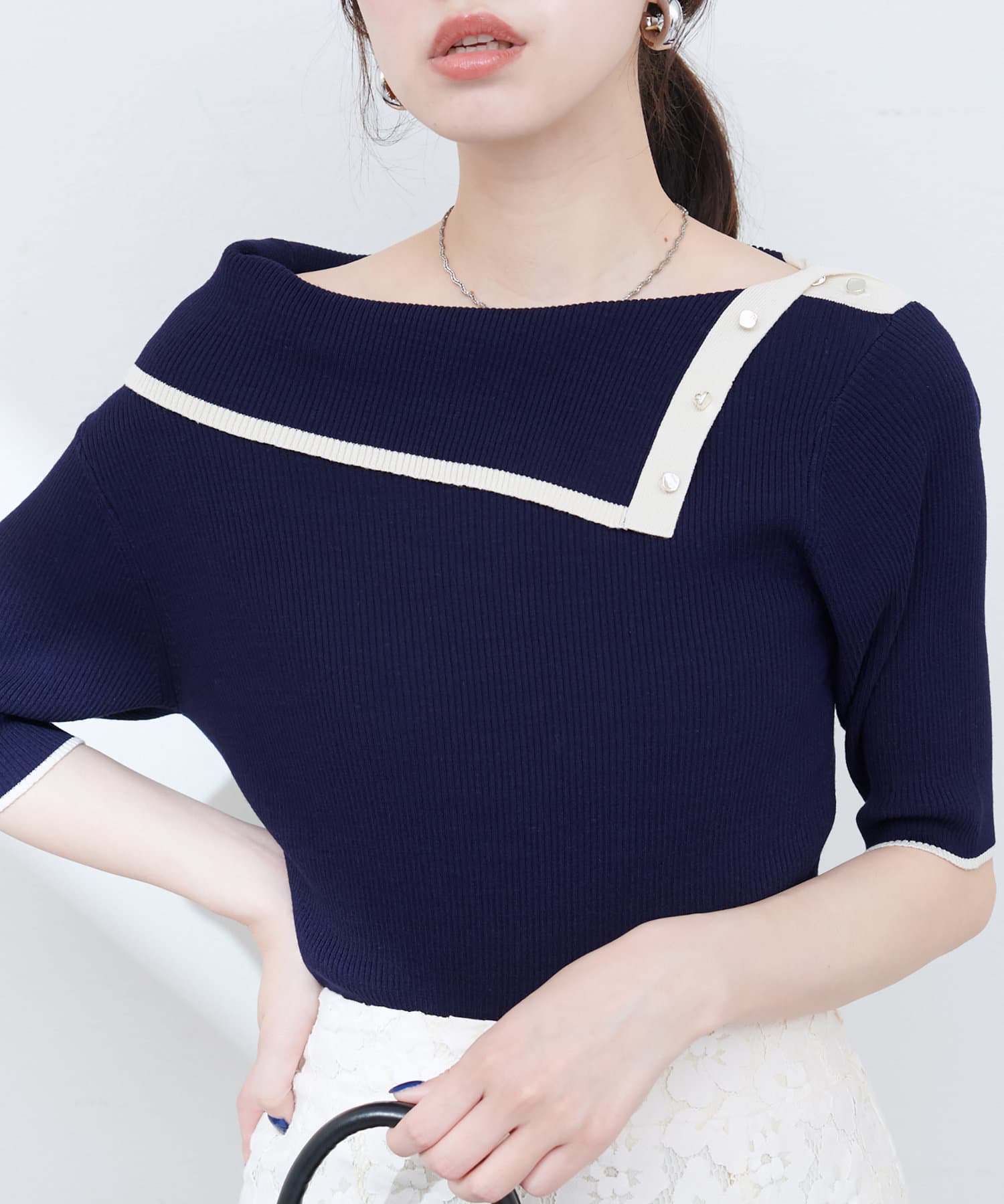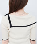 大人の女性らしさを引き立てる、アシメネックデザインのリブニットトップス。