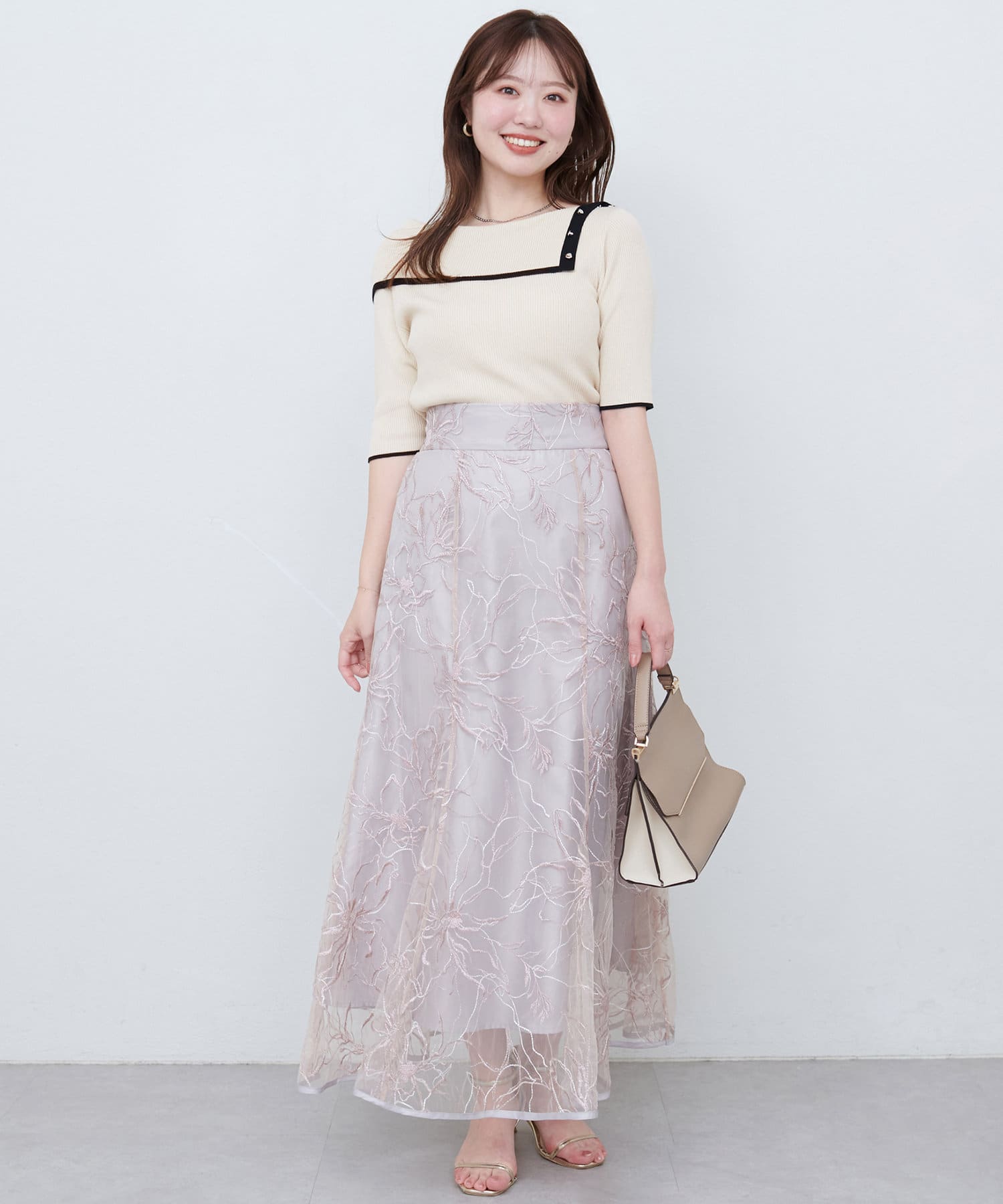 タイトスカートやフレアスカートにトップスをインして、きれいめスタイル。