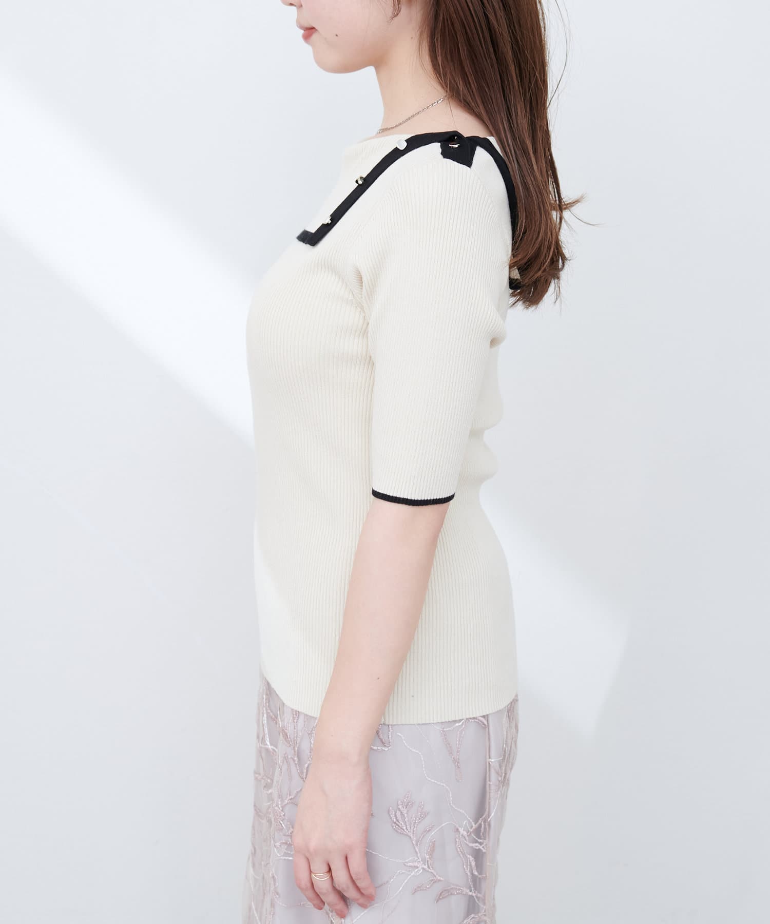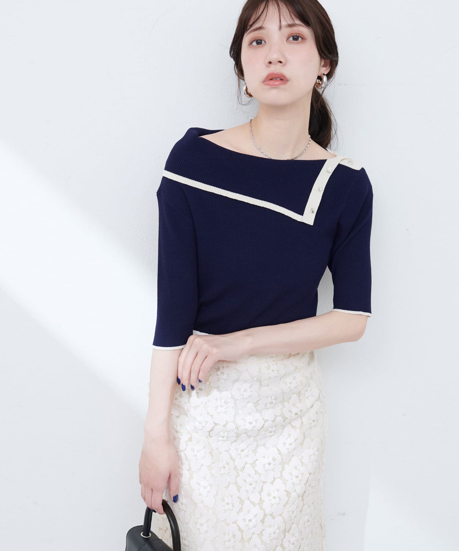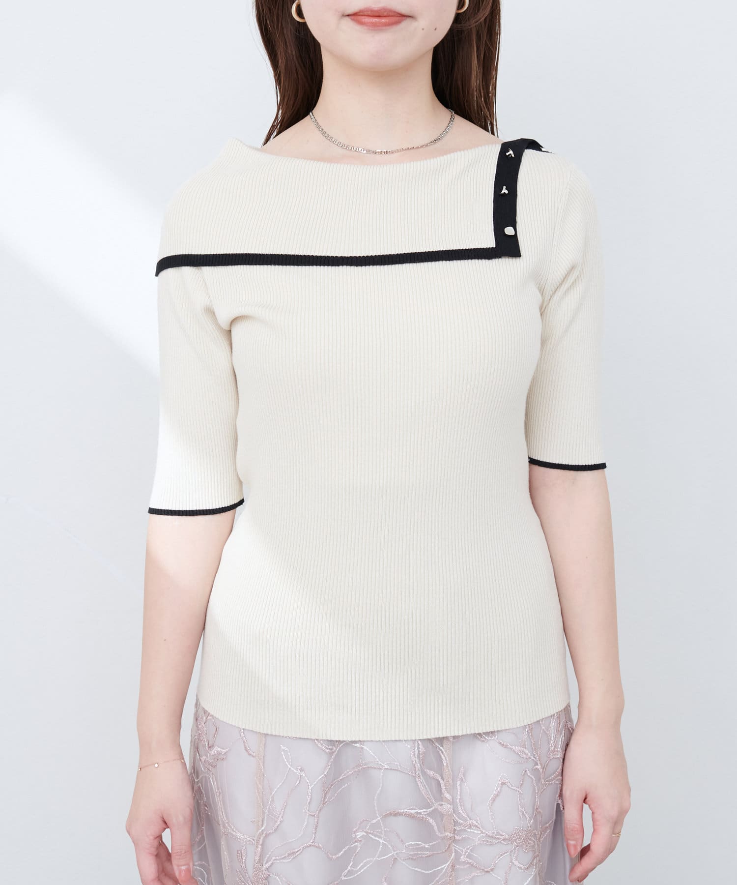 natural couture(ナチュラルクチュール) 【WEB限定】オフショルアシメネックリブニット