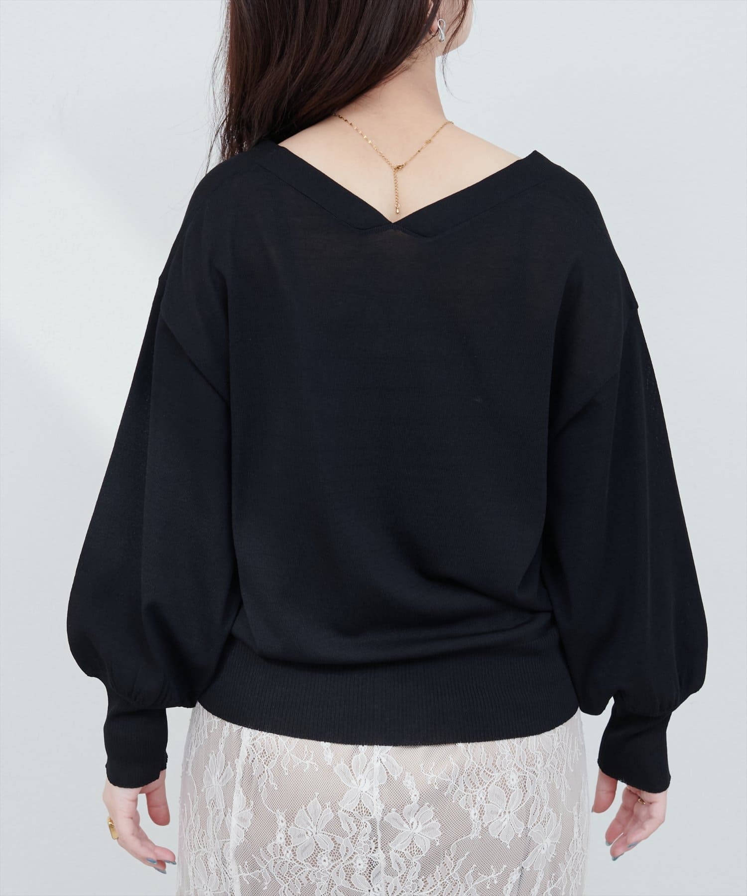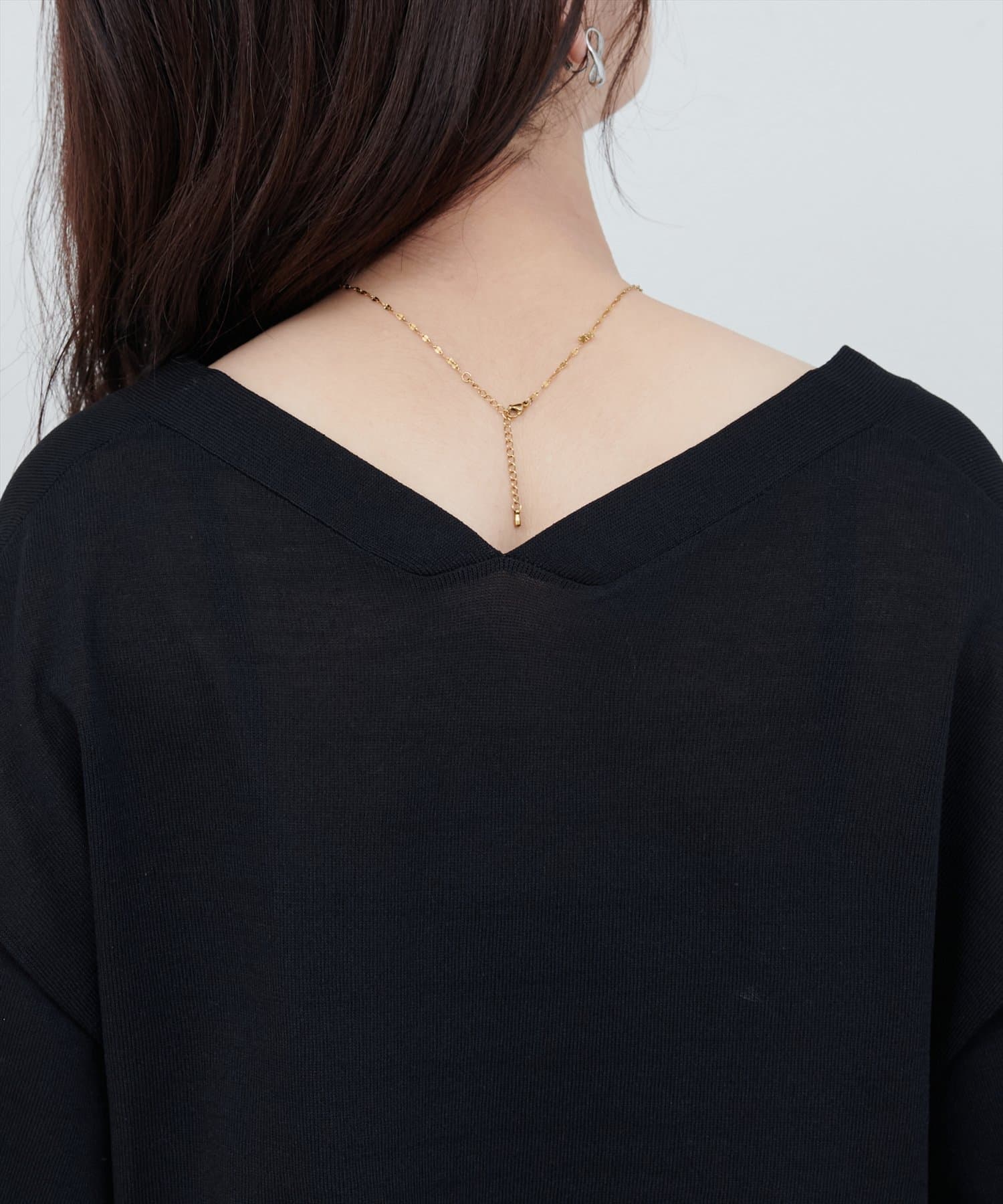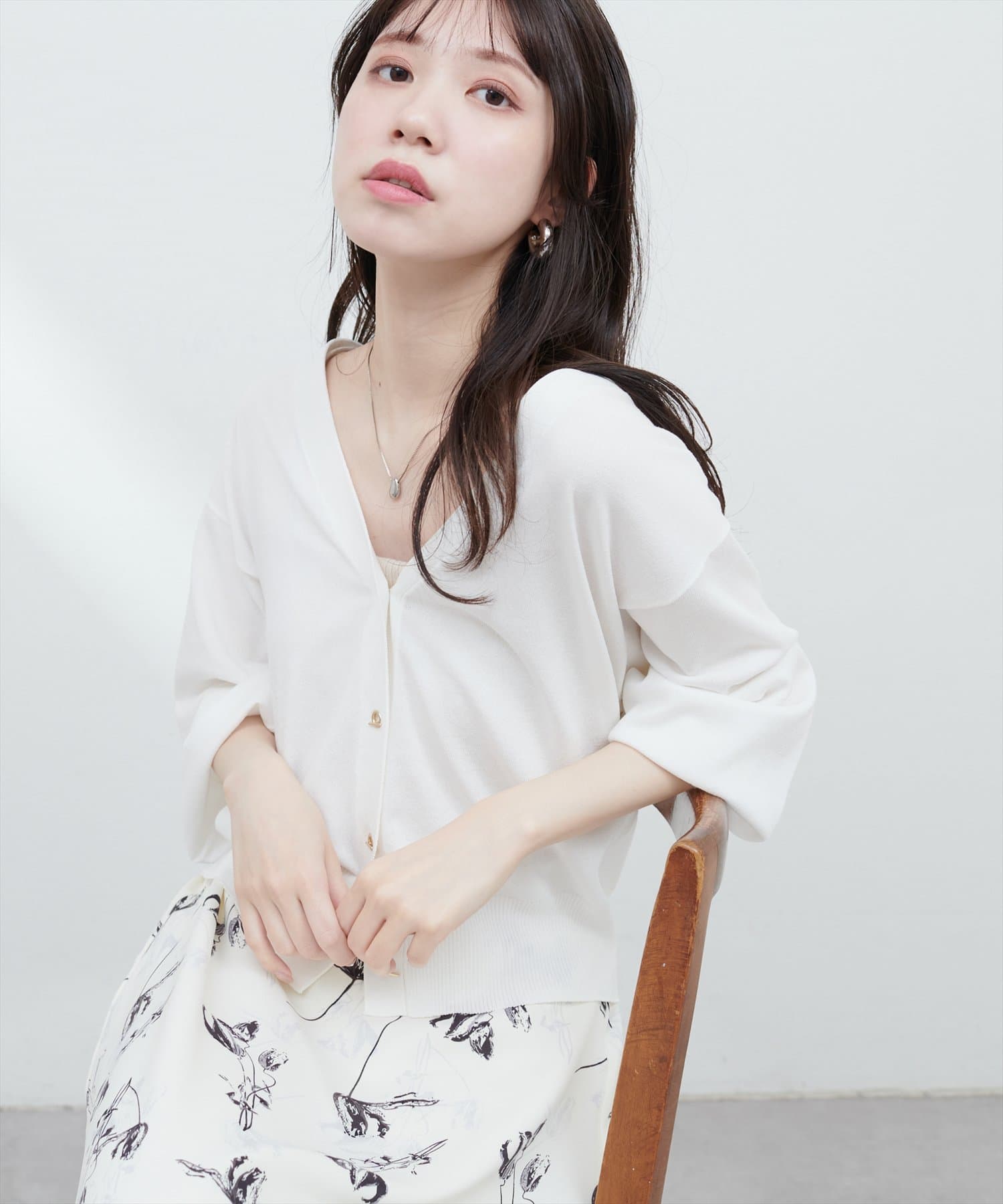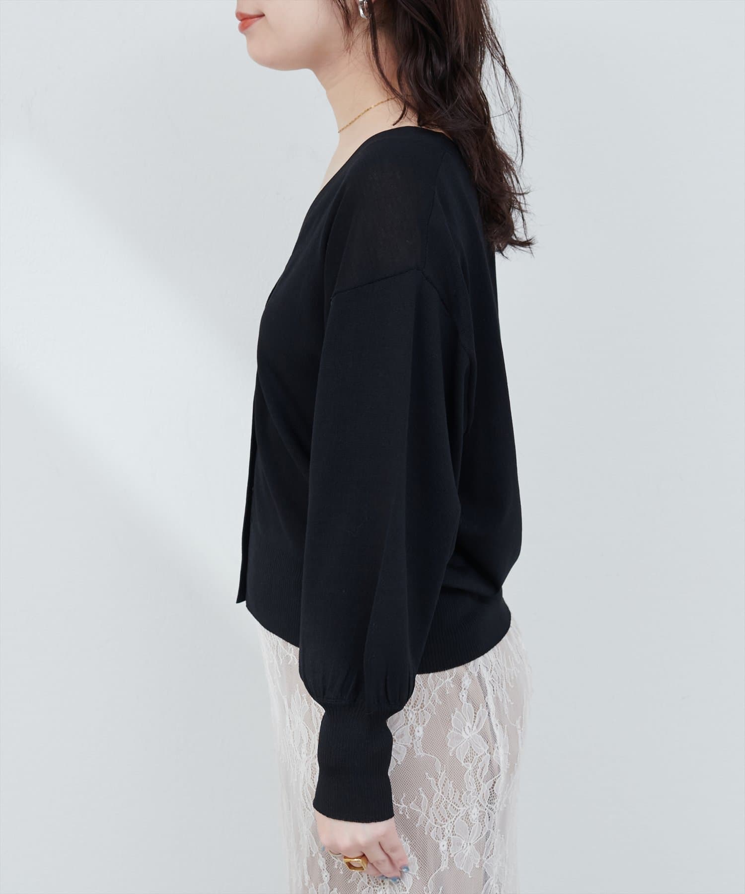 羽織りとしてはもちろん、1枚着のトップスとして後ろに抜いて着るのもおすすめです。