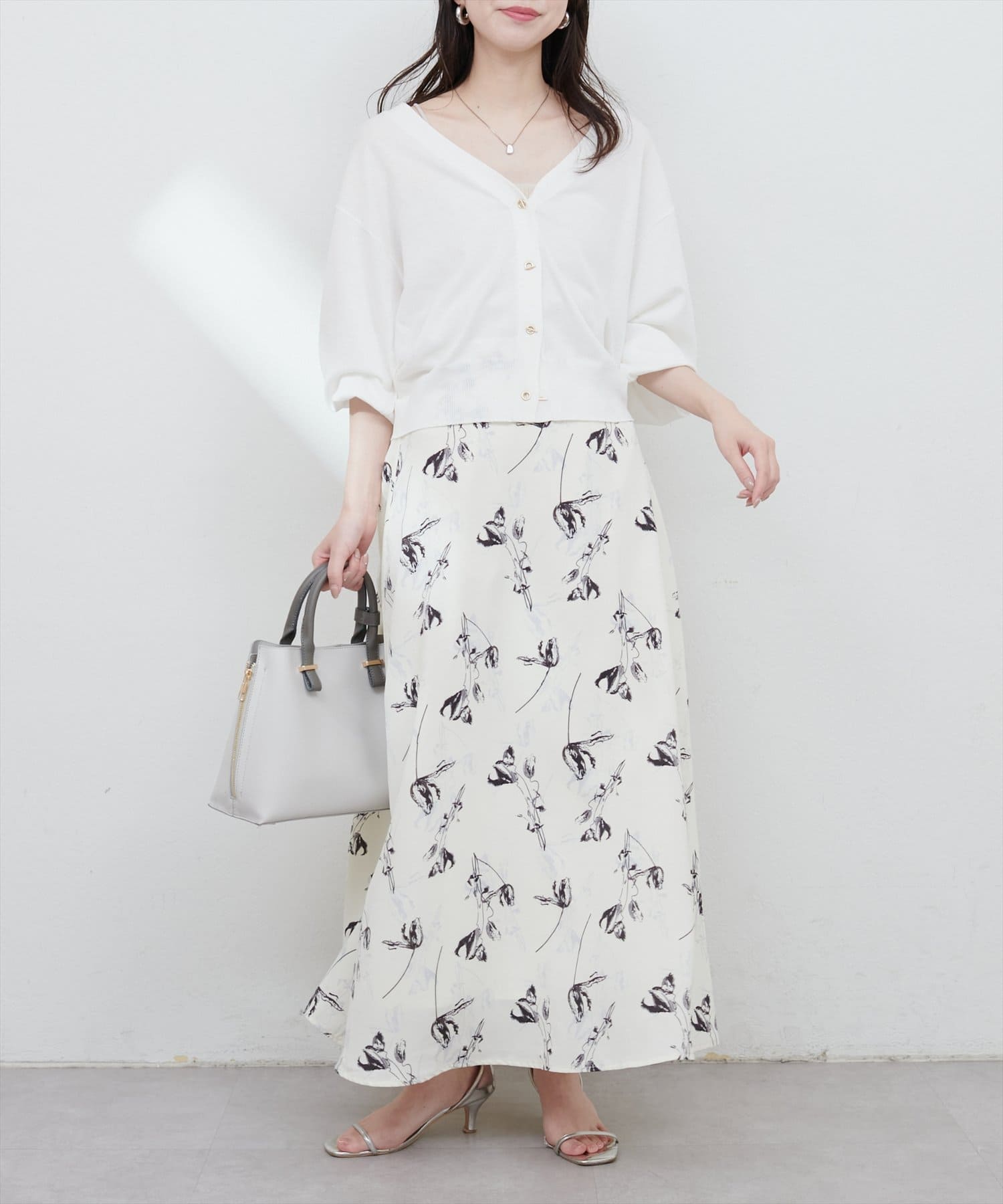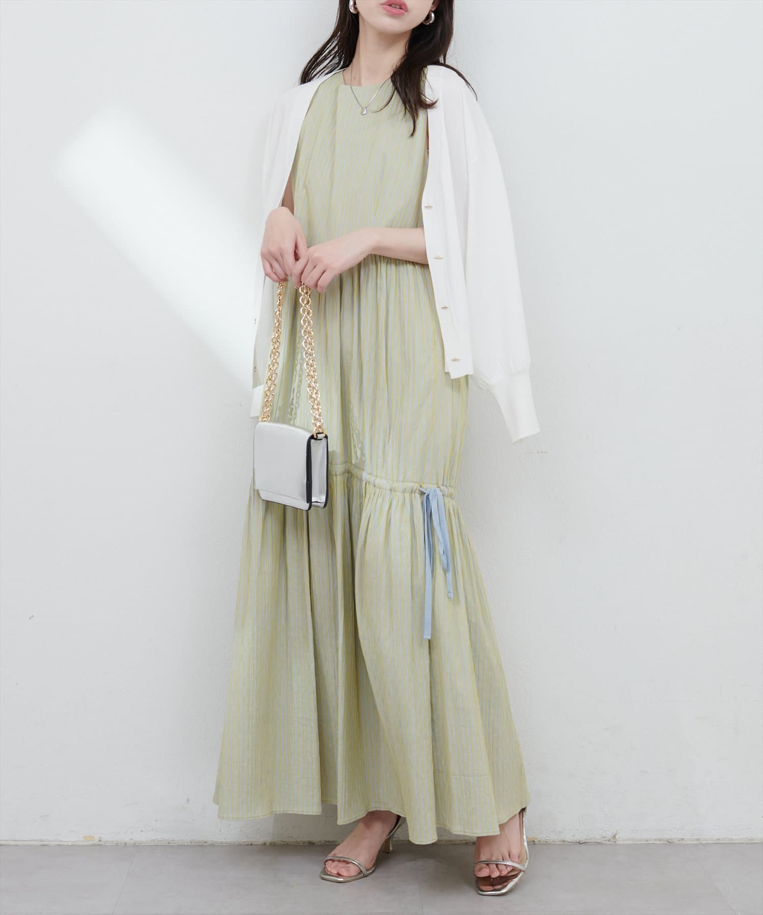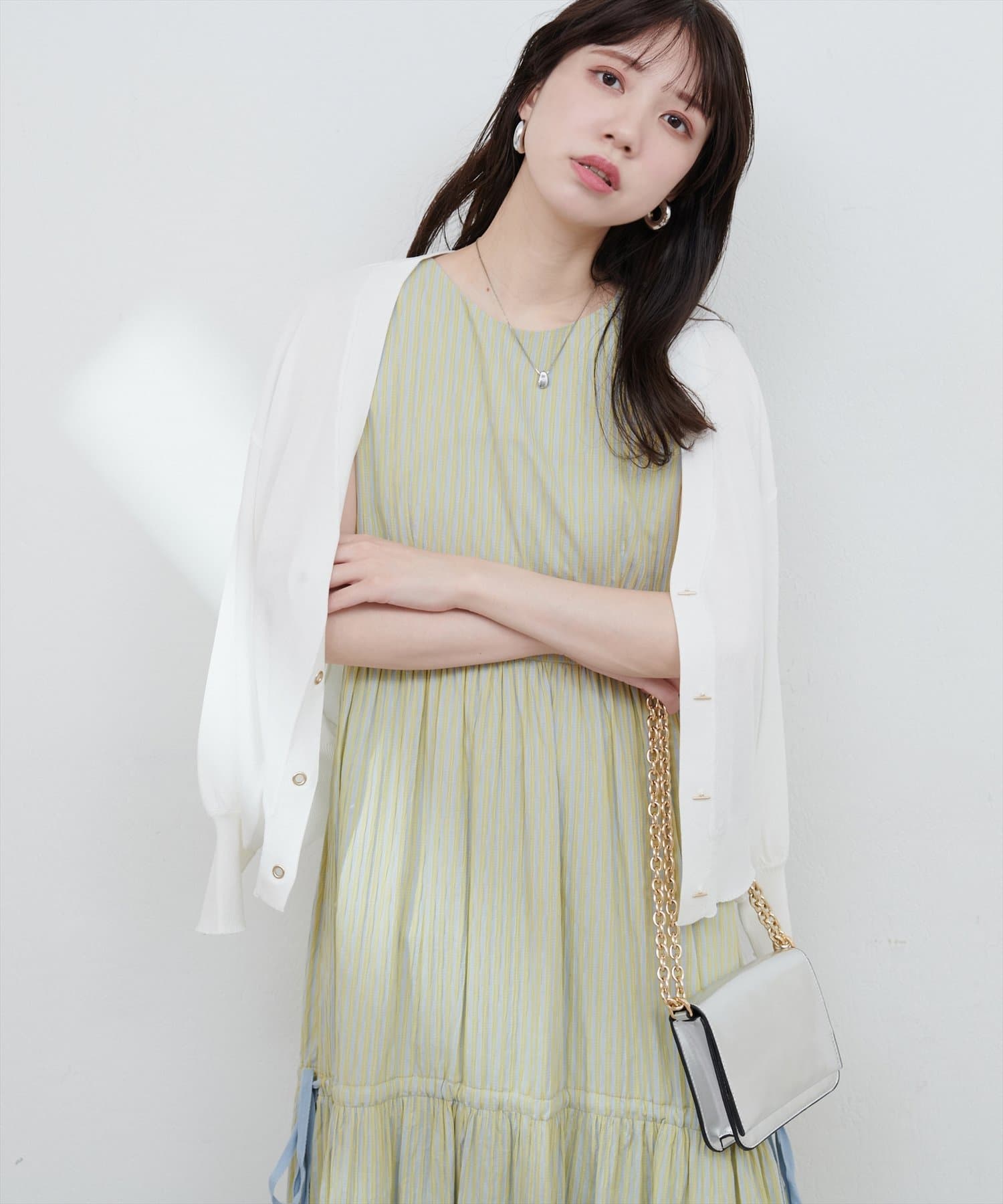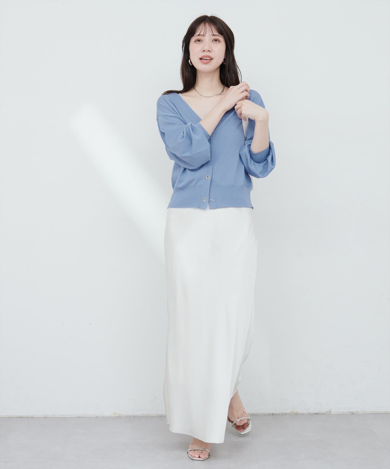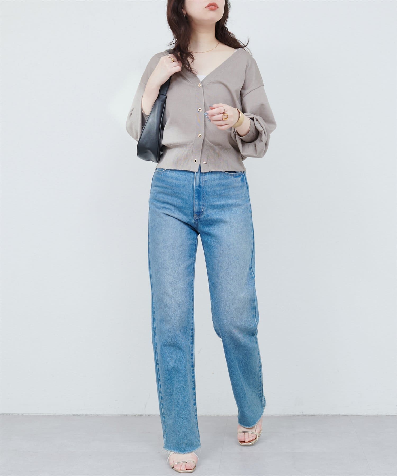 羽織りとしてはもちろん、1枚着のトップスとして後ろに抜いて着るのもおすすめです。
