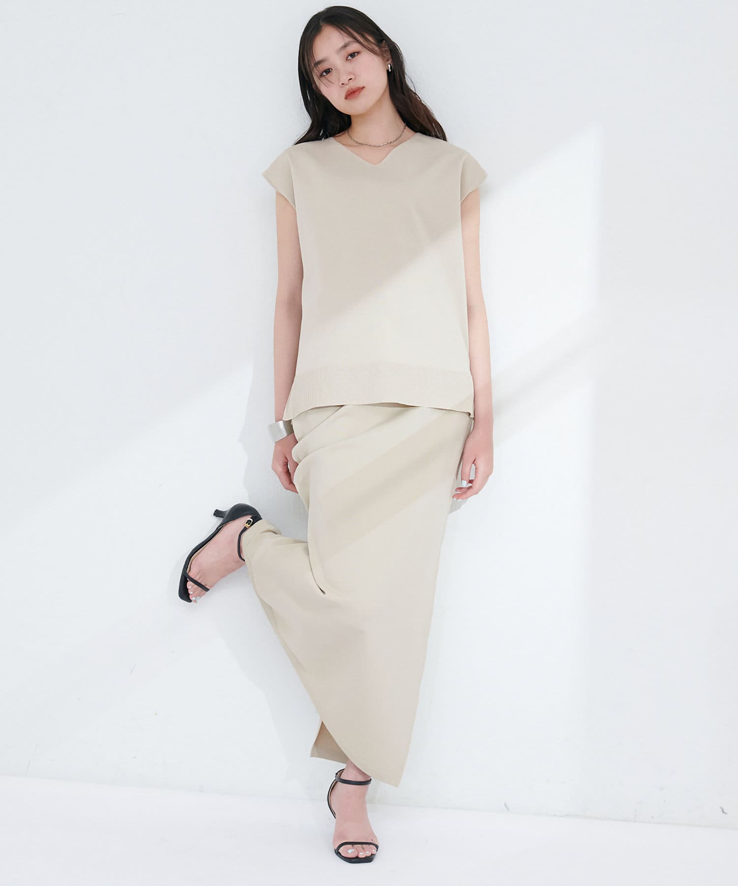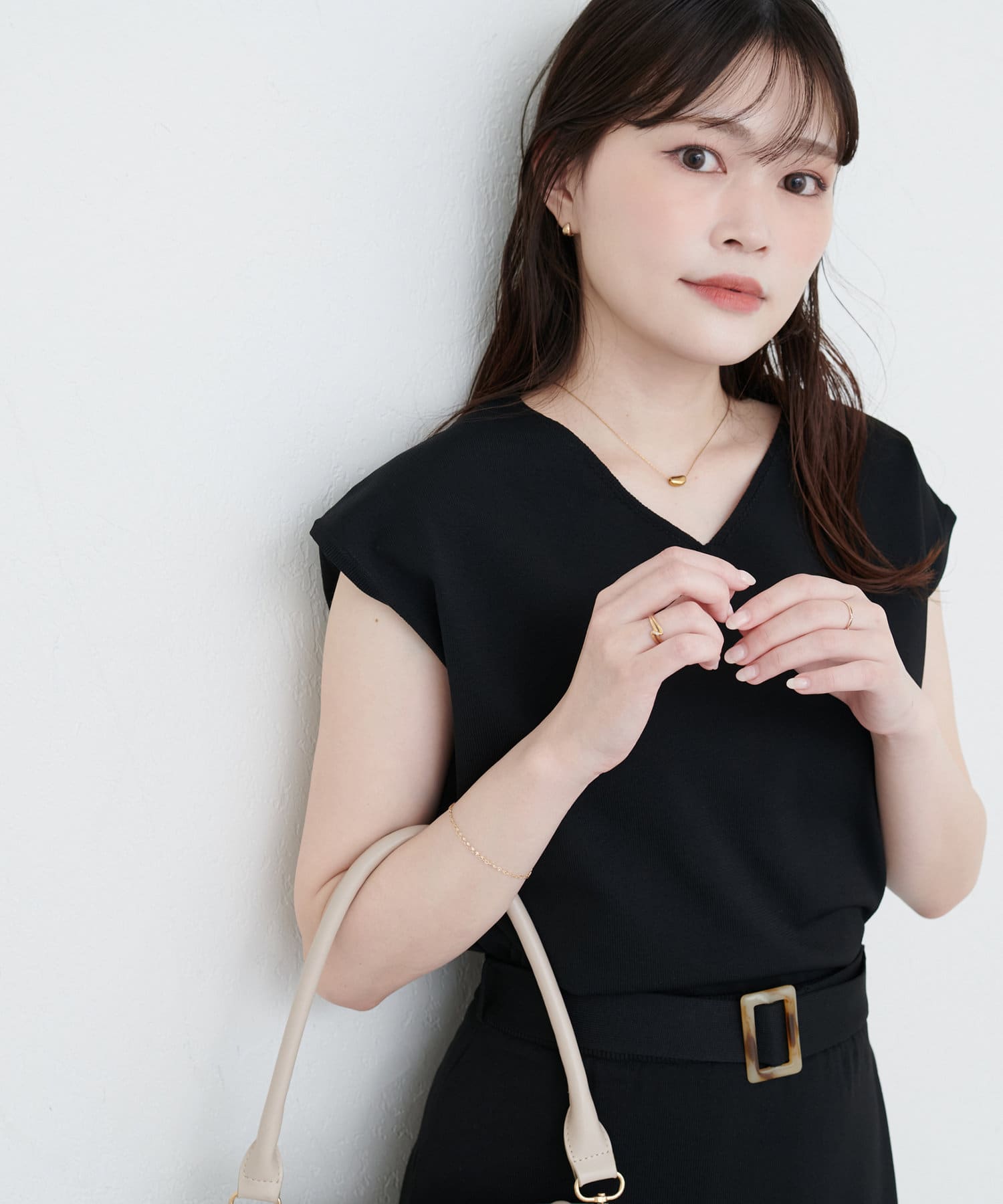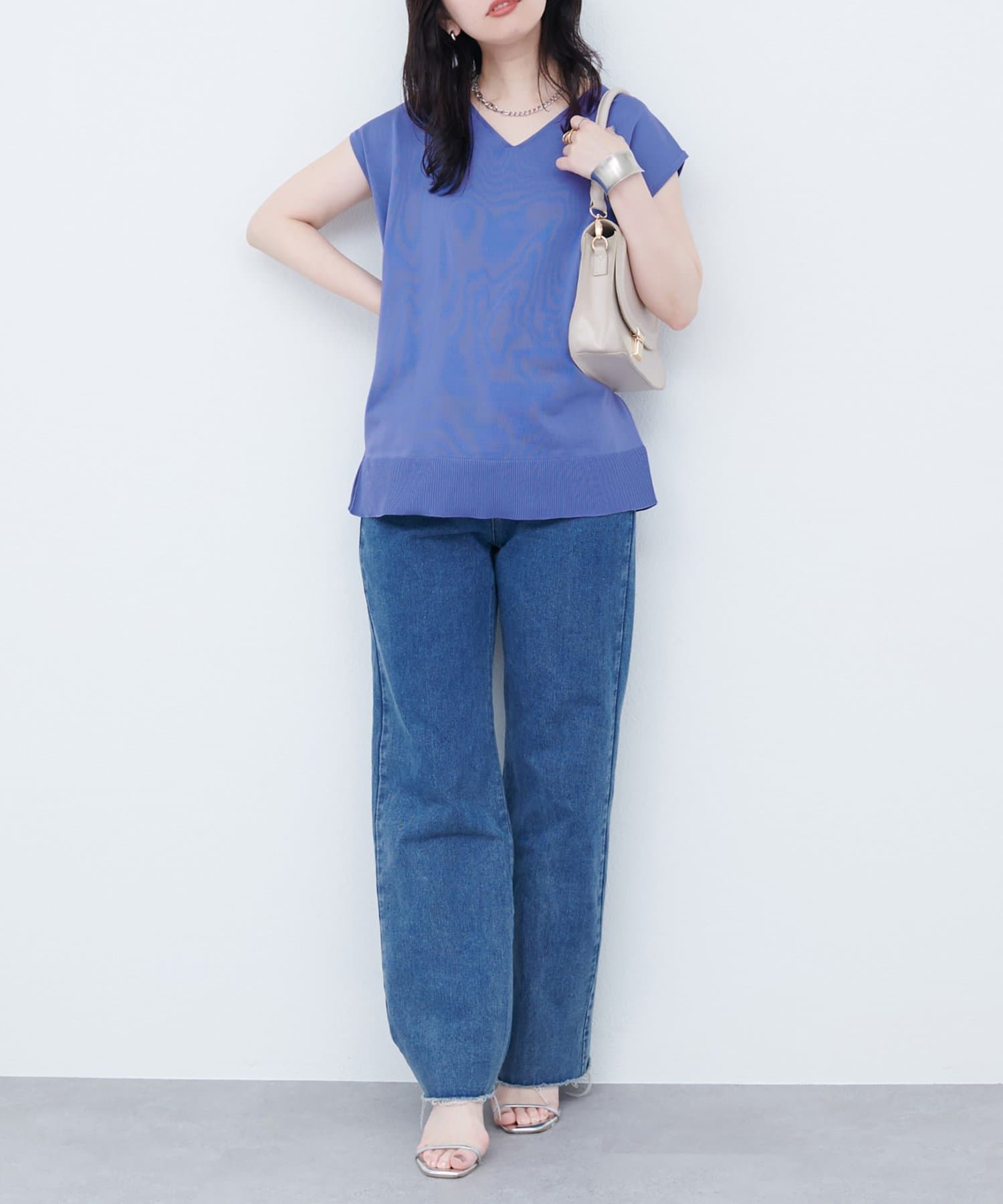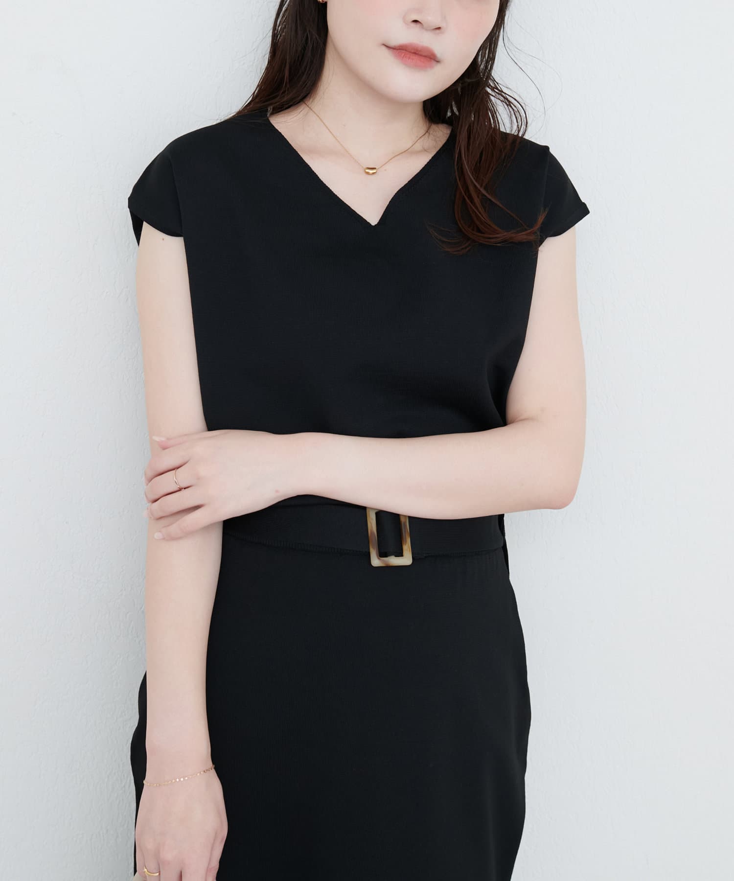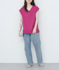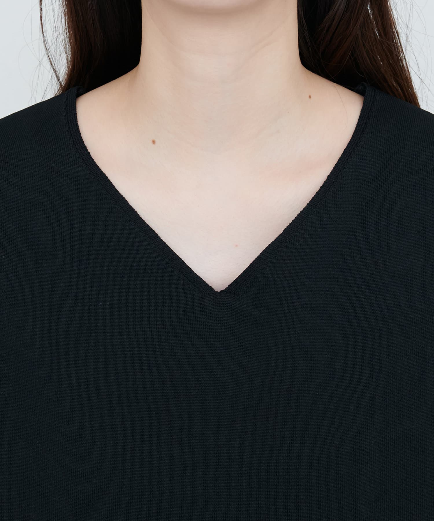 デコルテを美しく見せるVネックラインは、顔周りをすっきりとシャープな印象に。
