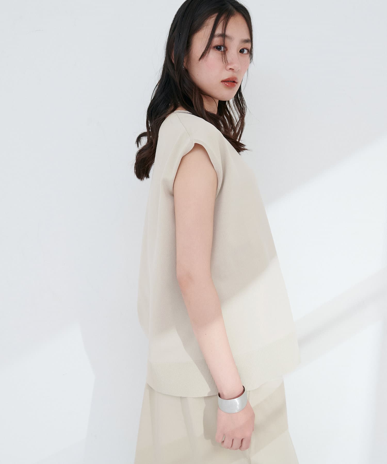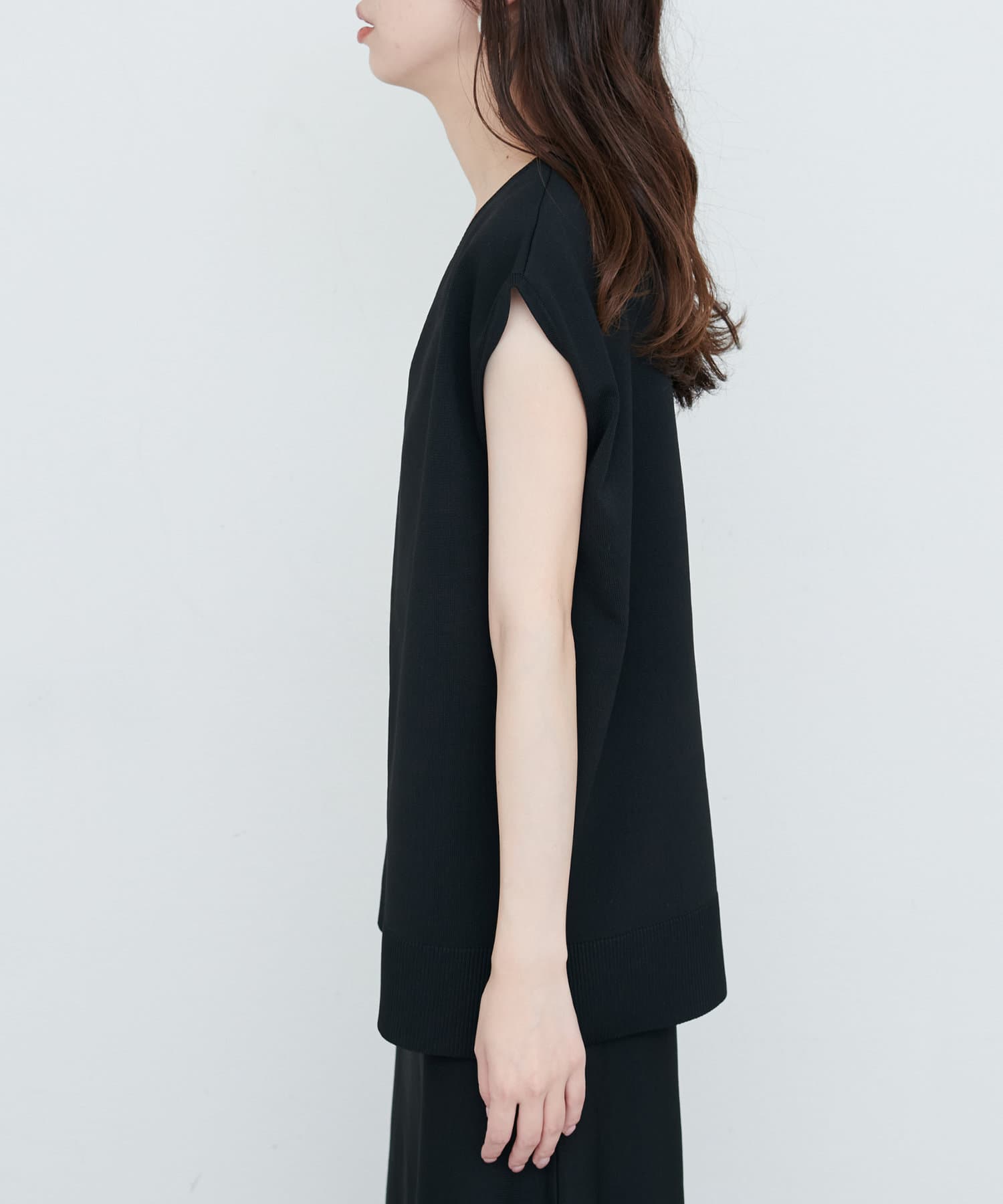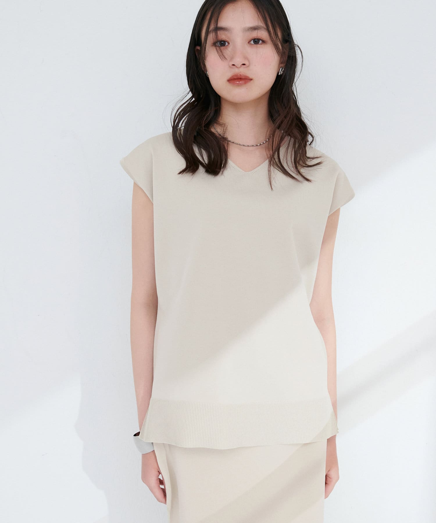 シンプルなデザインの中に、女性らしさと上品さを兼ね備えたVネックノースリーブニット。