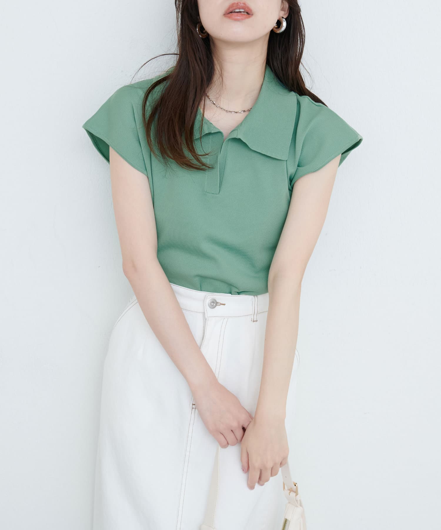 都会的で洗練された印象を与える、襟付きニットポロトップス。