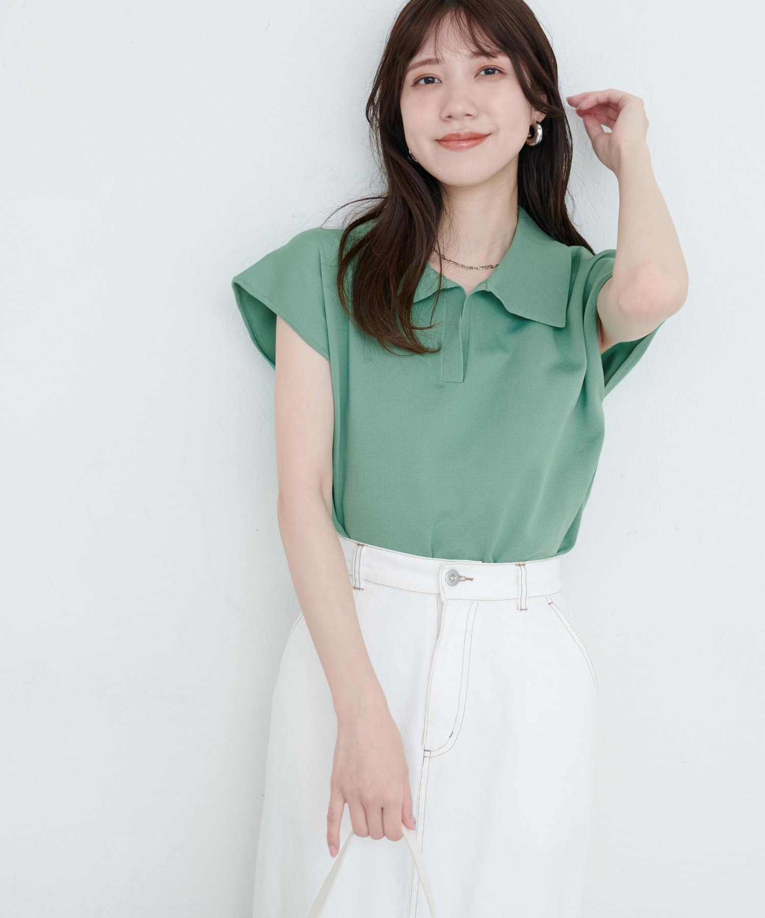 フレアスカートやテーパードパンツと合わせて、オフィスにも対応できるきれいめスタイルに。