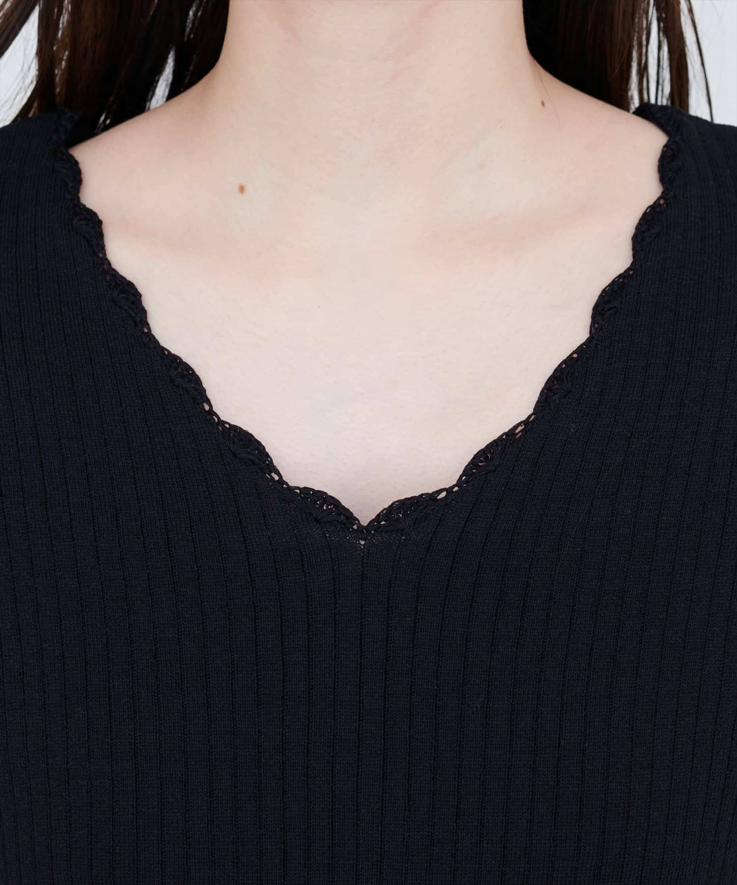 シンプルなリブニットの衿ぐりと、袖口にかぎ針風のちびスカラップを入れました。