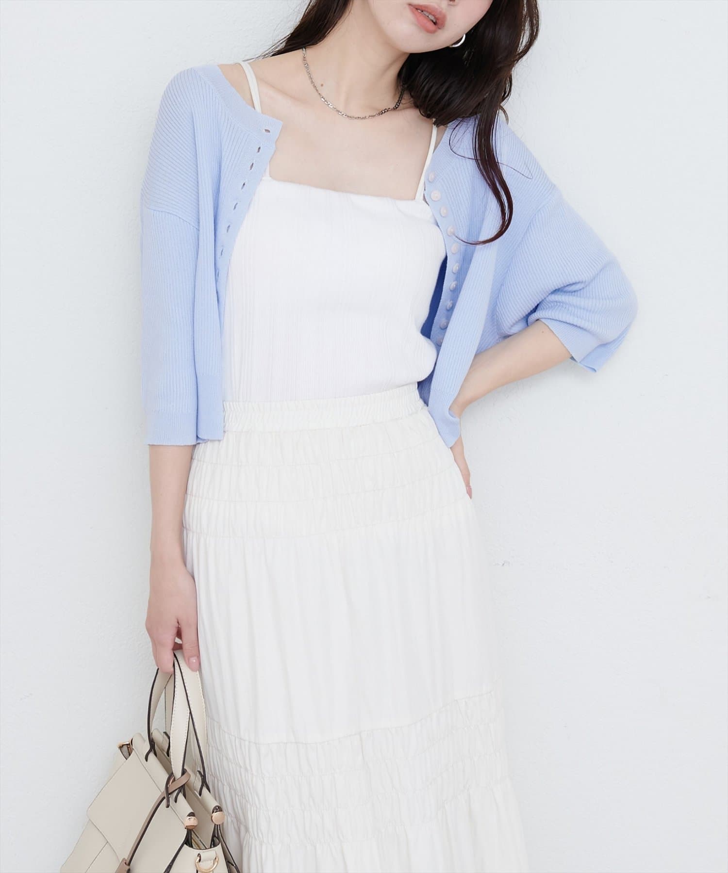 ワンピースやカットソーの上から羽織ればレイヤードスタイルもお楽しみいただけます。