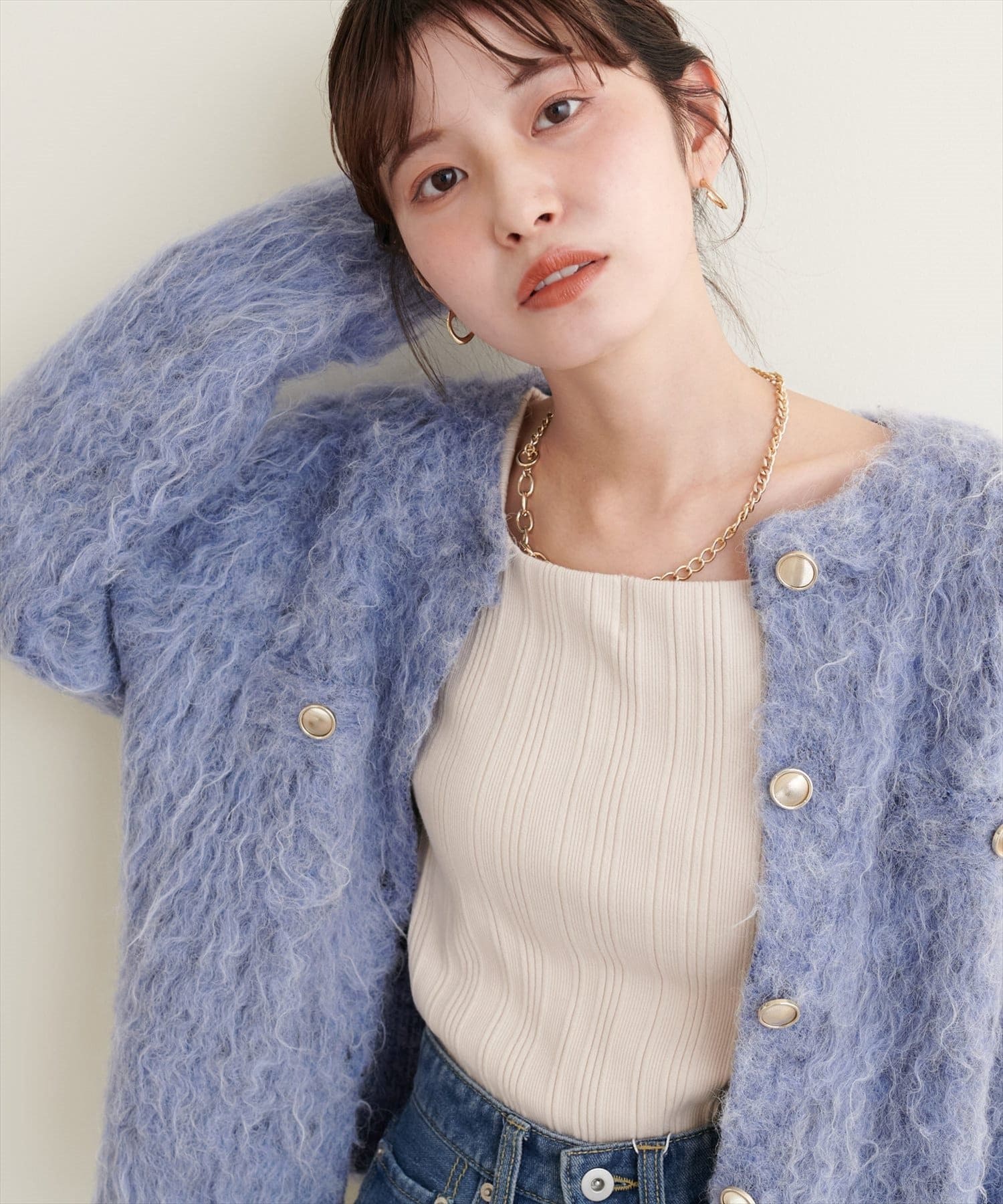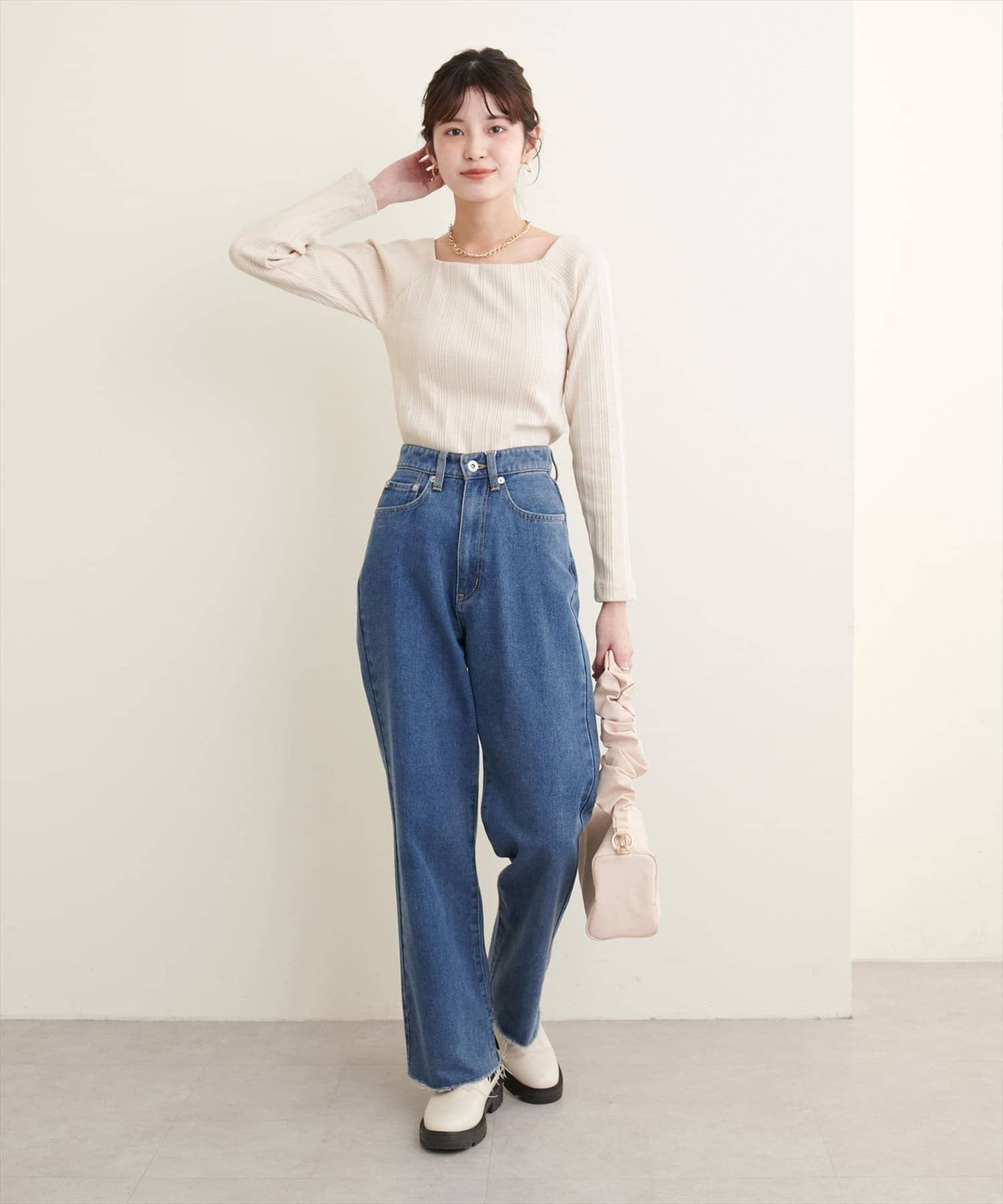 単色ですが模様のようにランダムな太さのリブが入っているので、ボシンプルなボトムでも決まります。