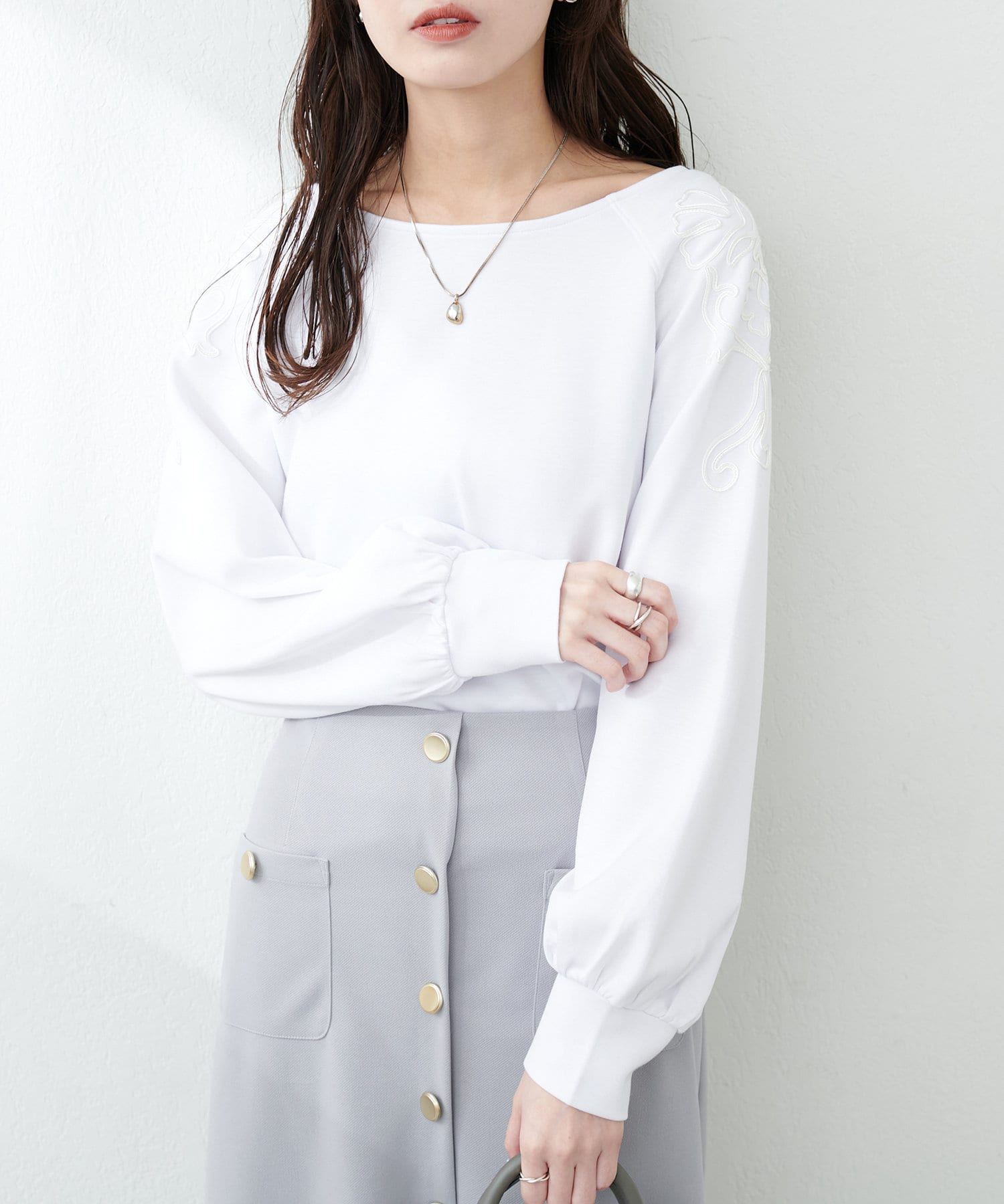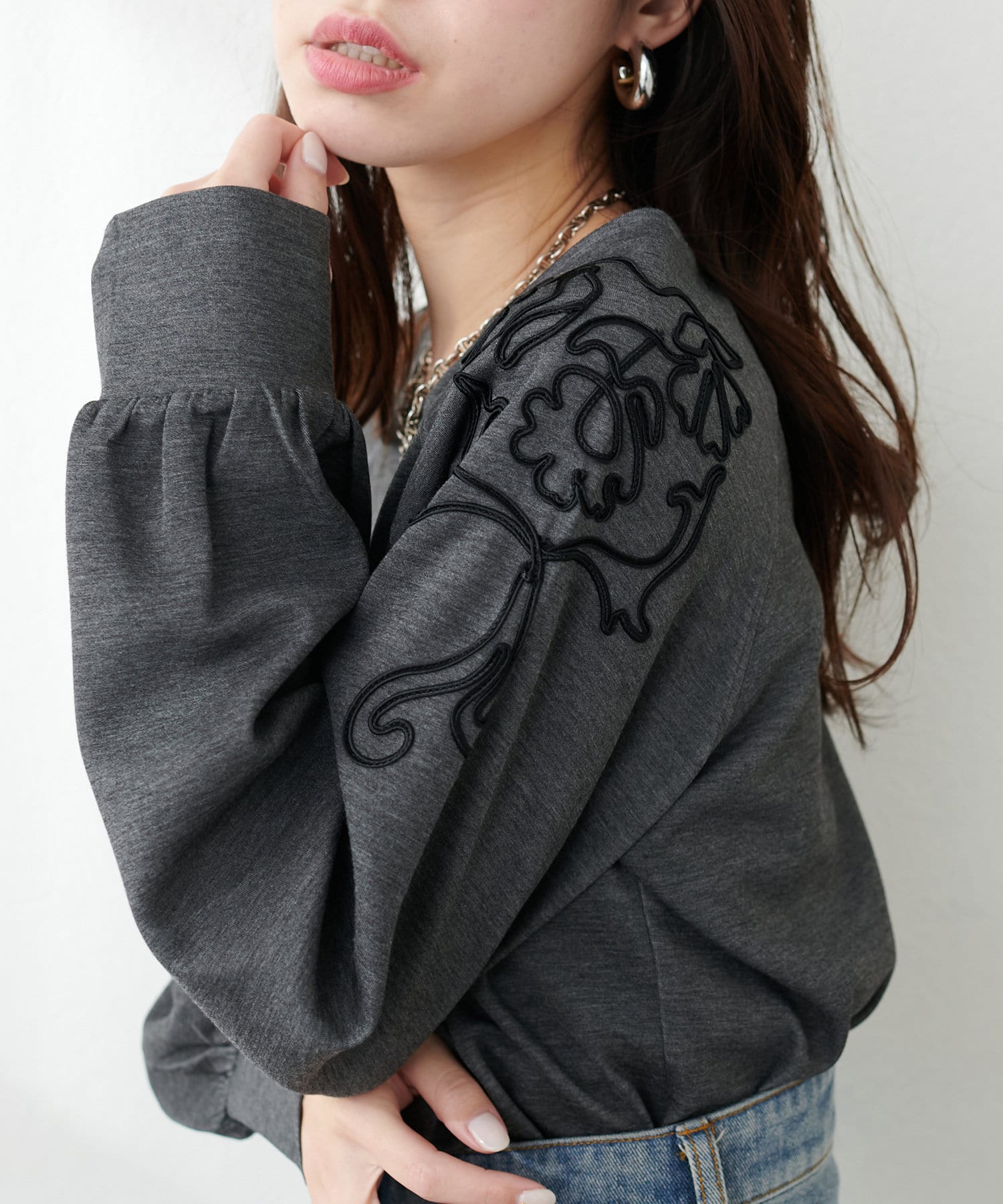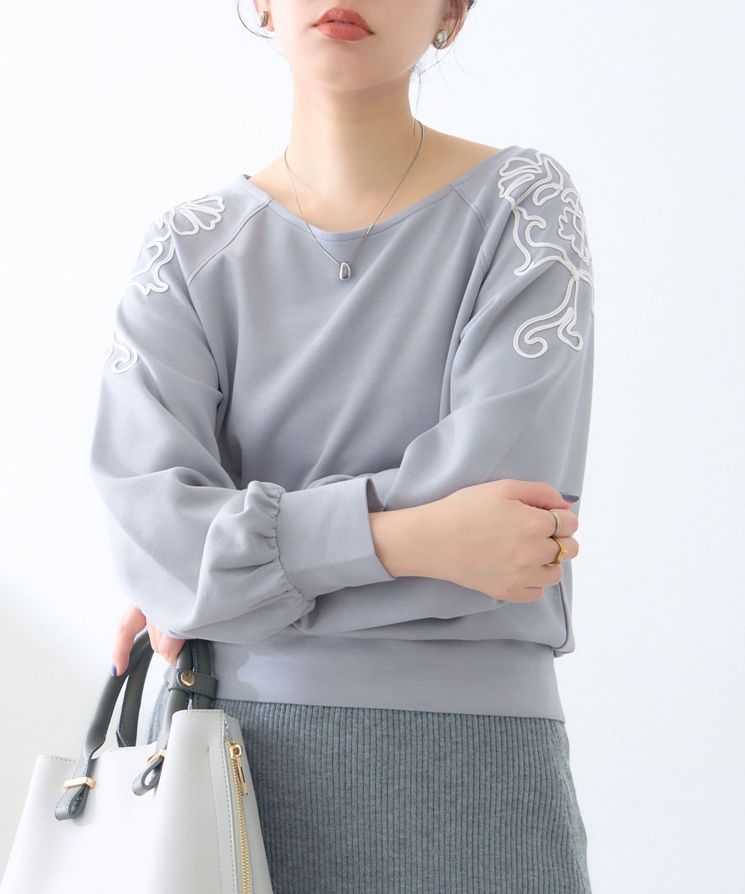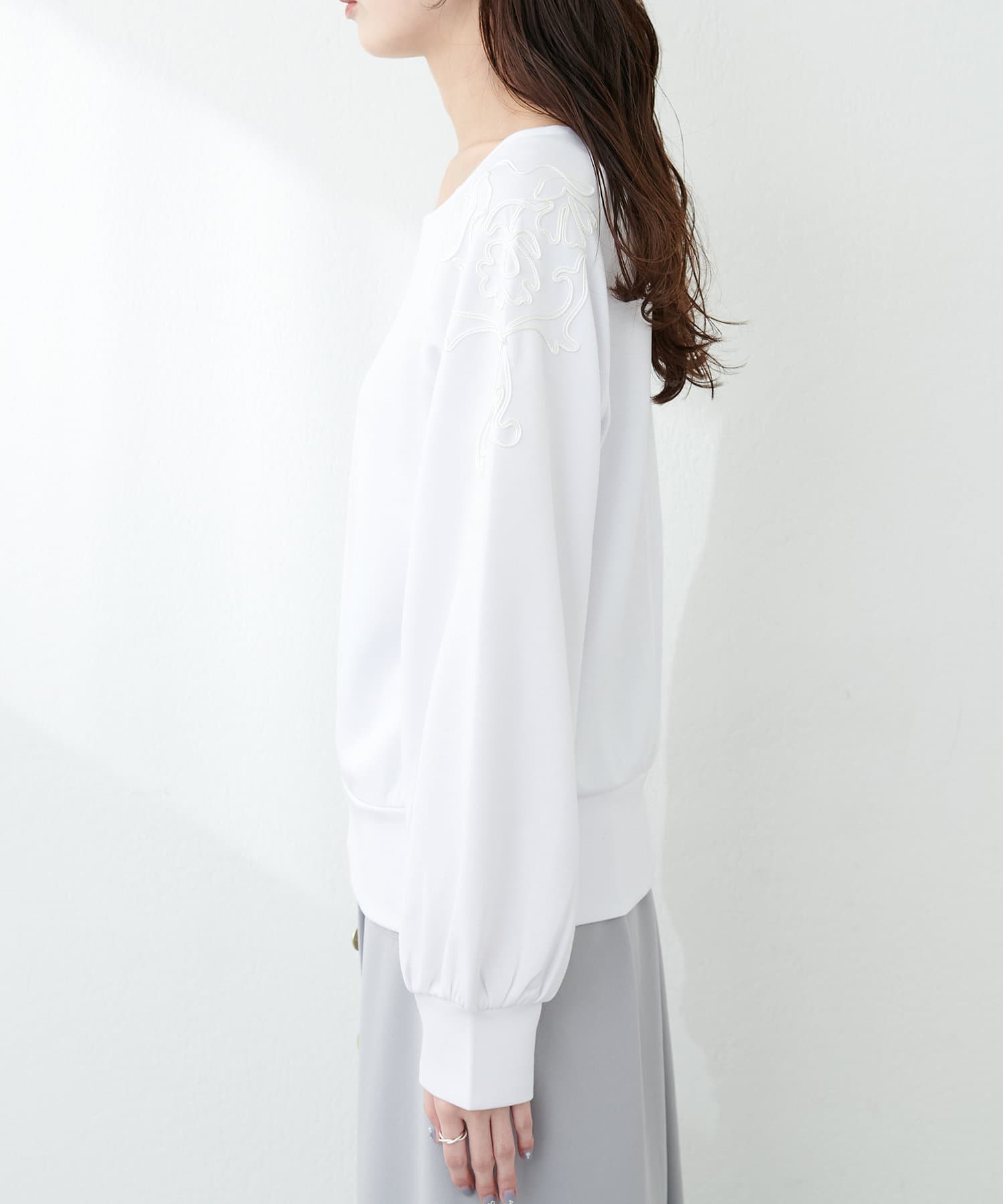 シンプルながらも肩にコード刺繍を施し、さりげない上品さが特徴のデザイン。