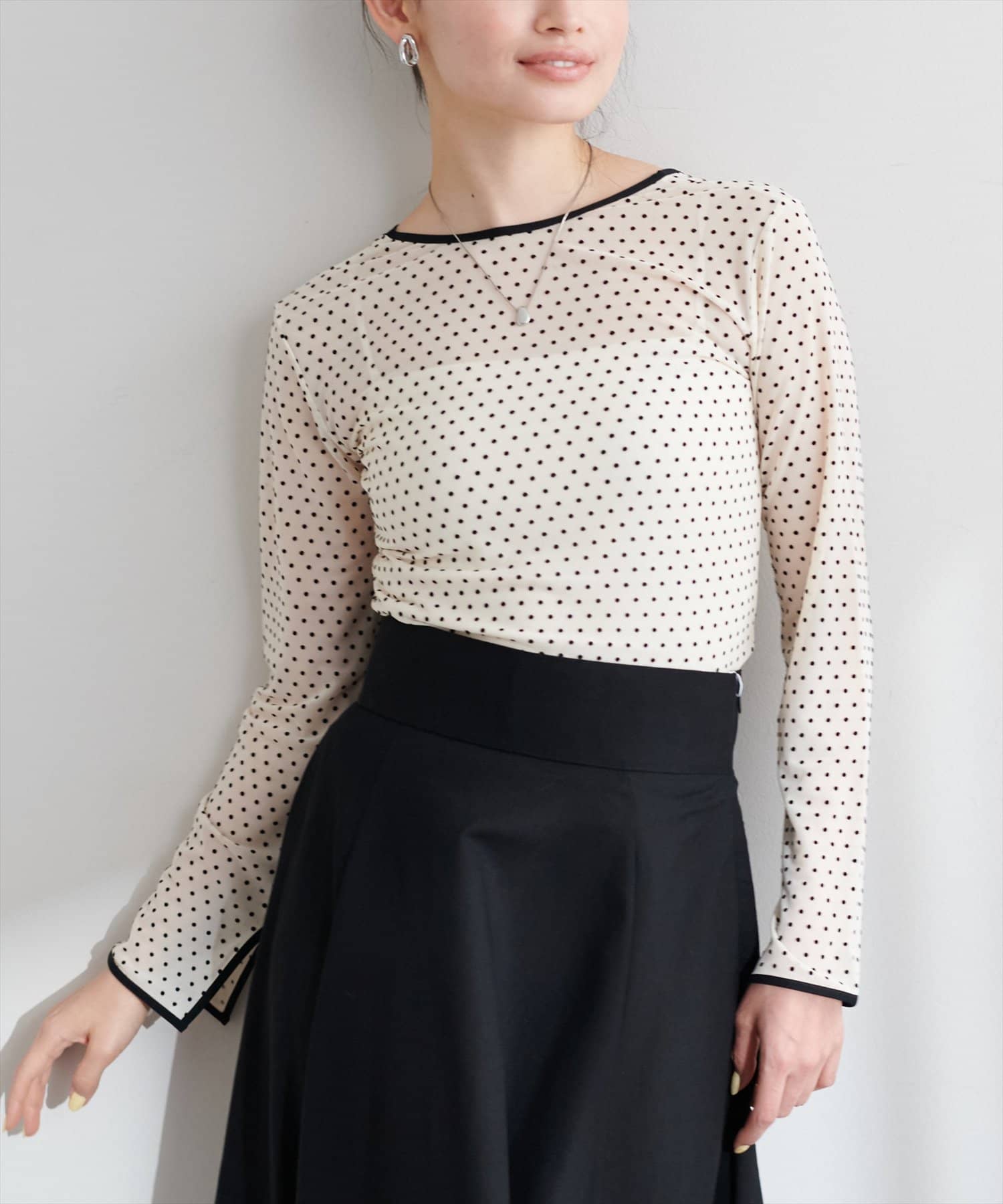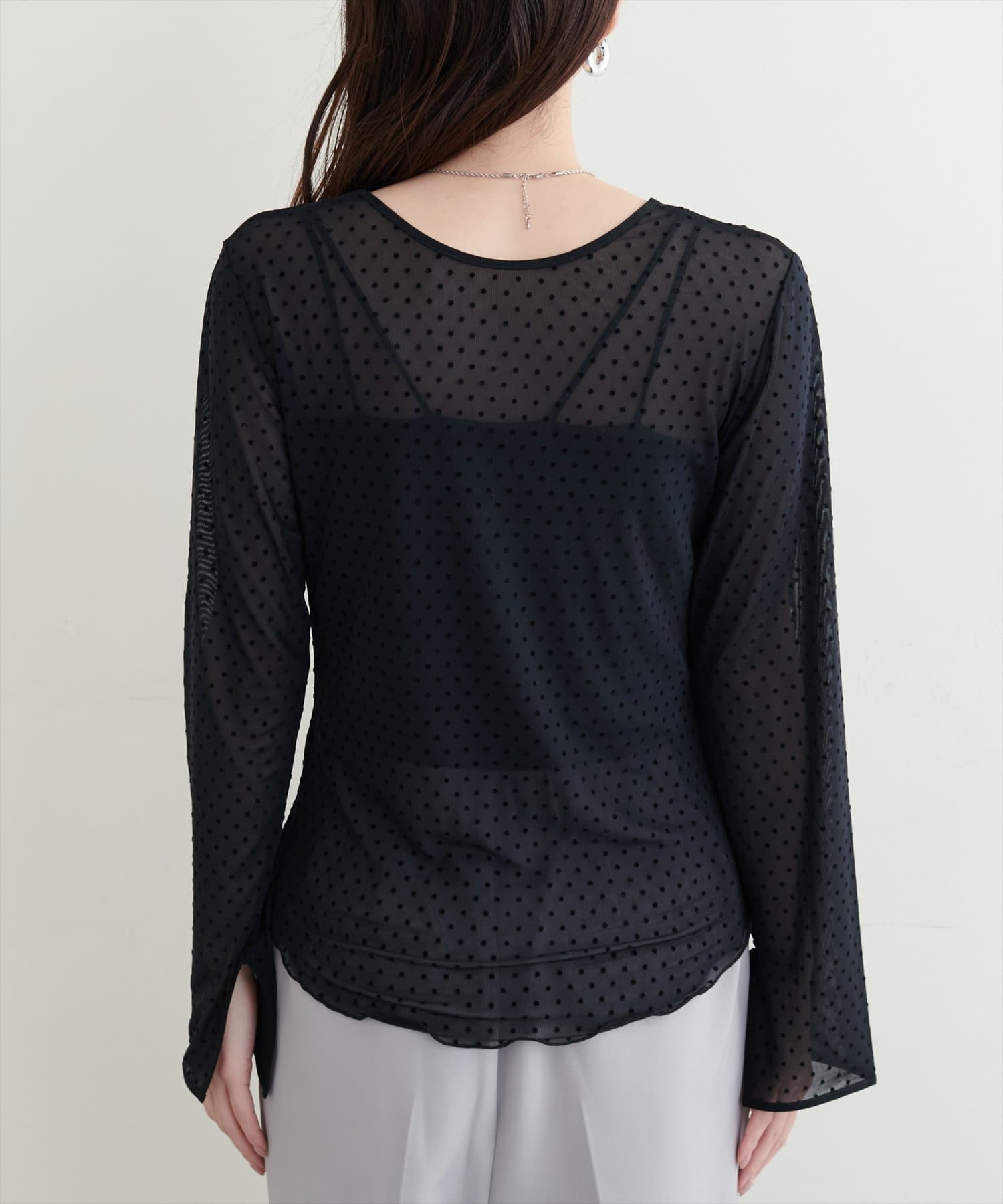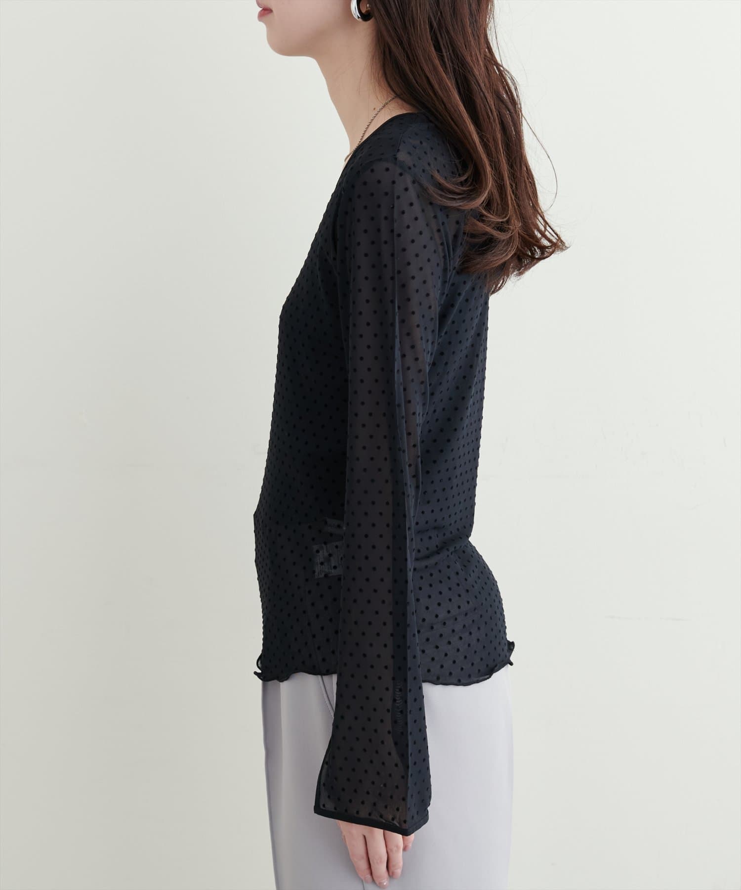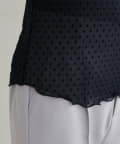 トレンド感のあるドットのフロッキー加工と裾のメローデザインがフェミニンで、細部までこだわりの詰まった1着。