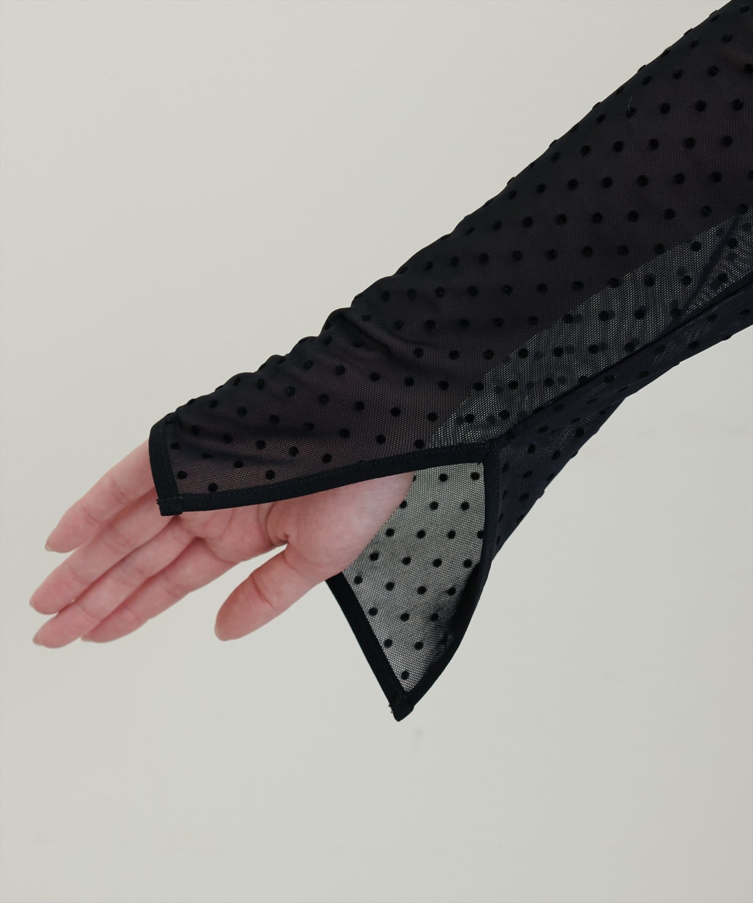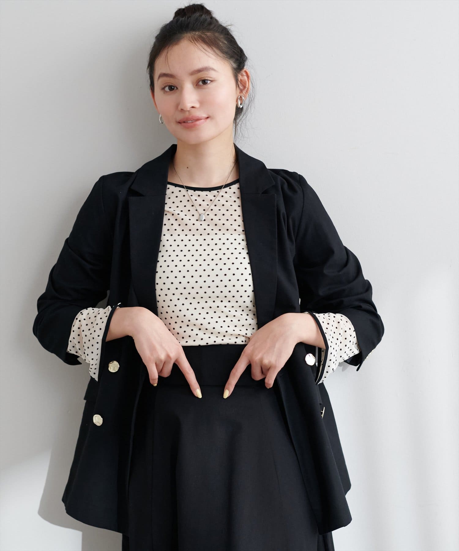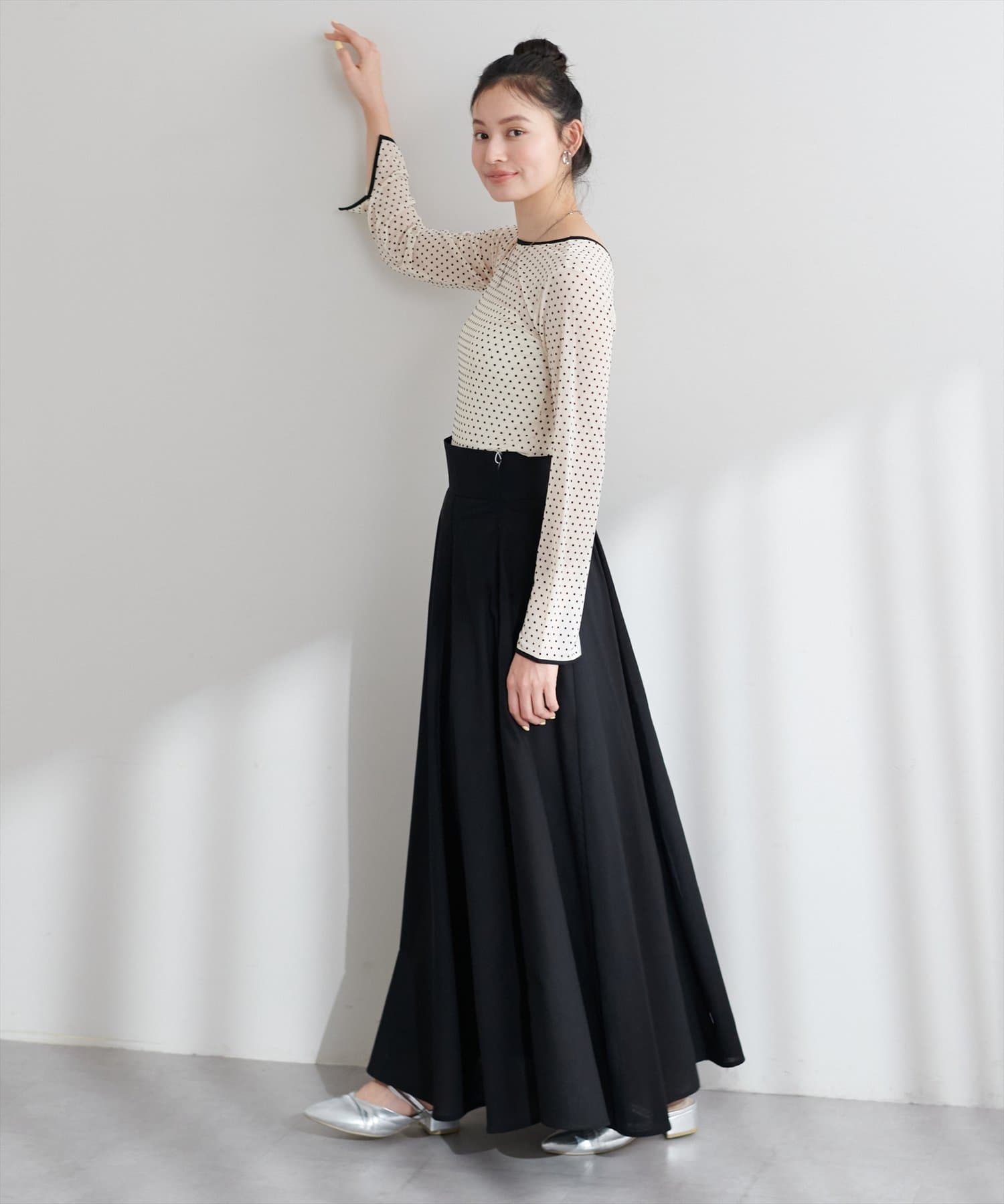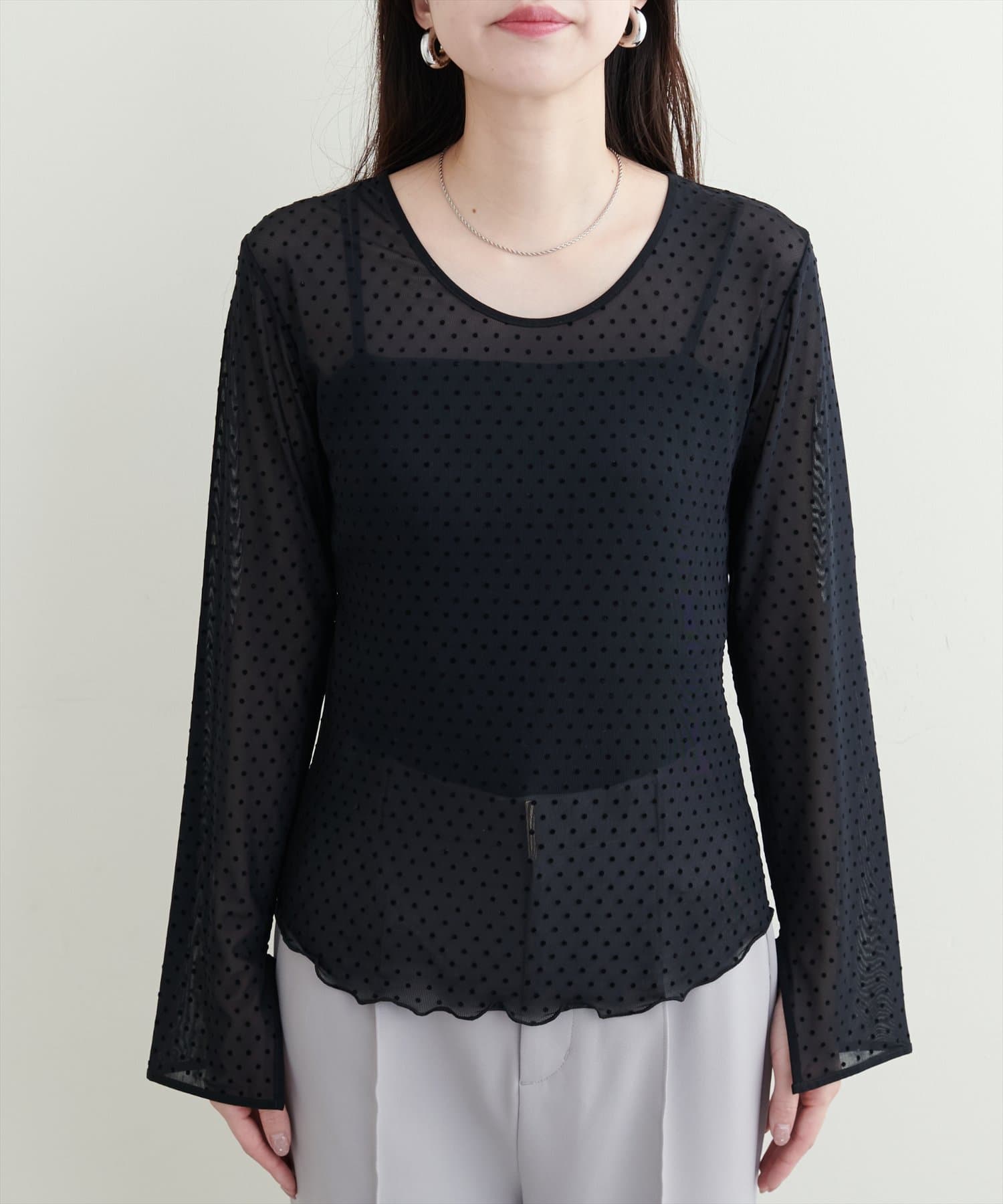 トレンド感のあるドットのフロッキー加工と裾のメローデザインがフェミニンで、細部までこだわりの詰まった1着。