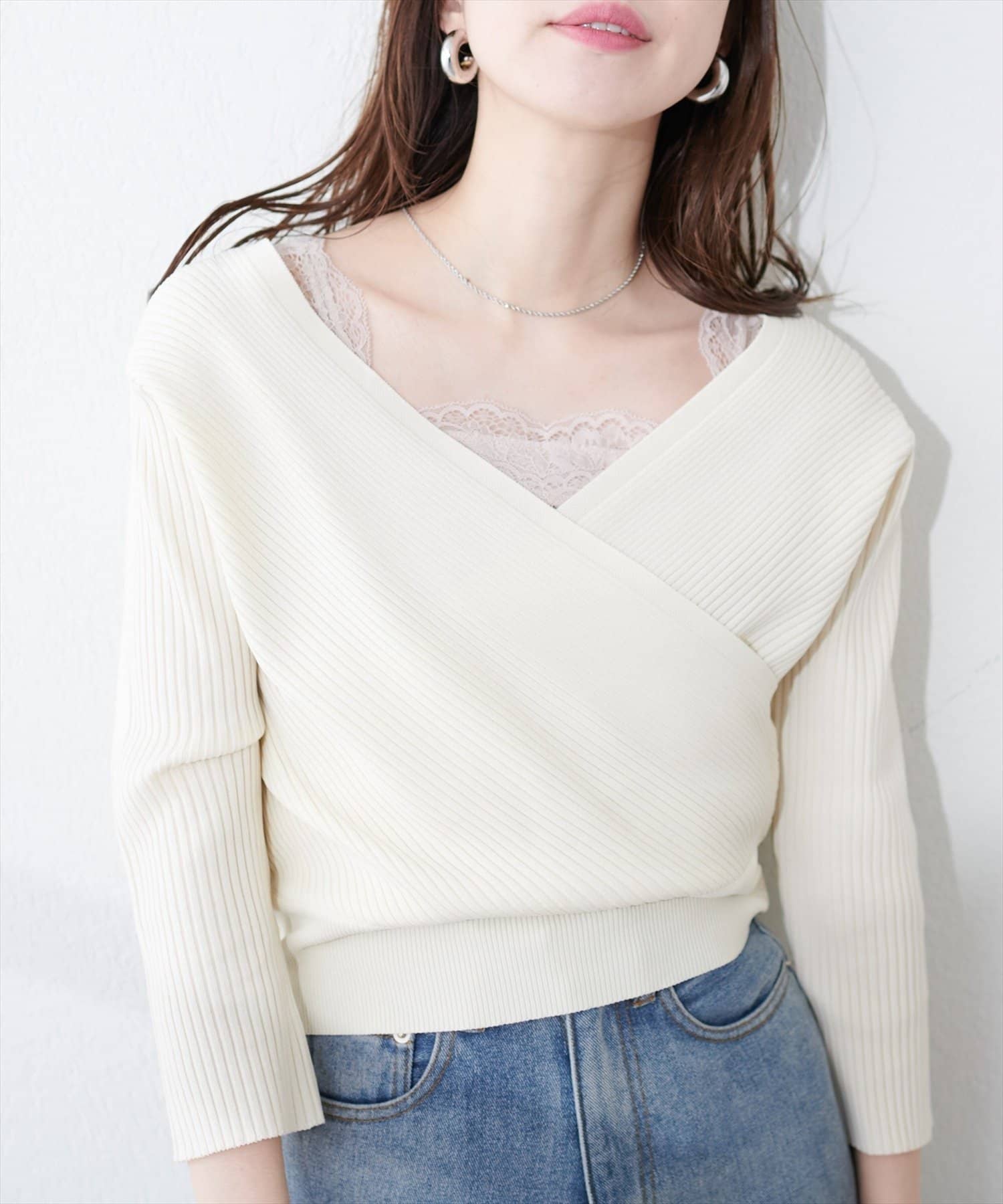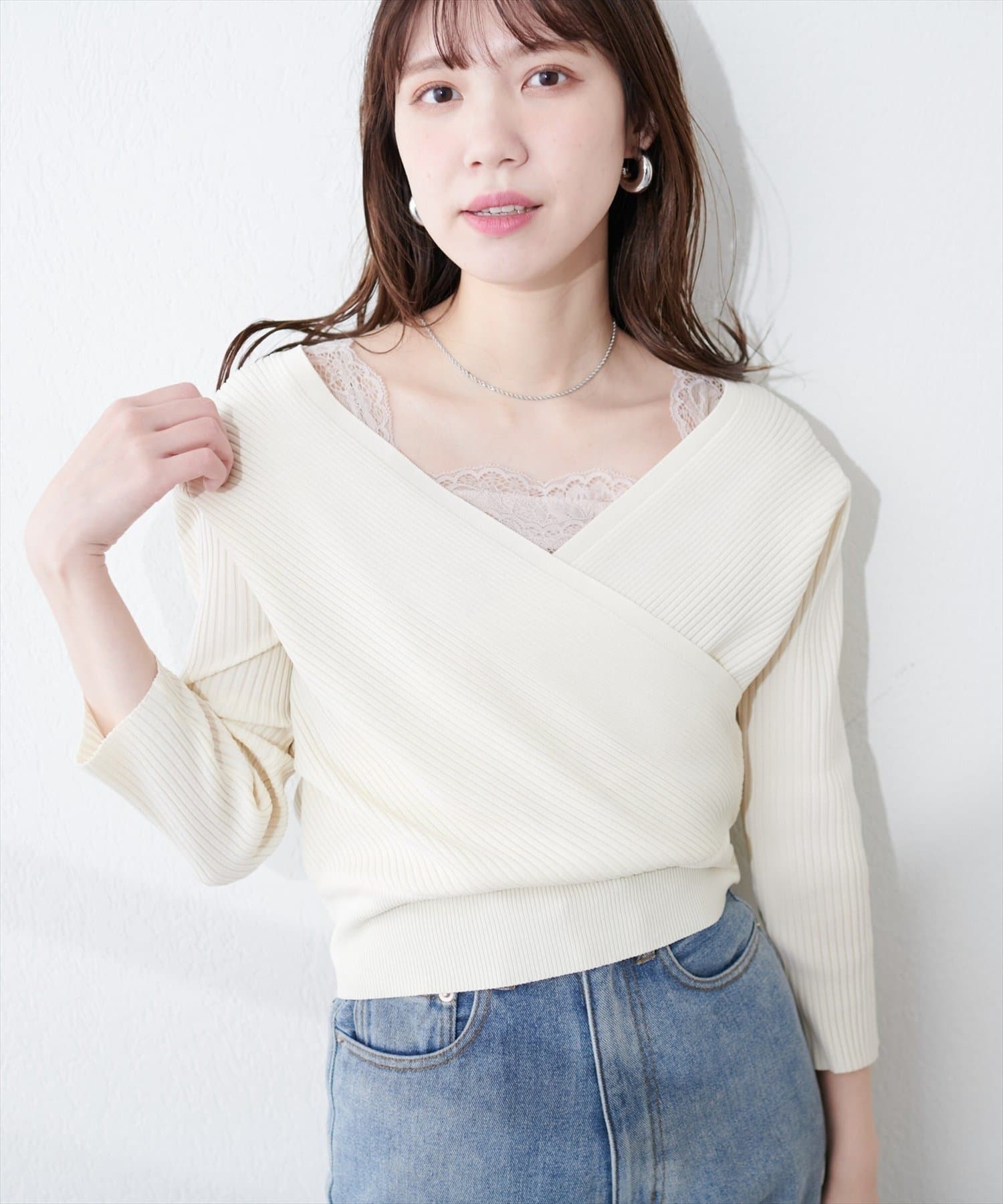 Vネックとスクエアネック、2つの顔が楽しめる華やかな印象のインナー。