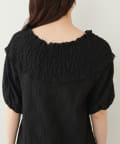 肩から胸にかけてクロスしたシャーリングデザインが目を惹くフェミニントップス。