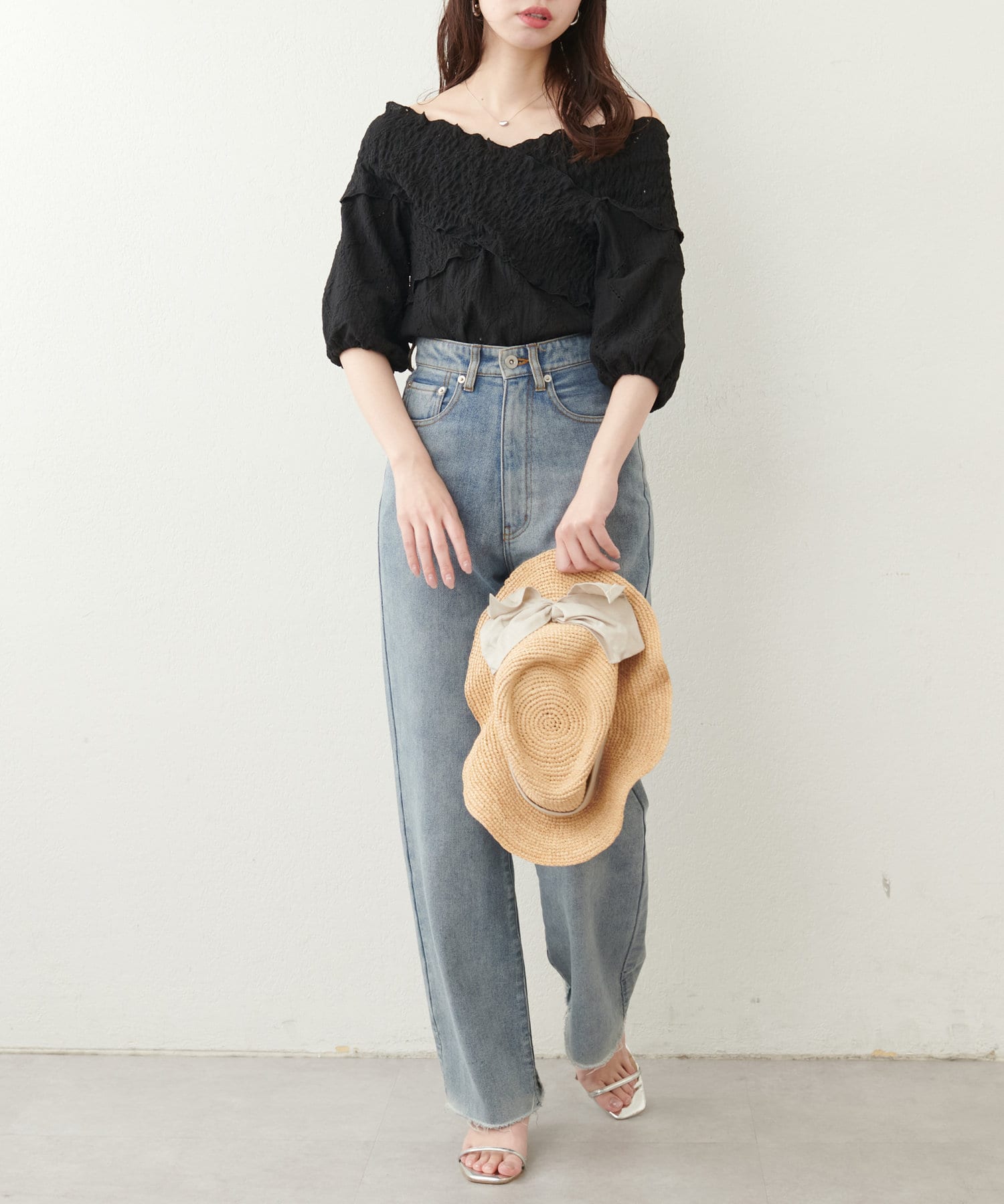 デニムと合わせてヘルシーな肌見せコーデにするのもおすすめ。