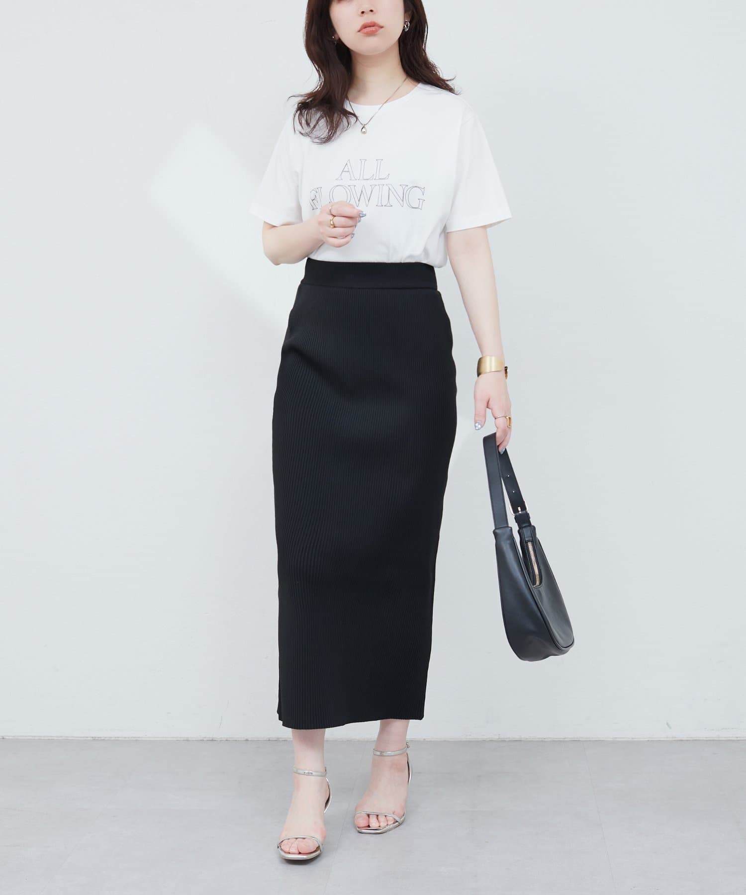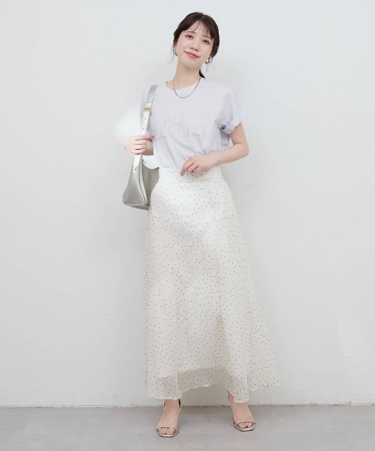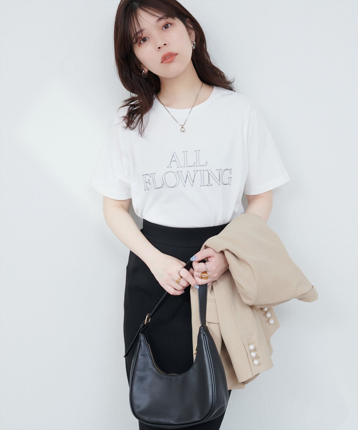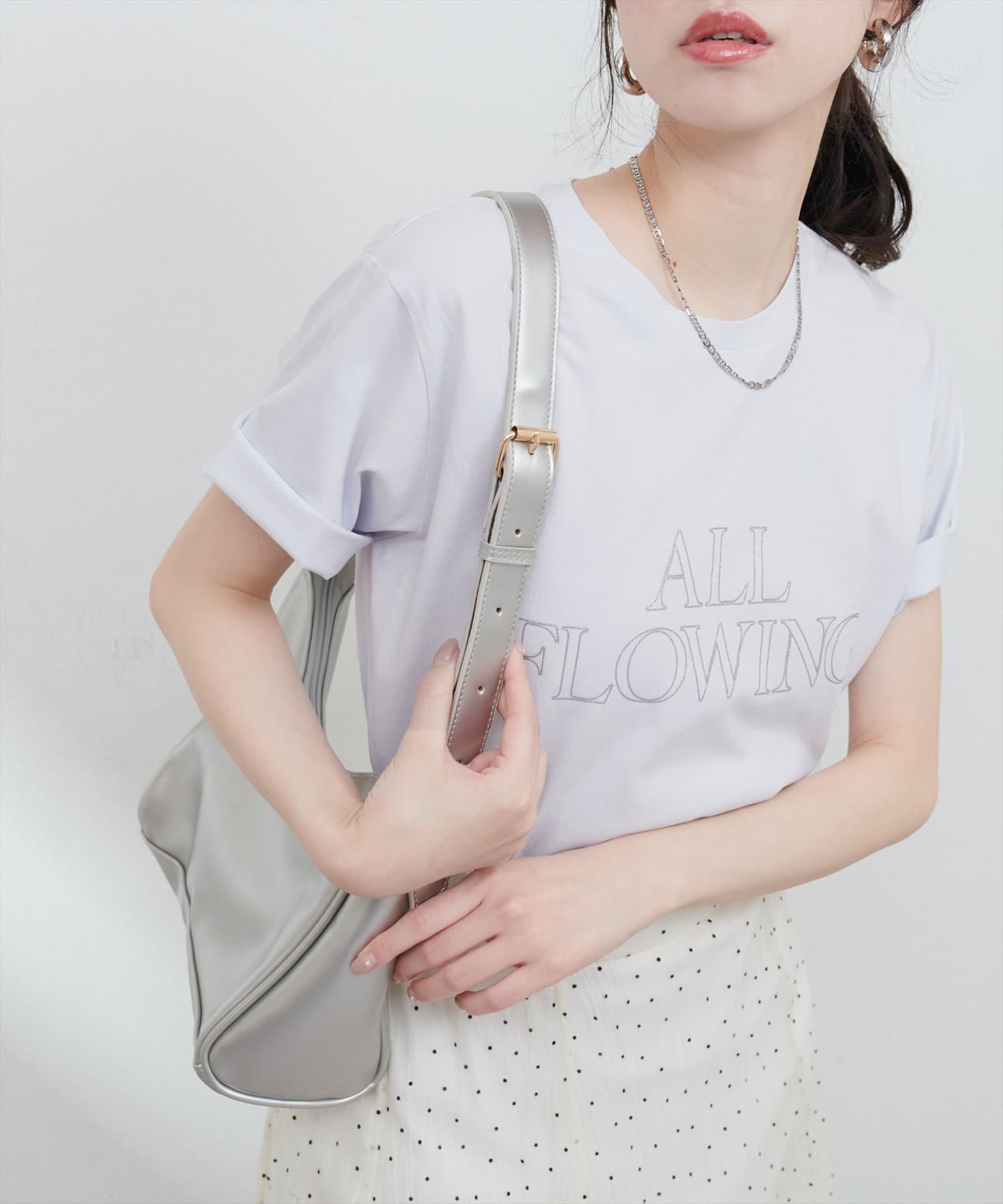 落ち着いた大人な印象のラメ抜きロゴがコーディネートのアクセントに。