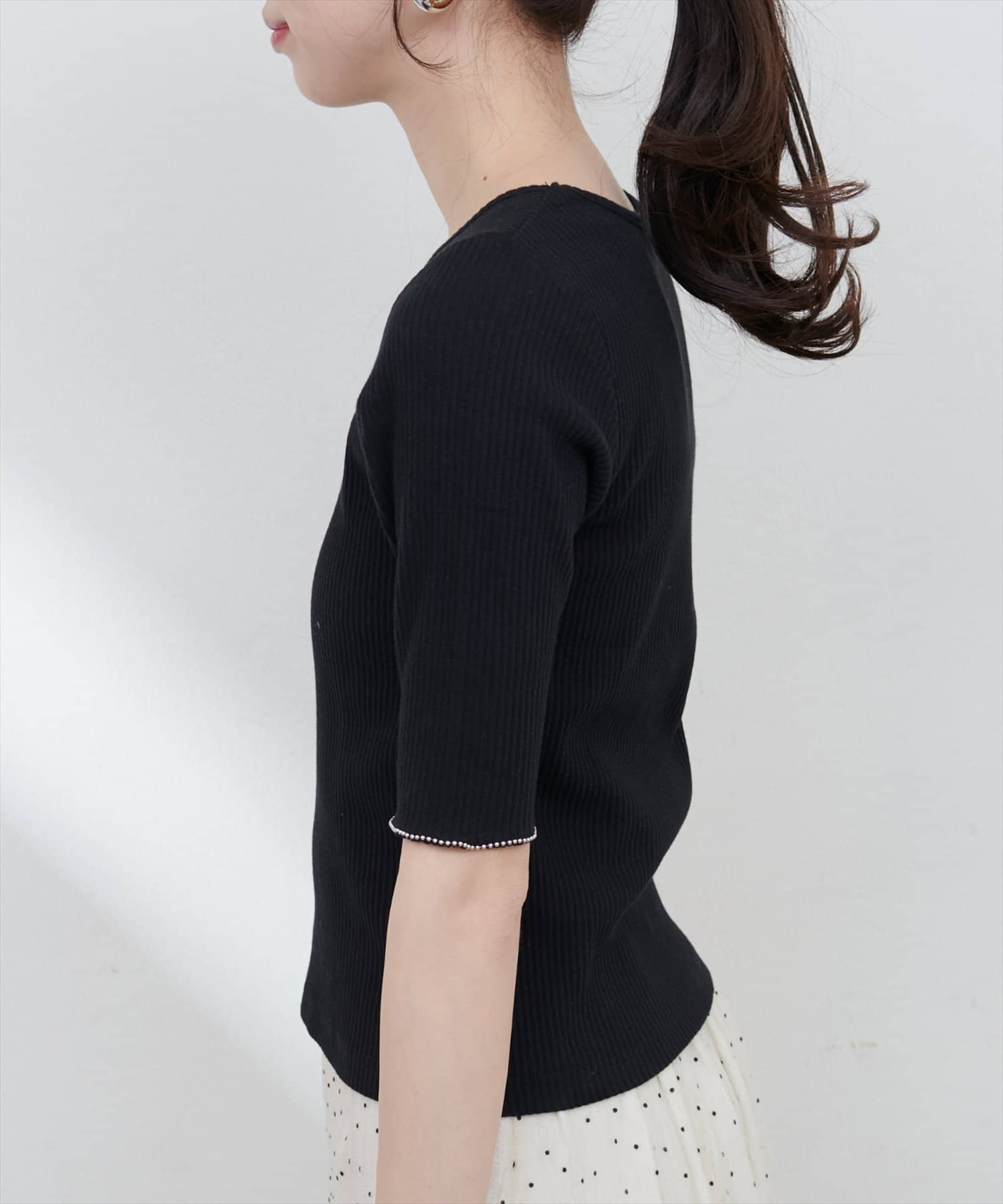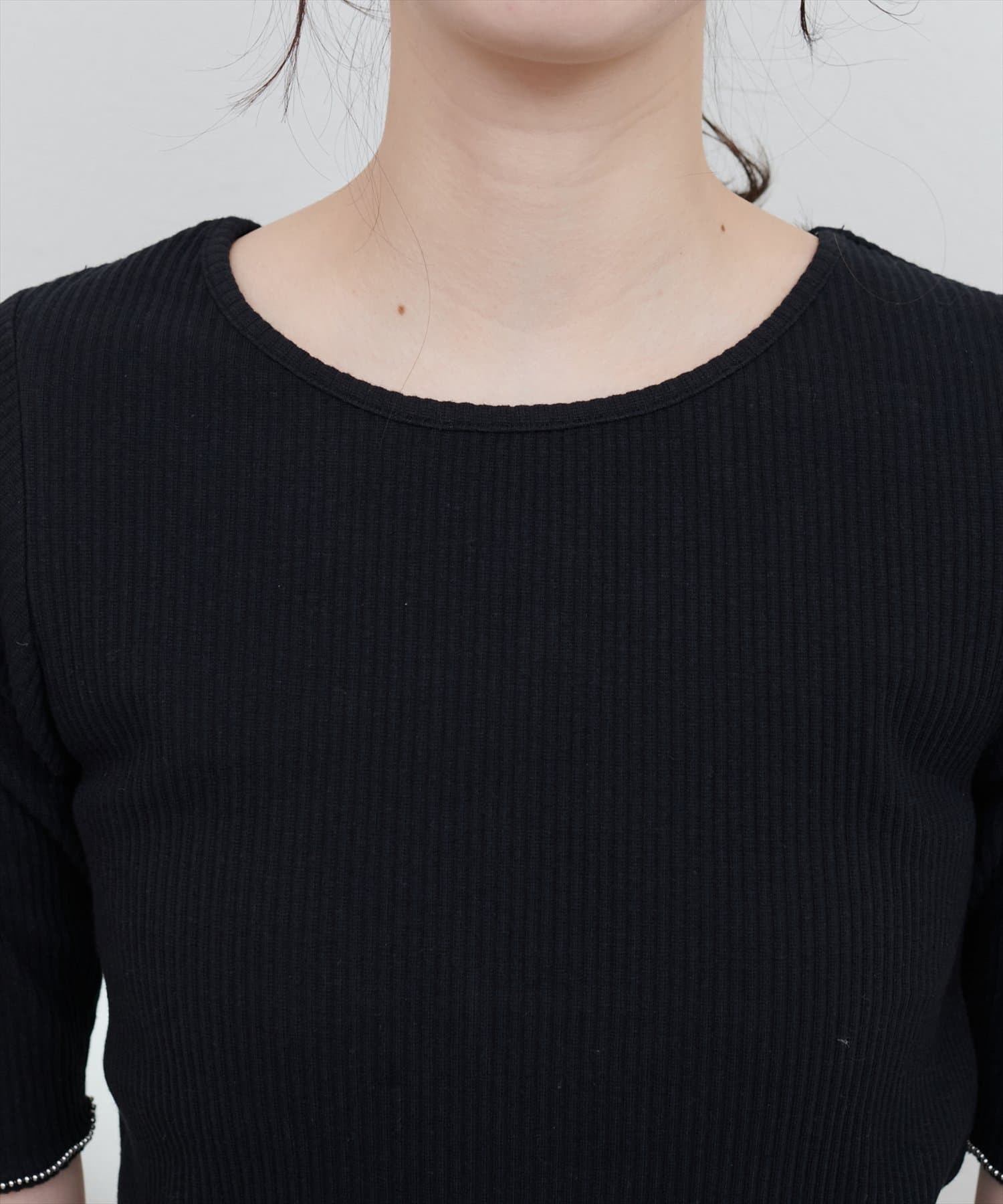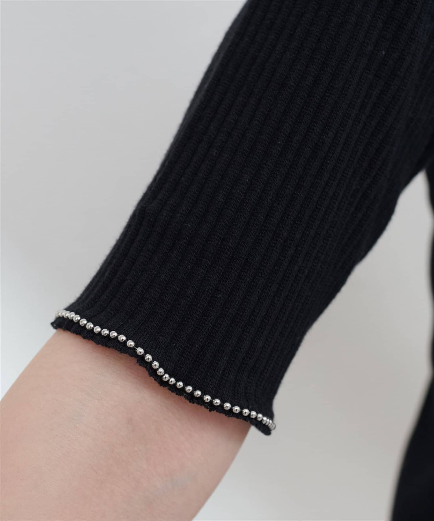 袖の先端にメタルボールチェーンのついた繊細なデザインのカットトップス。