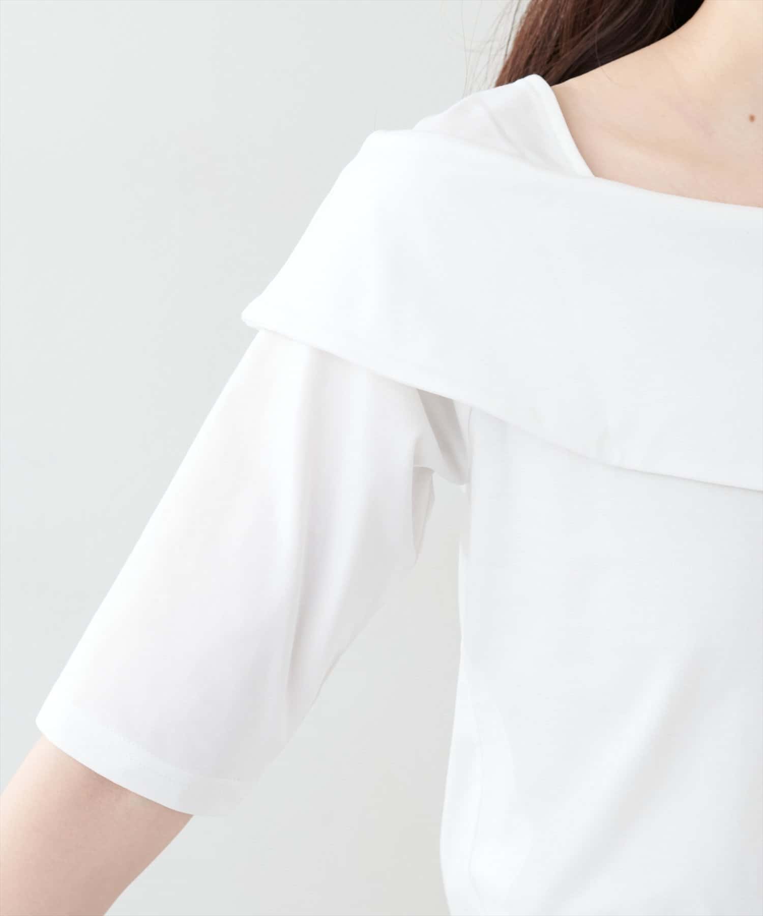 大きなアシメ衿が肩を覆ってくれて肩周りが気にならない優秀な一枚です。
