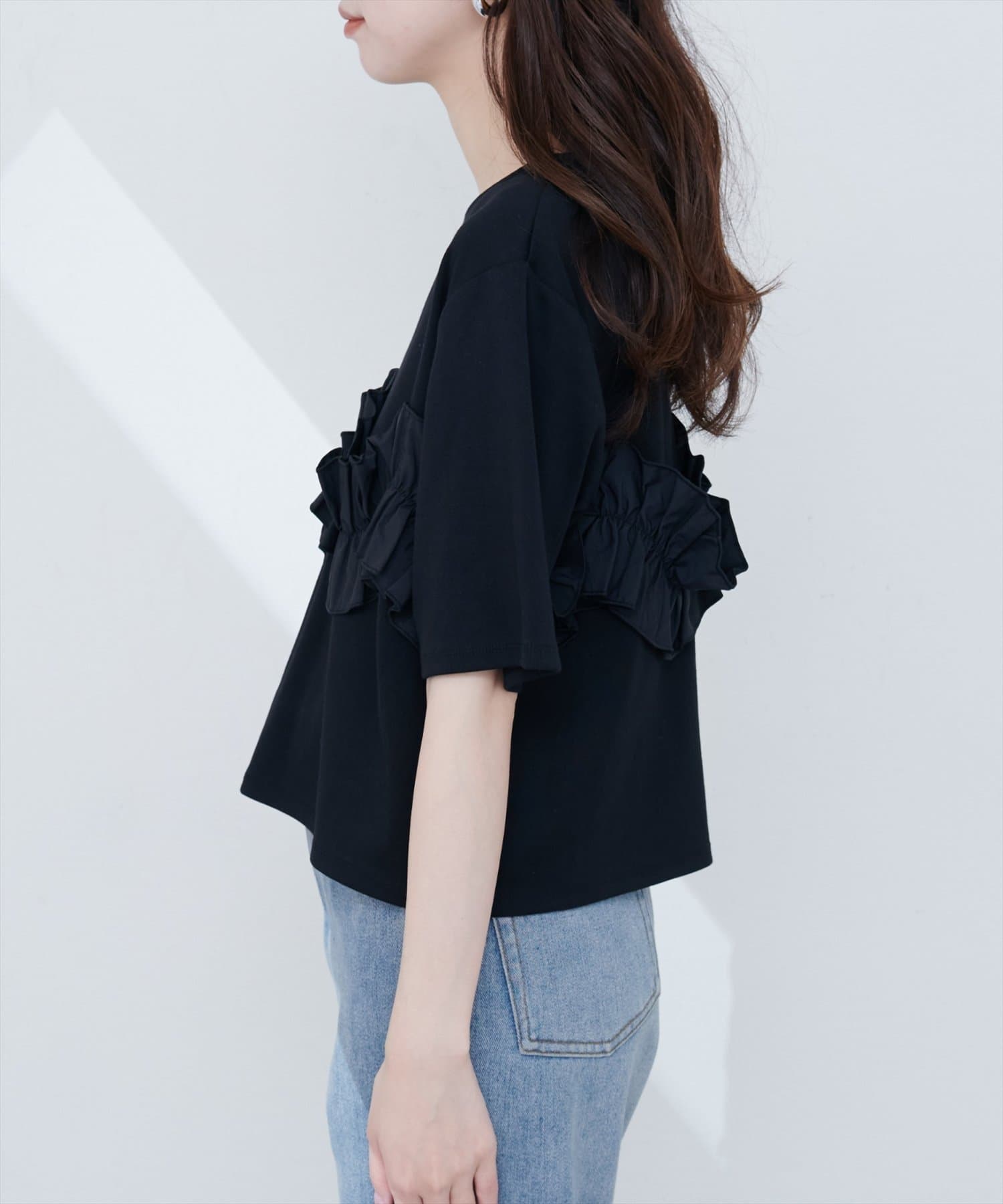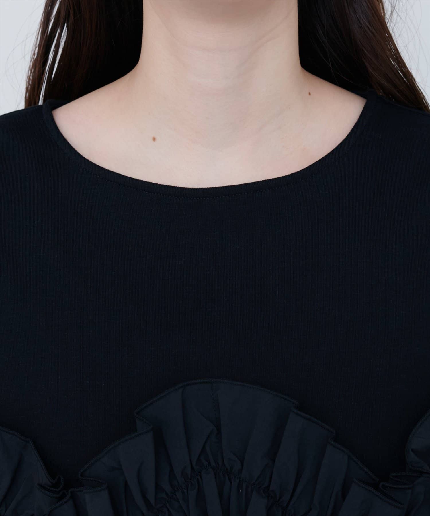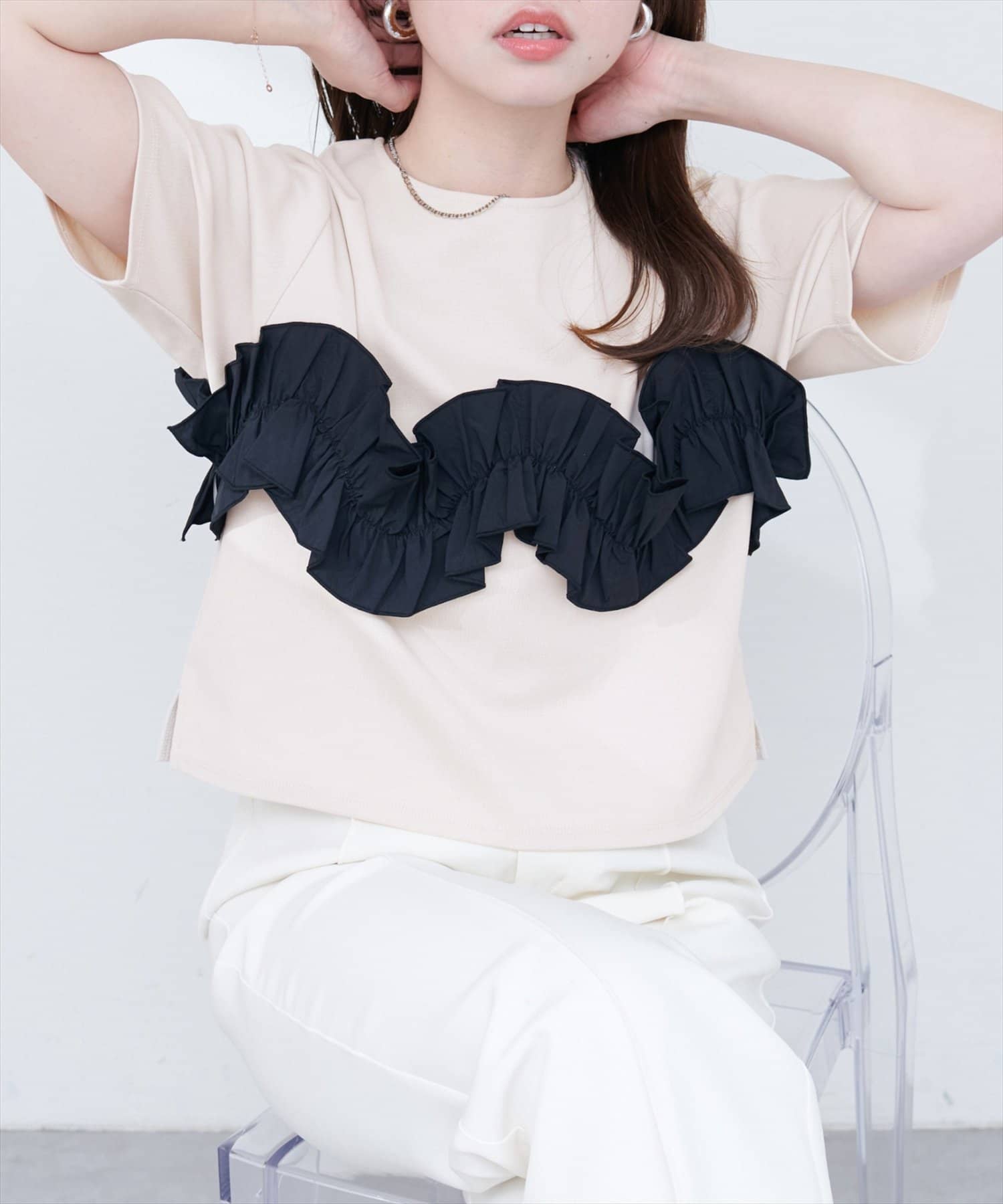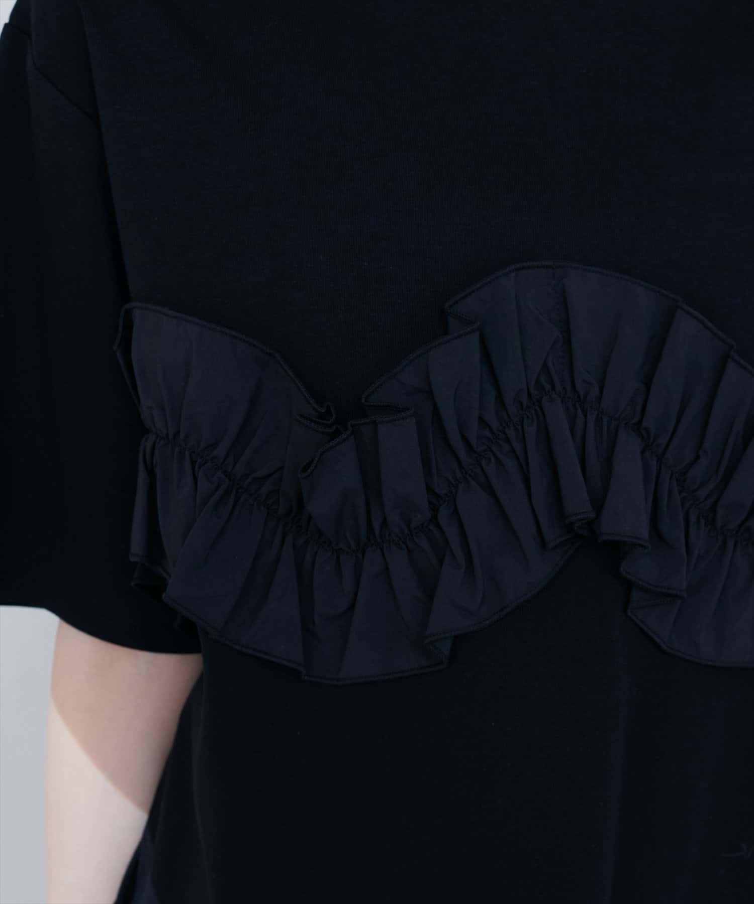 一見シンプルながら、大胆なフリル使いが目を引く半袖Tシャツ。