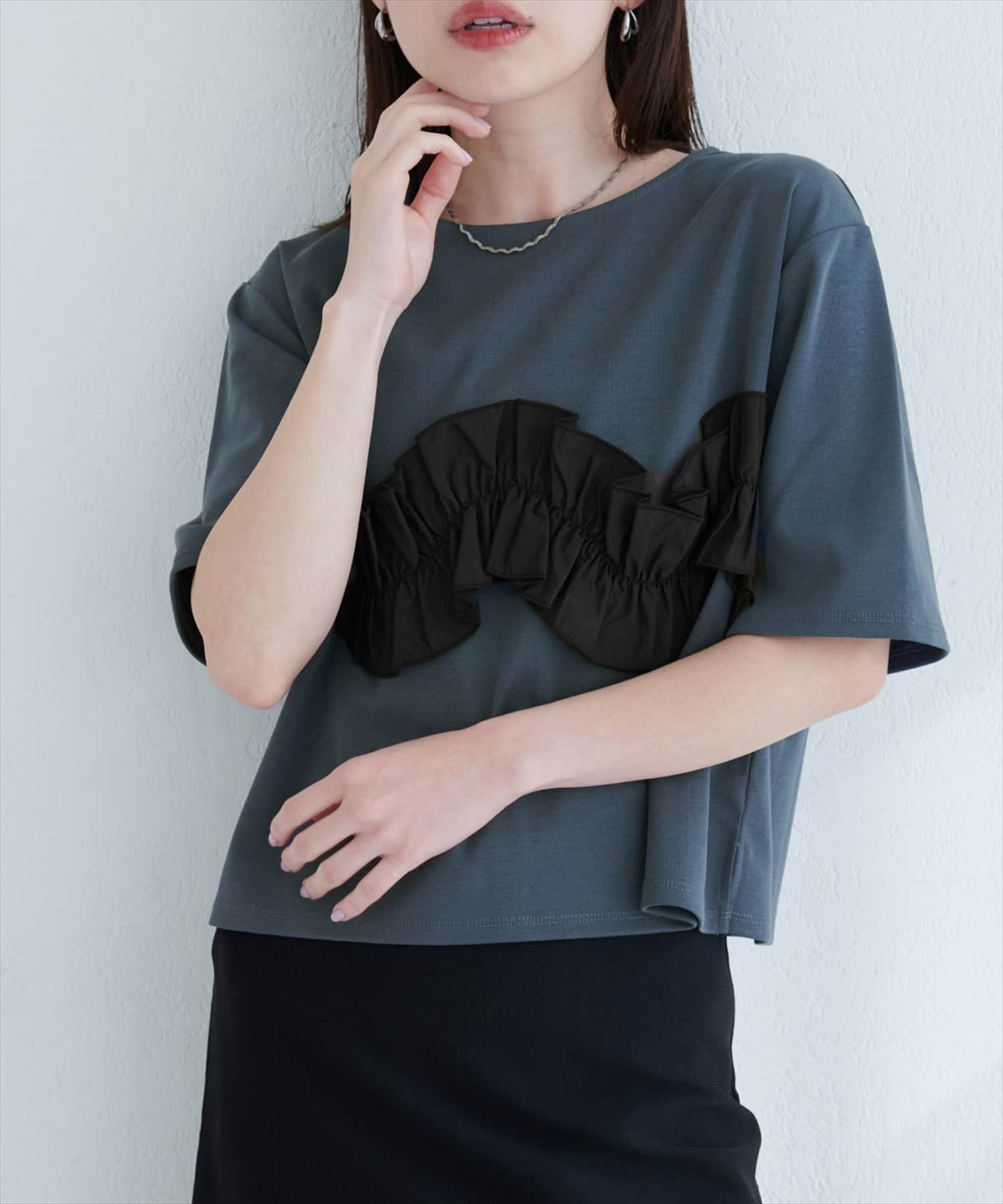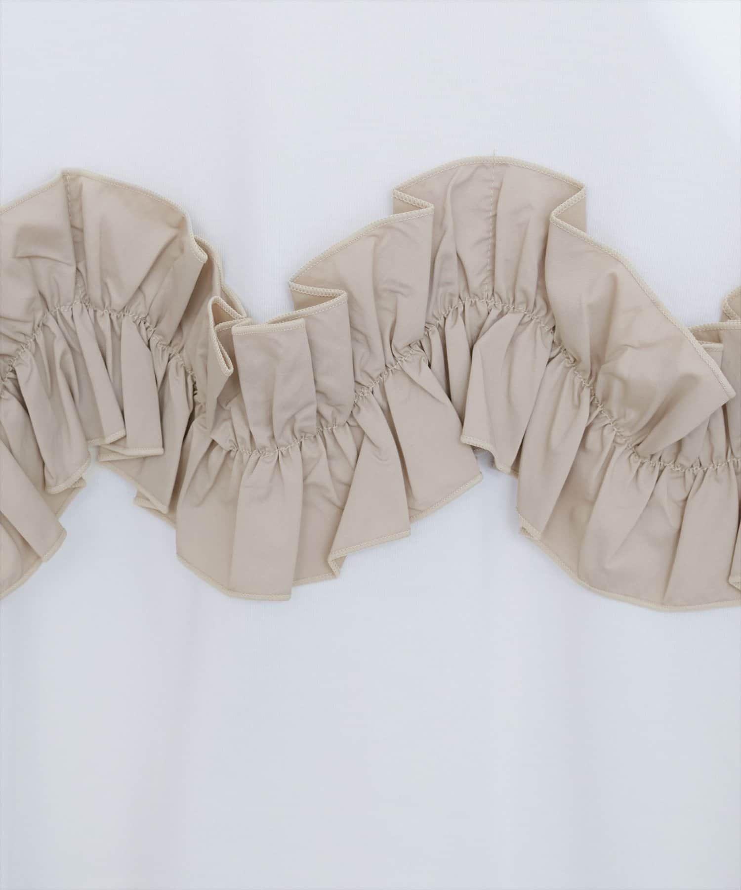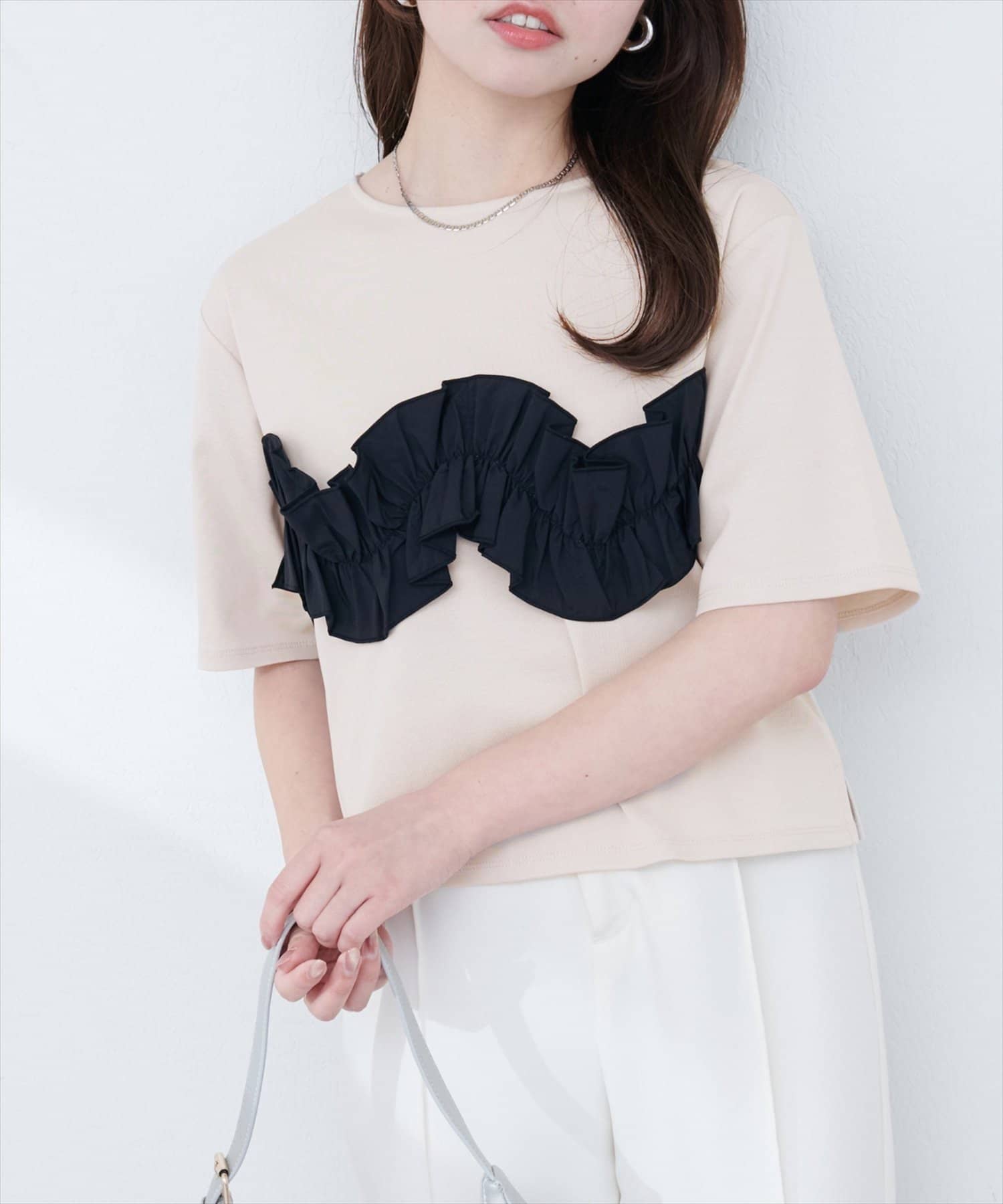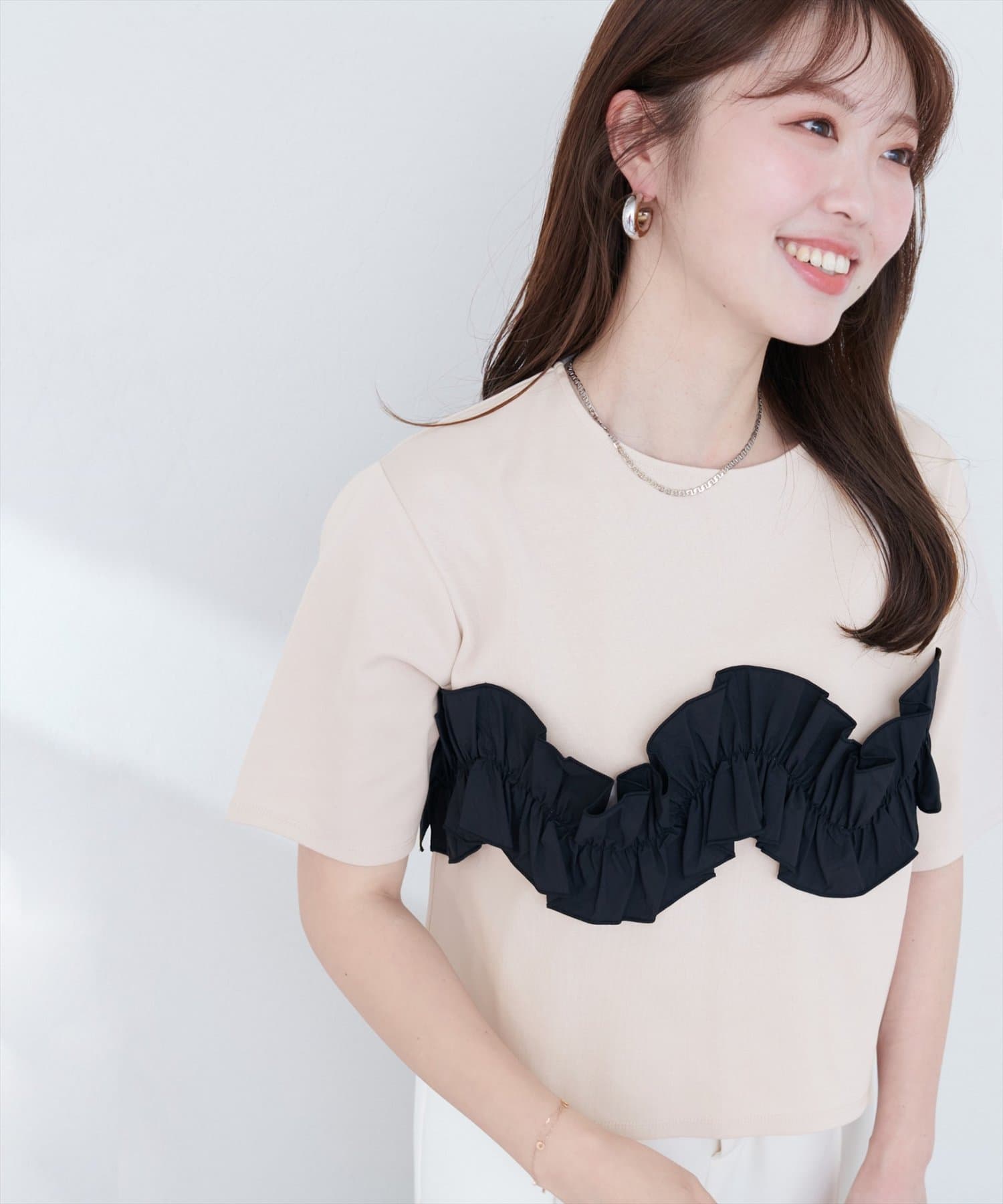 一見シンプルながら、大胆なフリル使いが目を引く半袖Tシャツ。