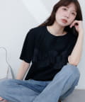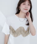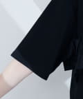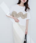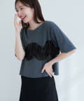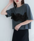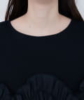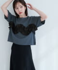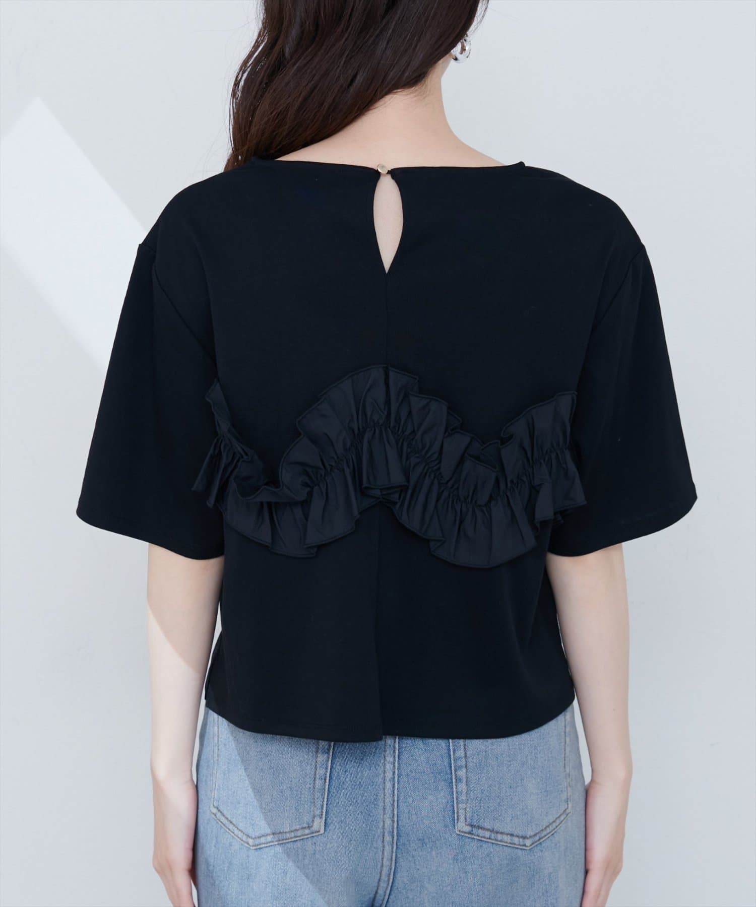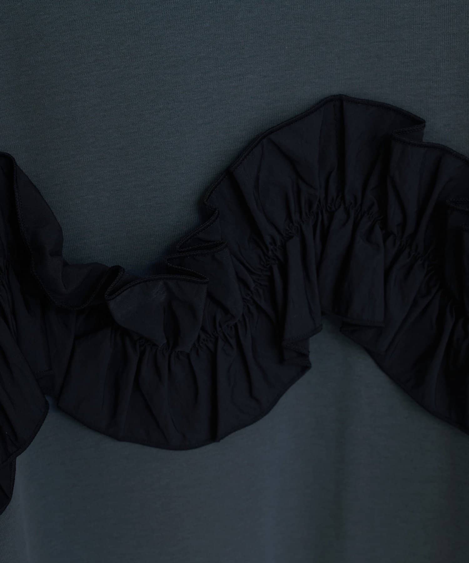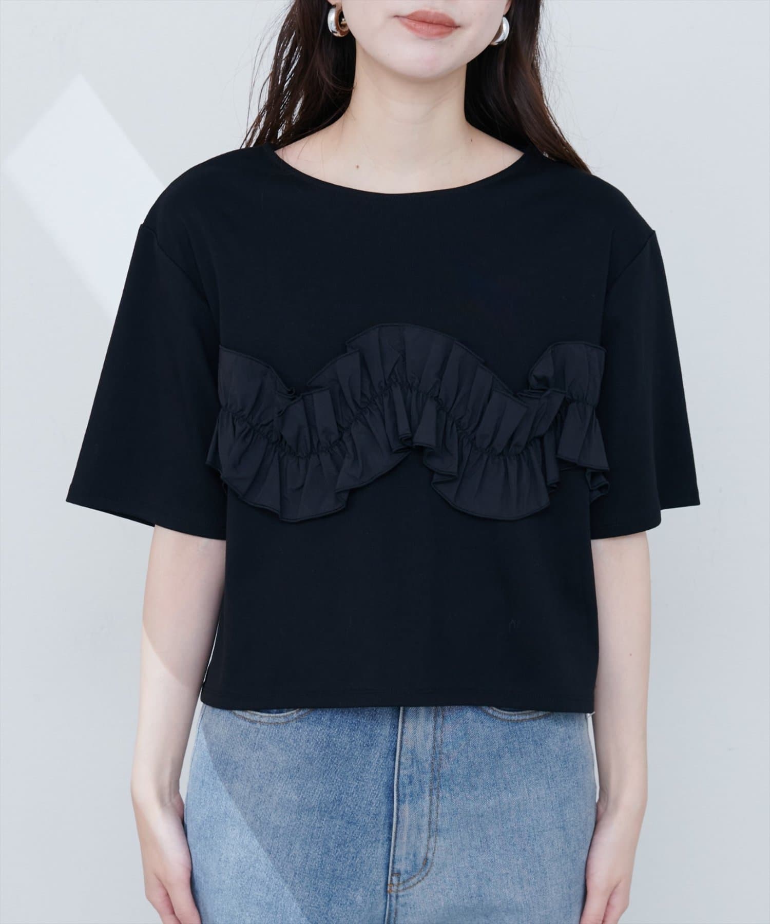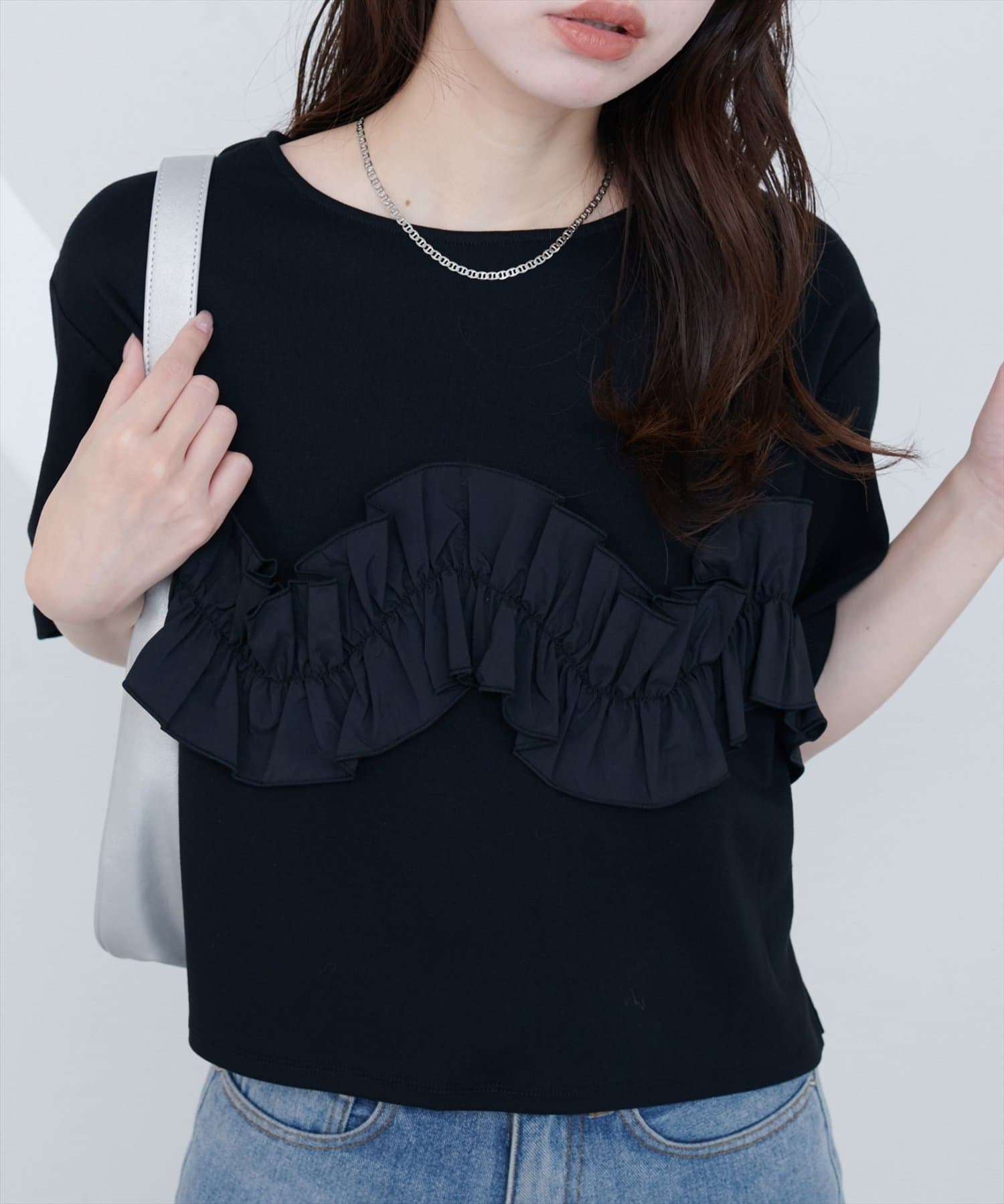 一見シンプルながら、大胆なフリル使いが目を引く半袖Tシャツ。