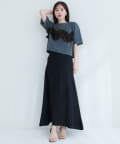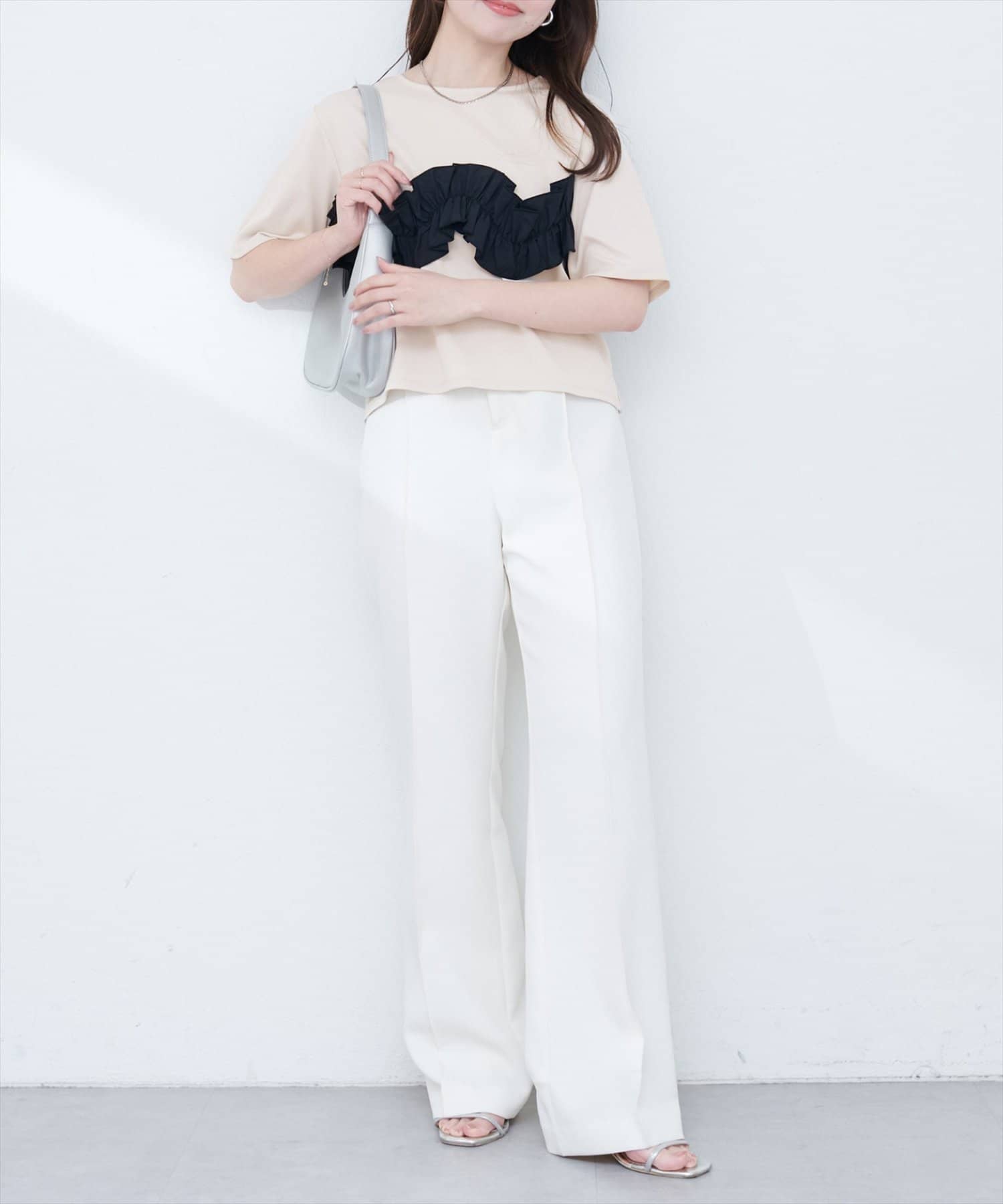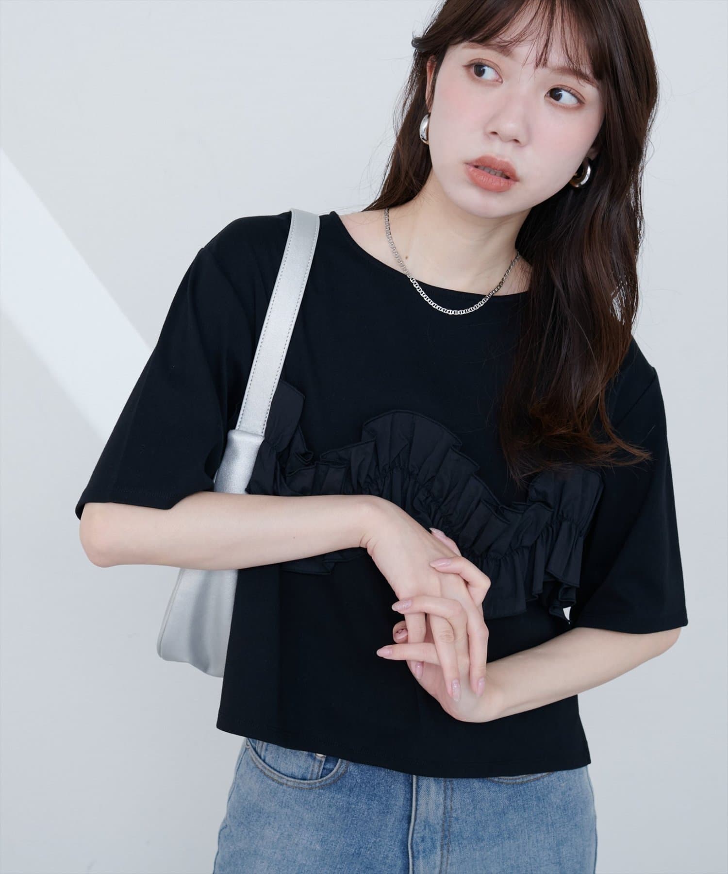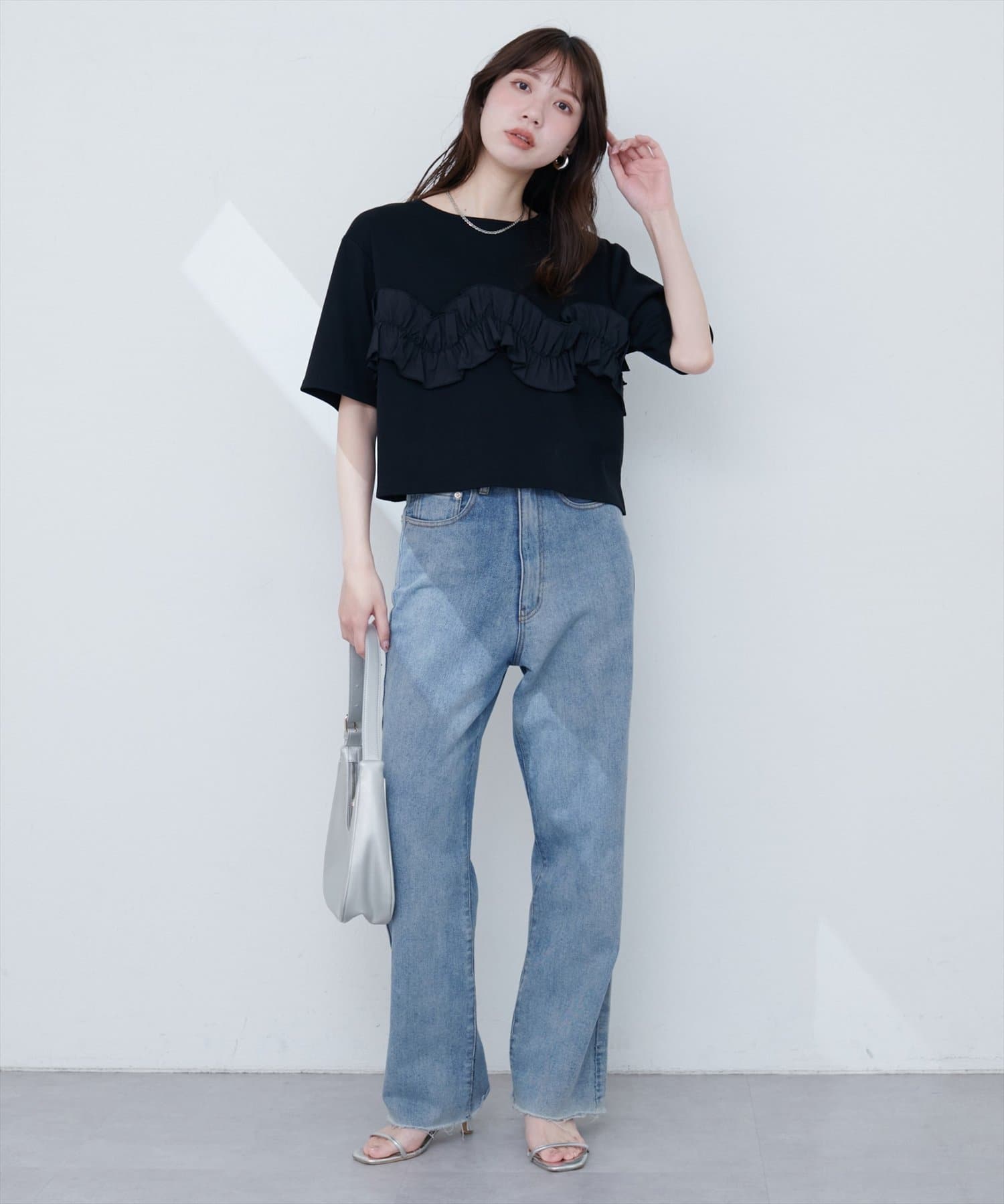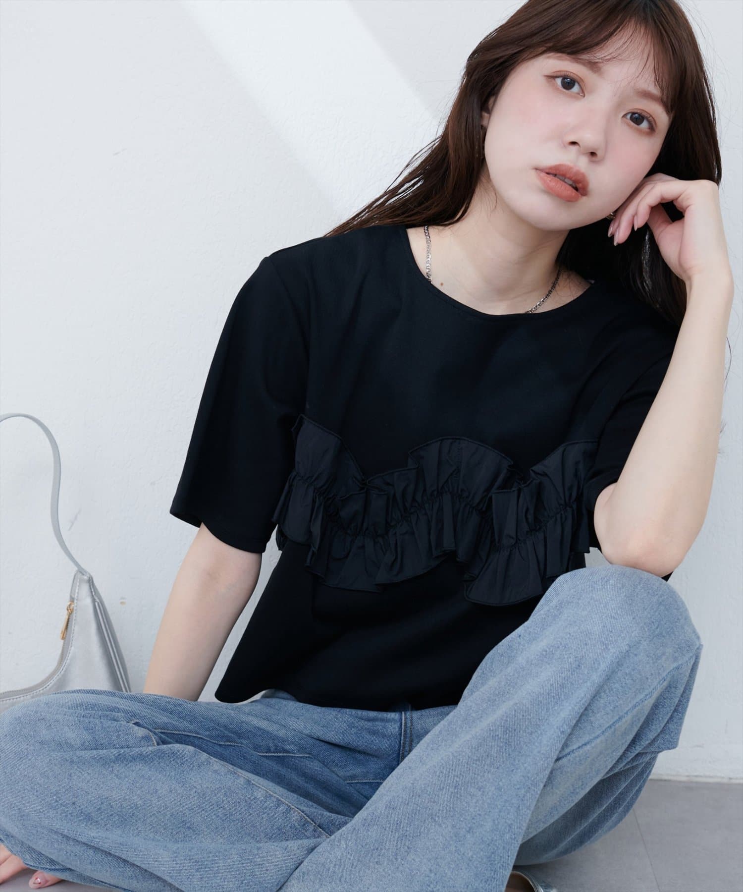 モードな印象が魅力です。Tシャツのカジュアルさとフリルの華やかさのバランスが絶妙で、