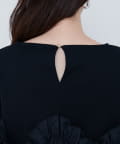 胸元を飾るボリュームたっぷりのフリルは、甘さを抑えた