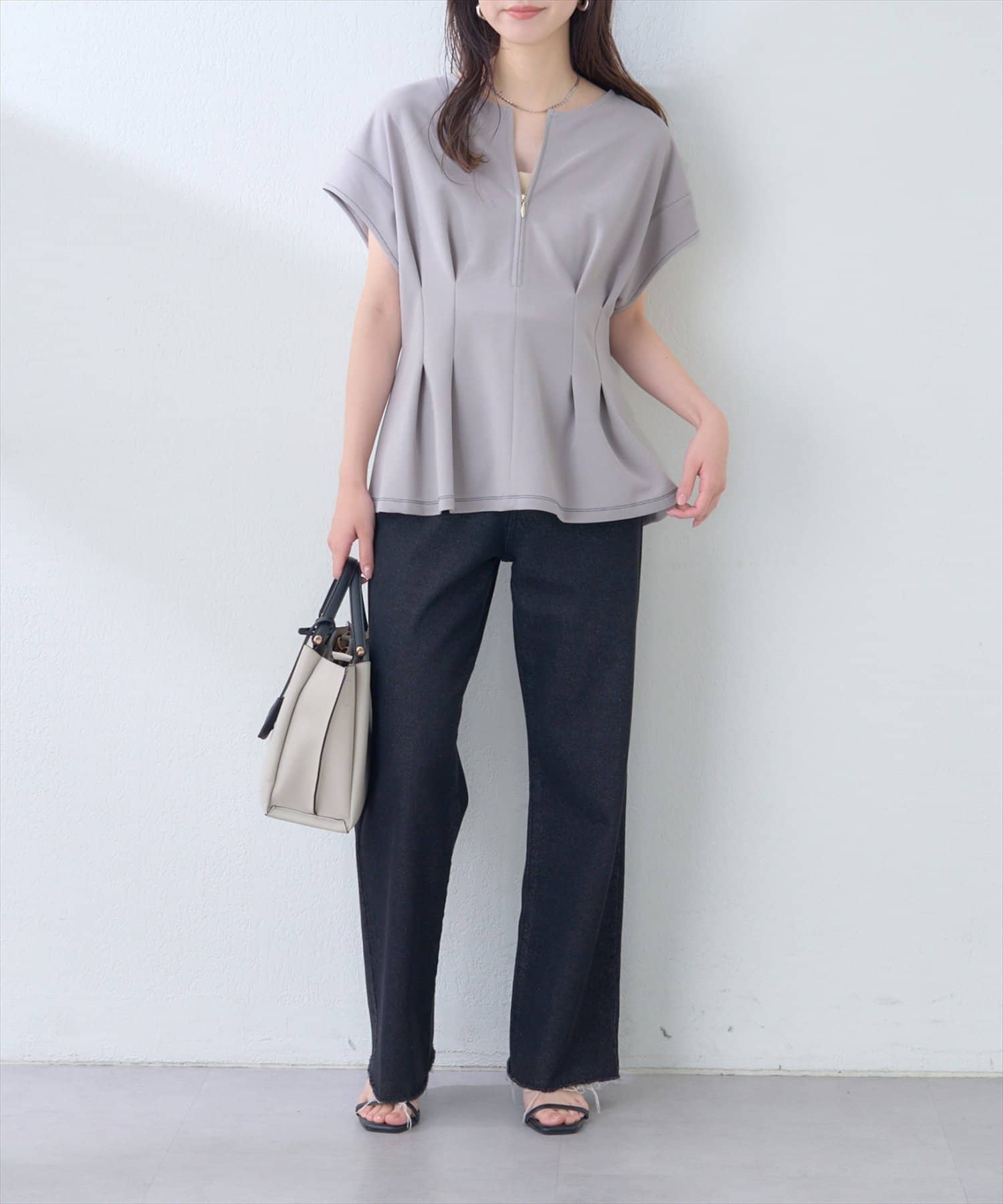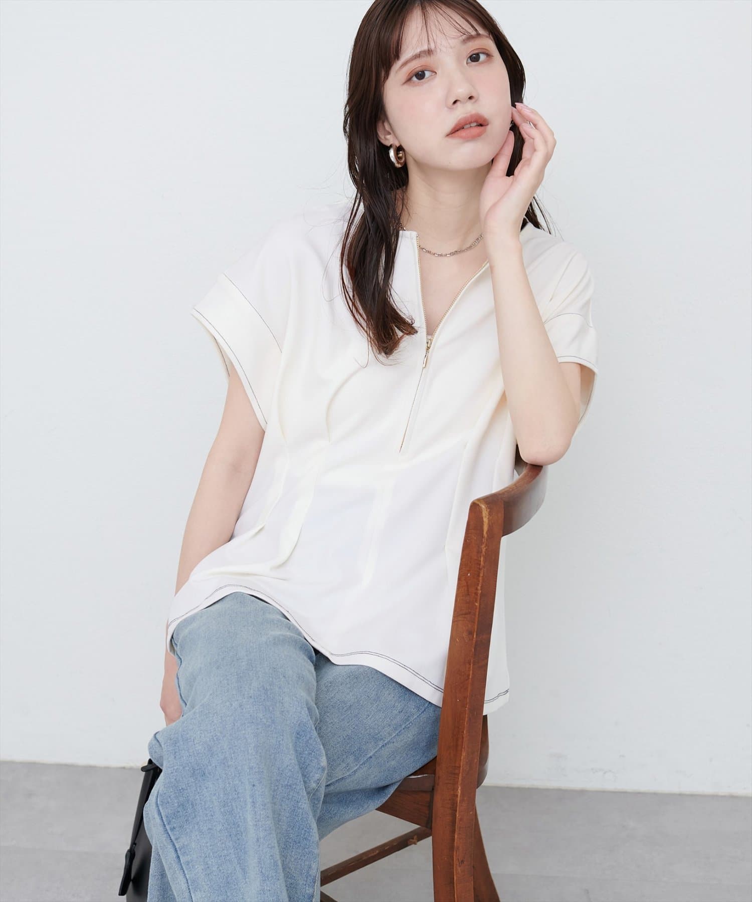 デニムと合わせた定番カジュアルスタイルも、素材感とタックシルエットで、こなれた印象に。