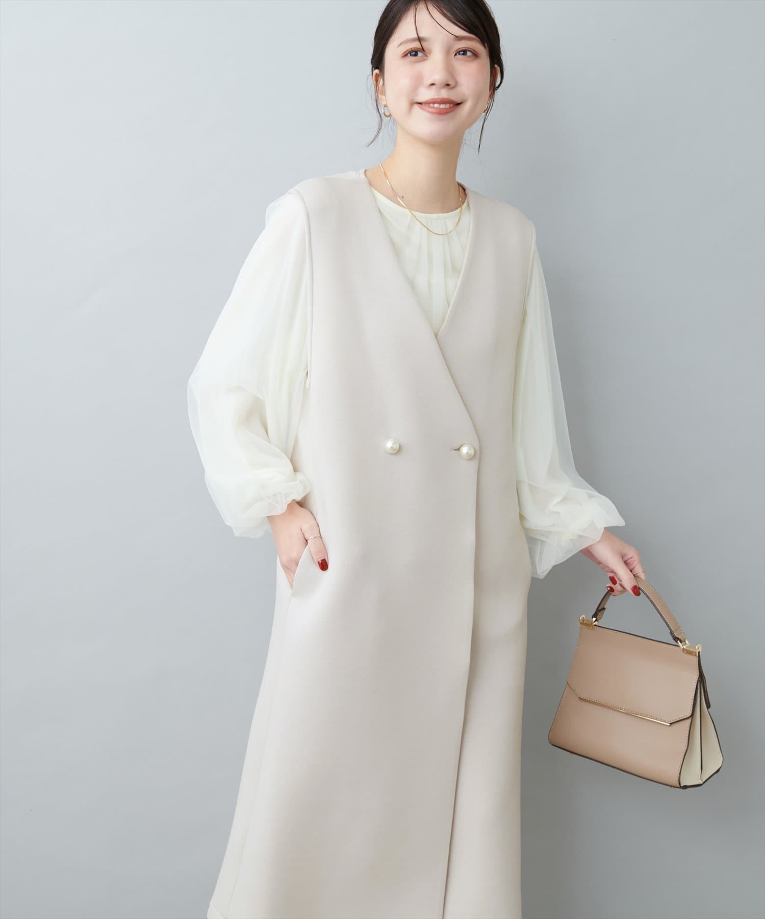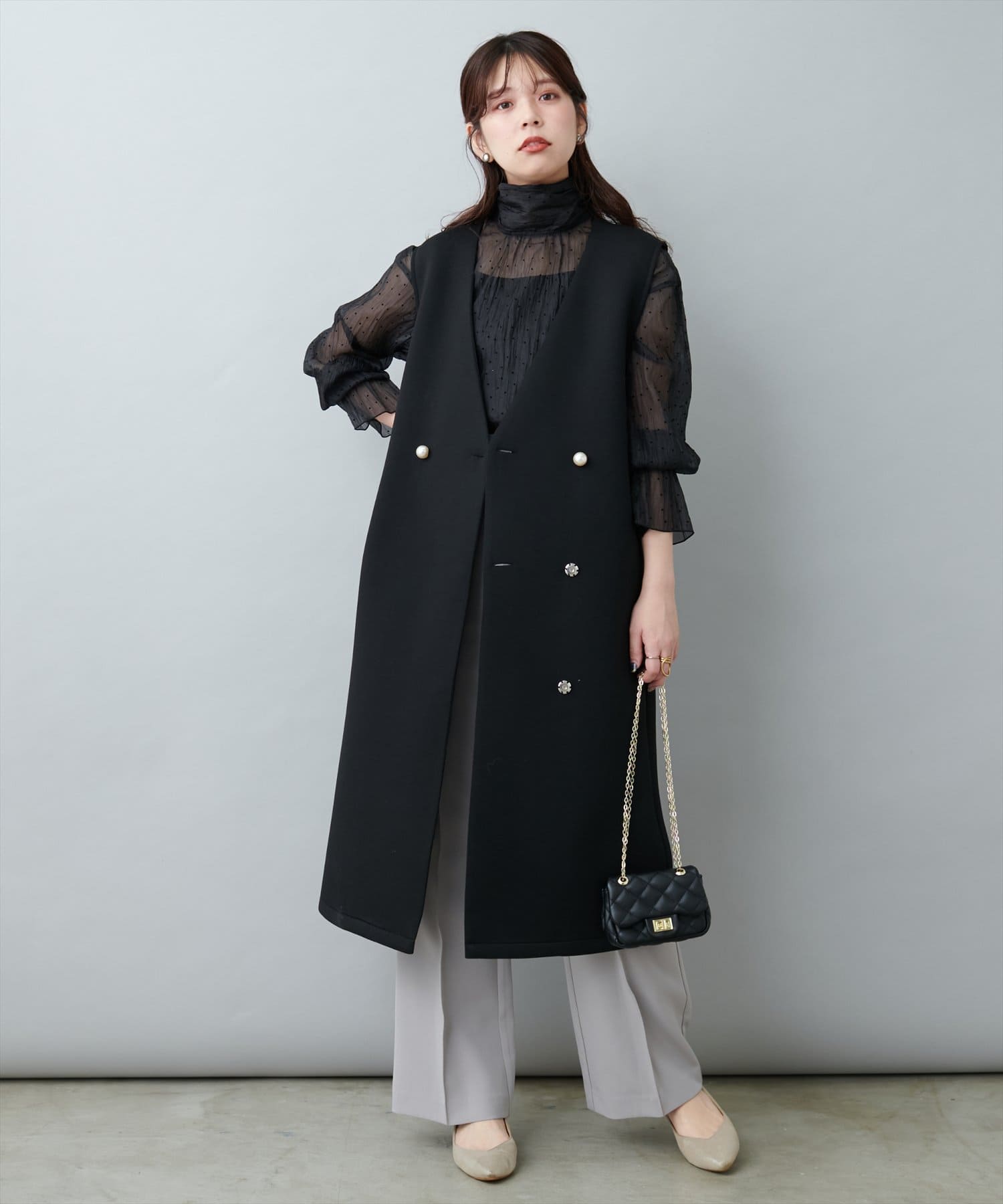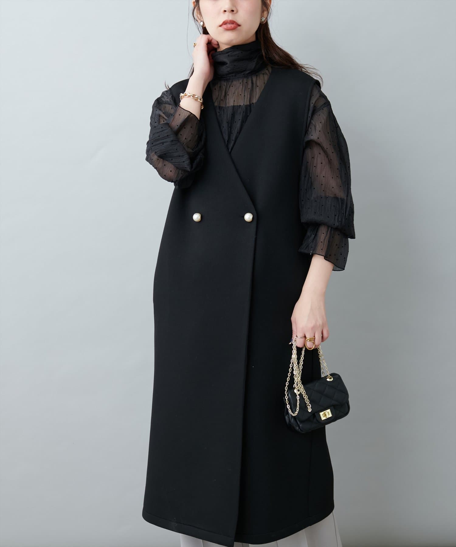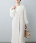 ノーカラーで、すっきり見えし、しっかりした素材感で盾ラインのきれいなシルエット。