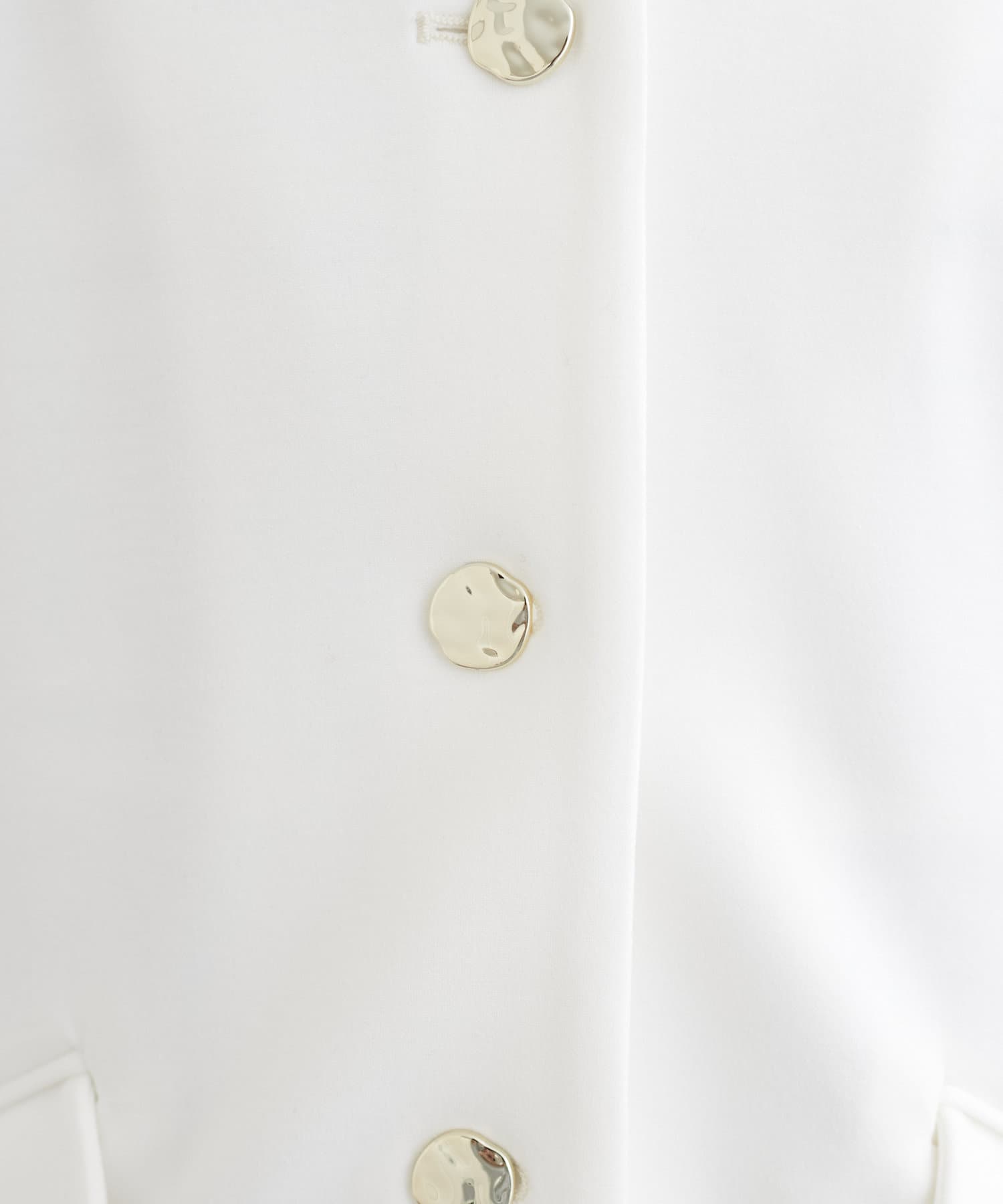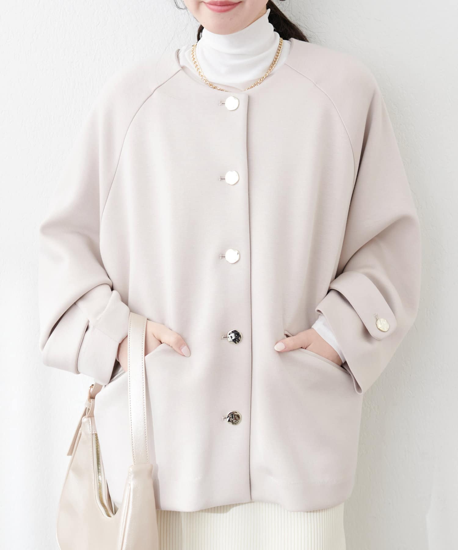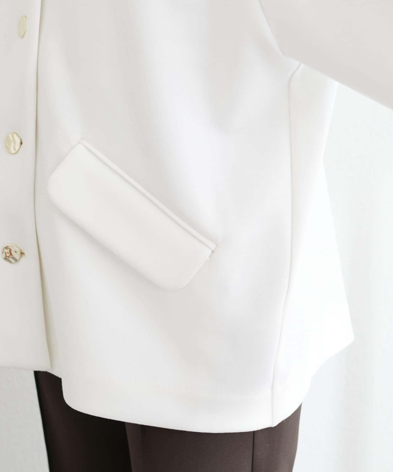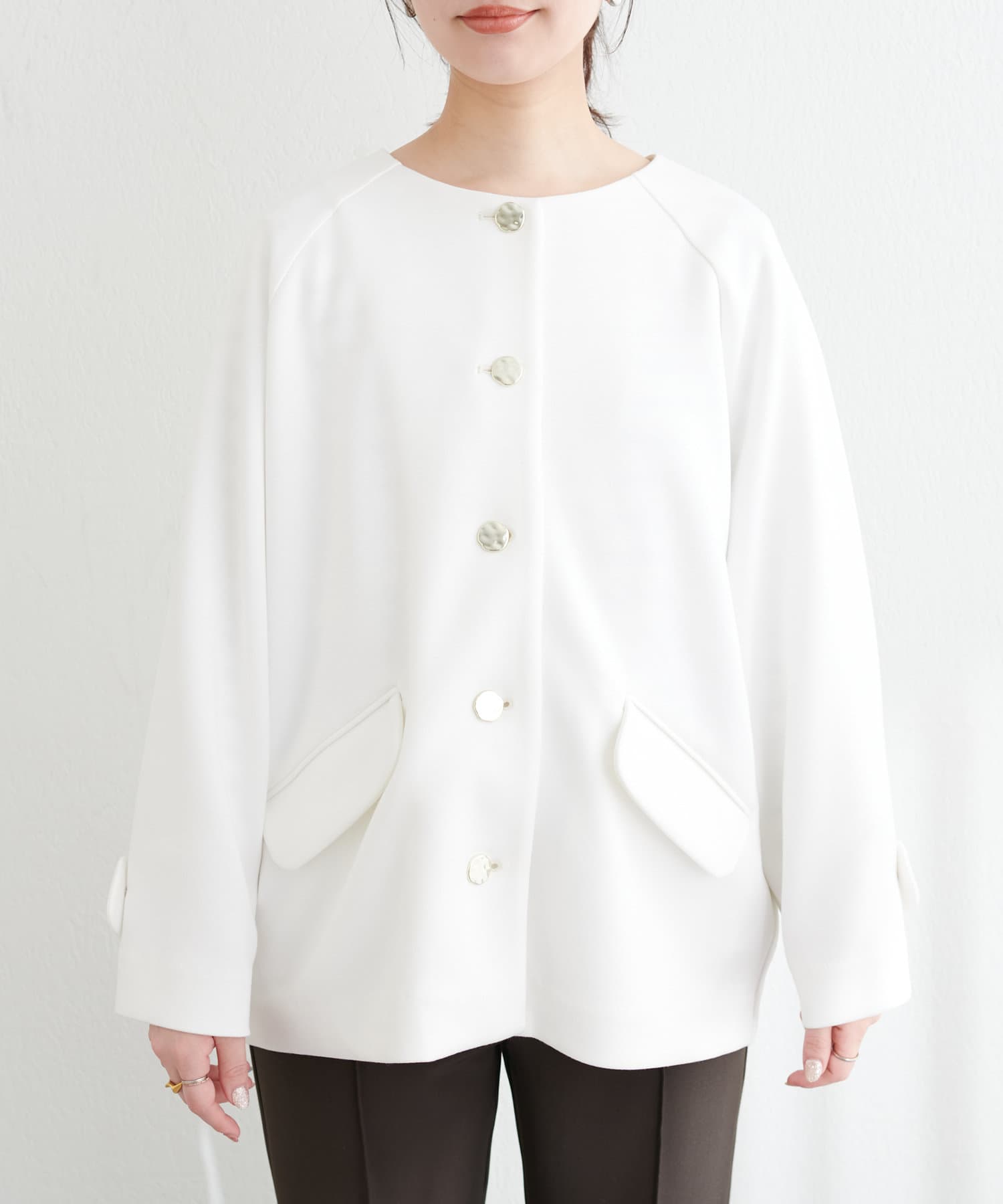 ノーカラーのシンプルなデザインに上品なべこべこ釦がアクセントに。