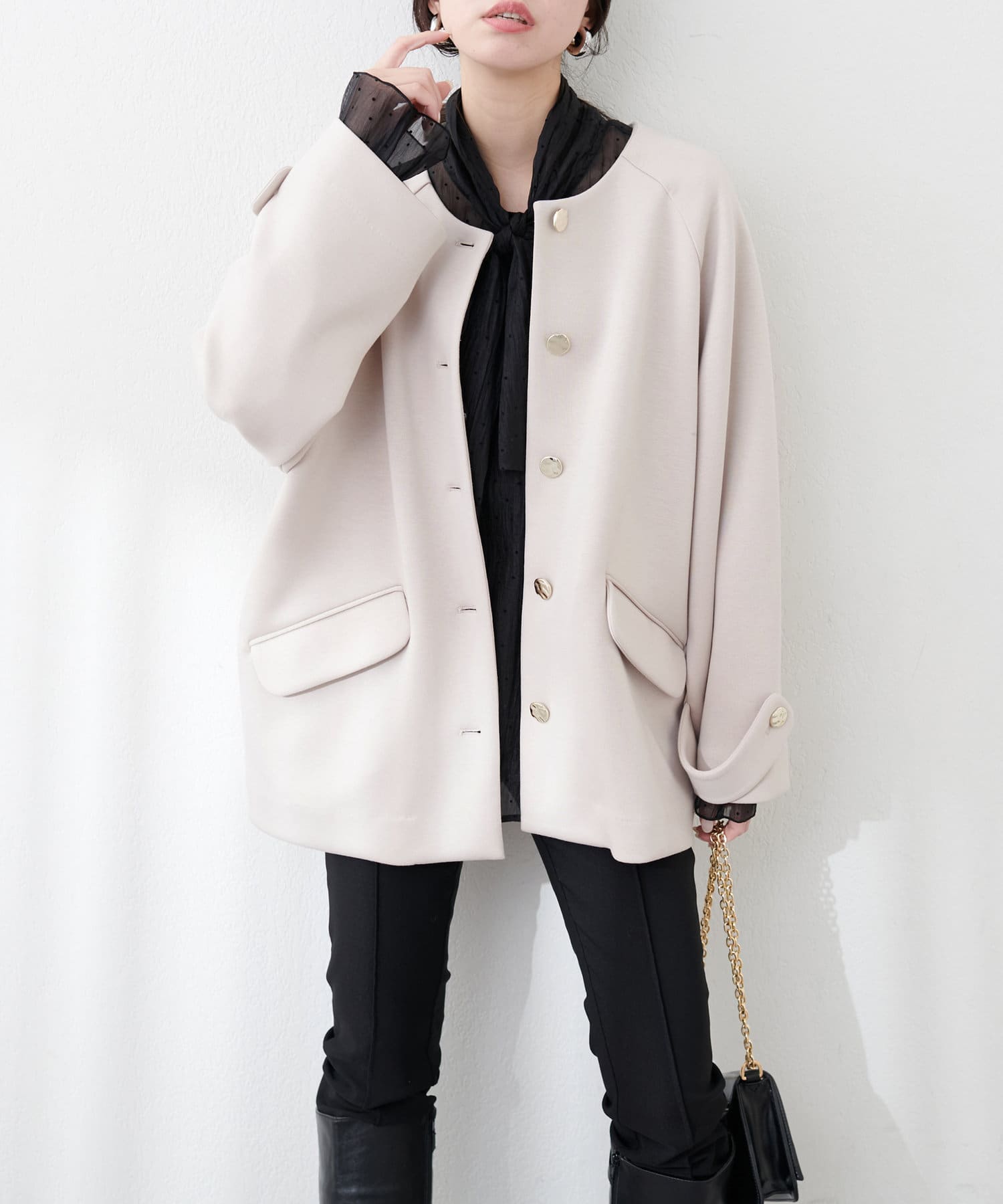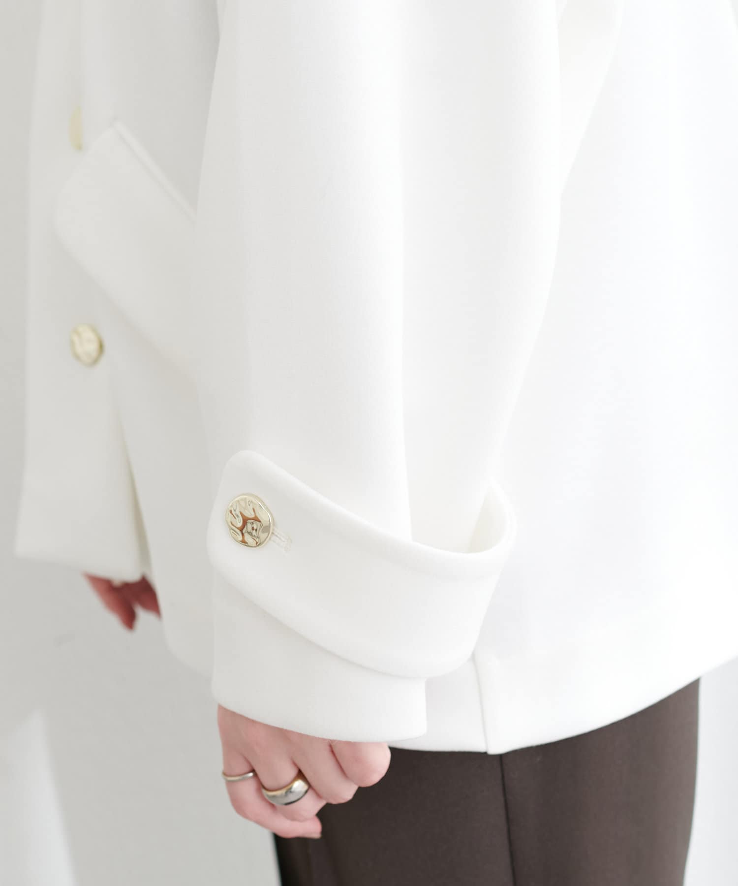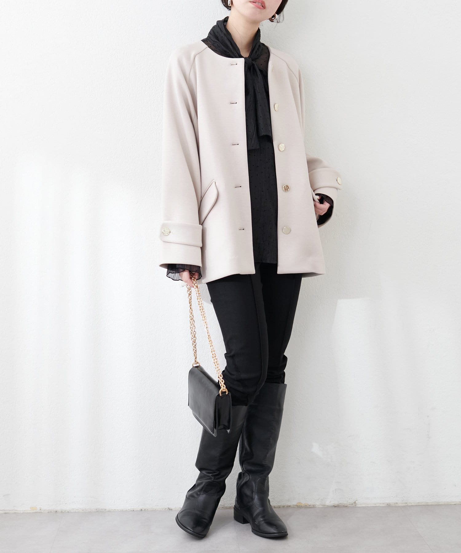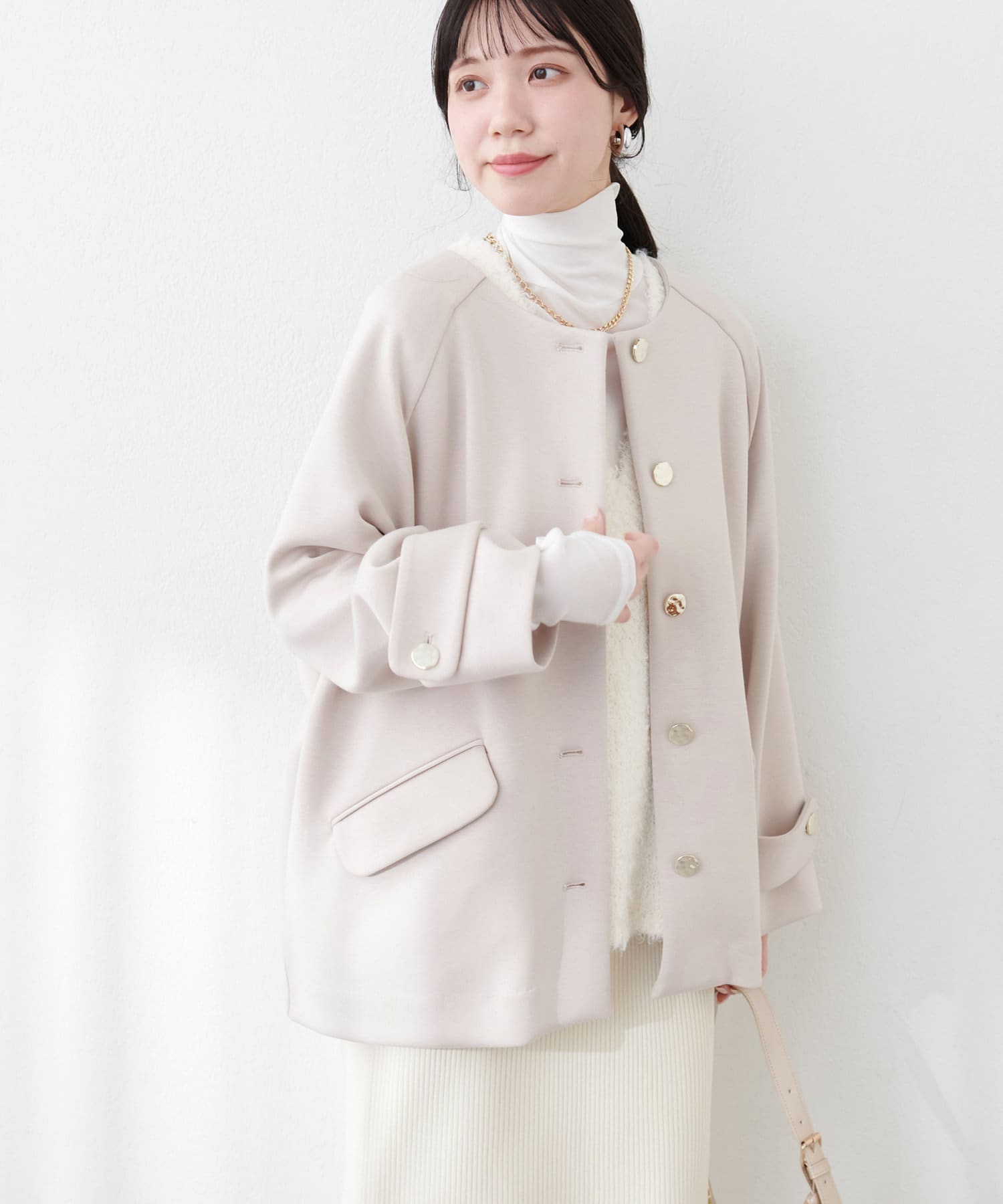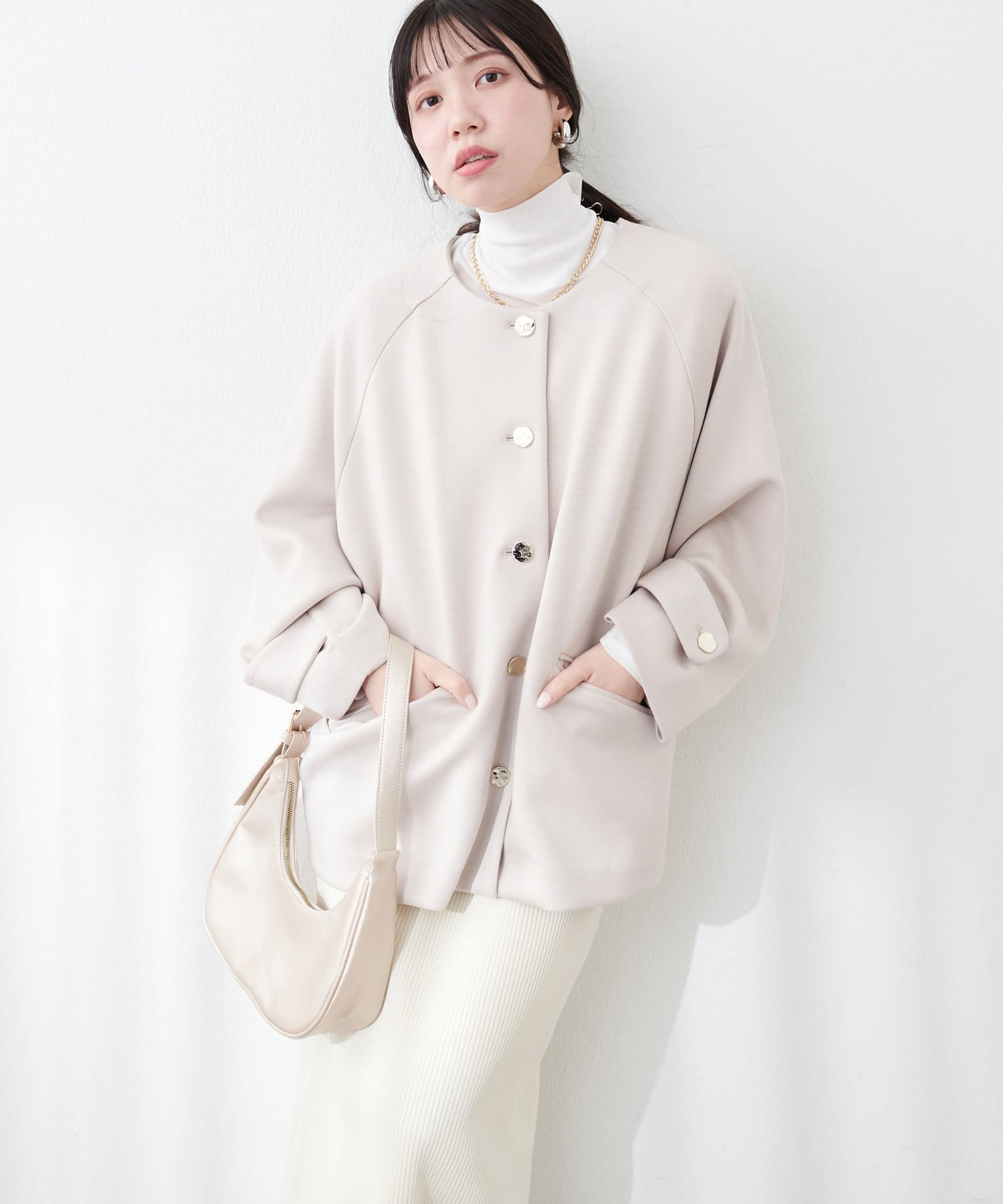 ノーカラーのシンプルなデザインに上品なべこべこ釦がアクセントに。