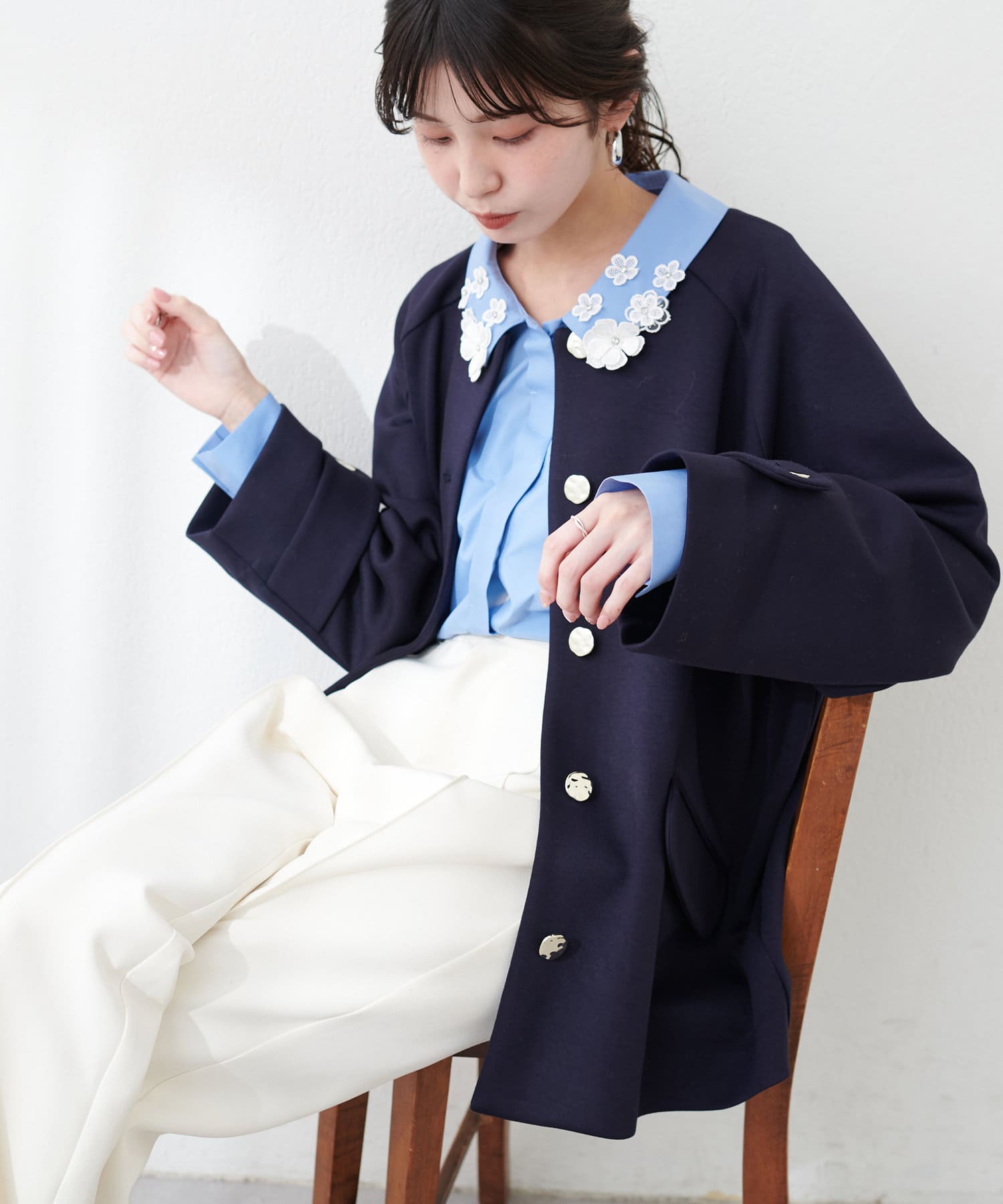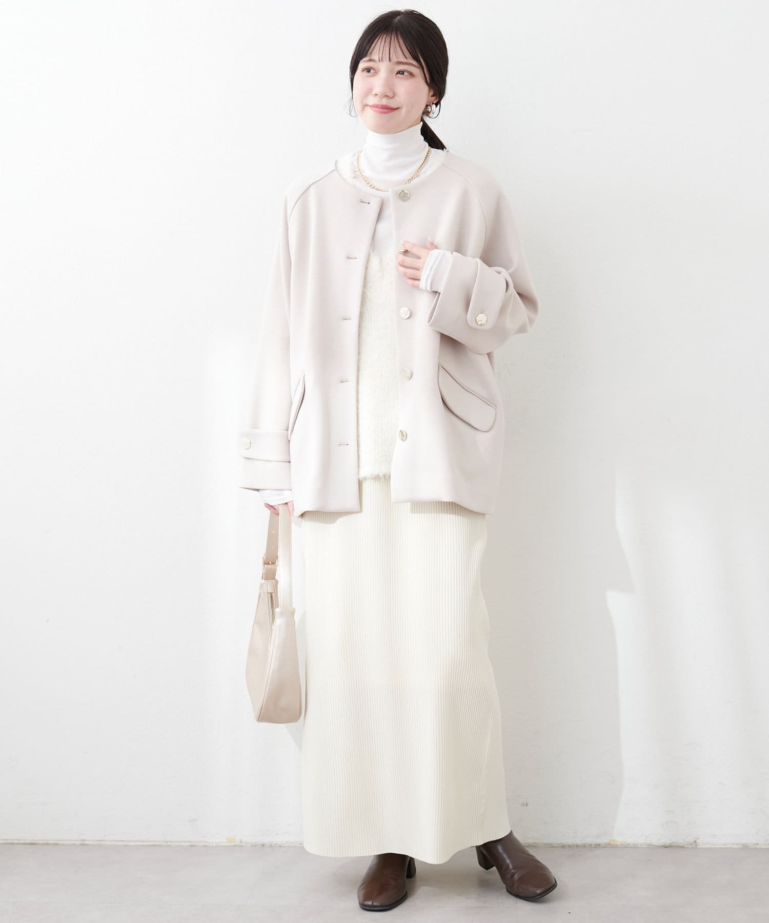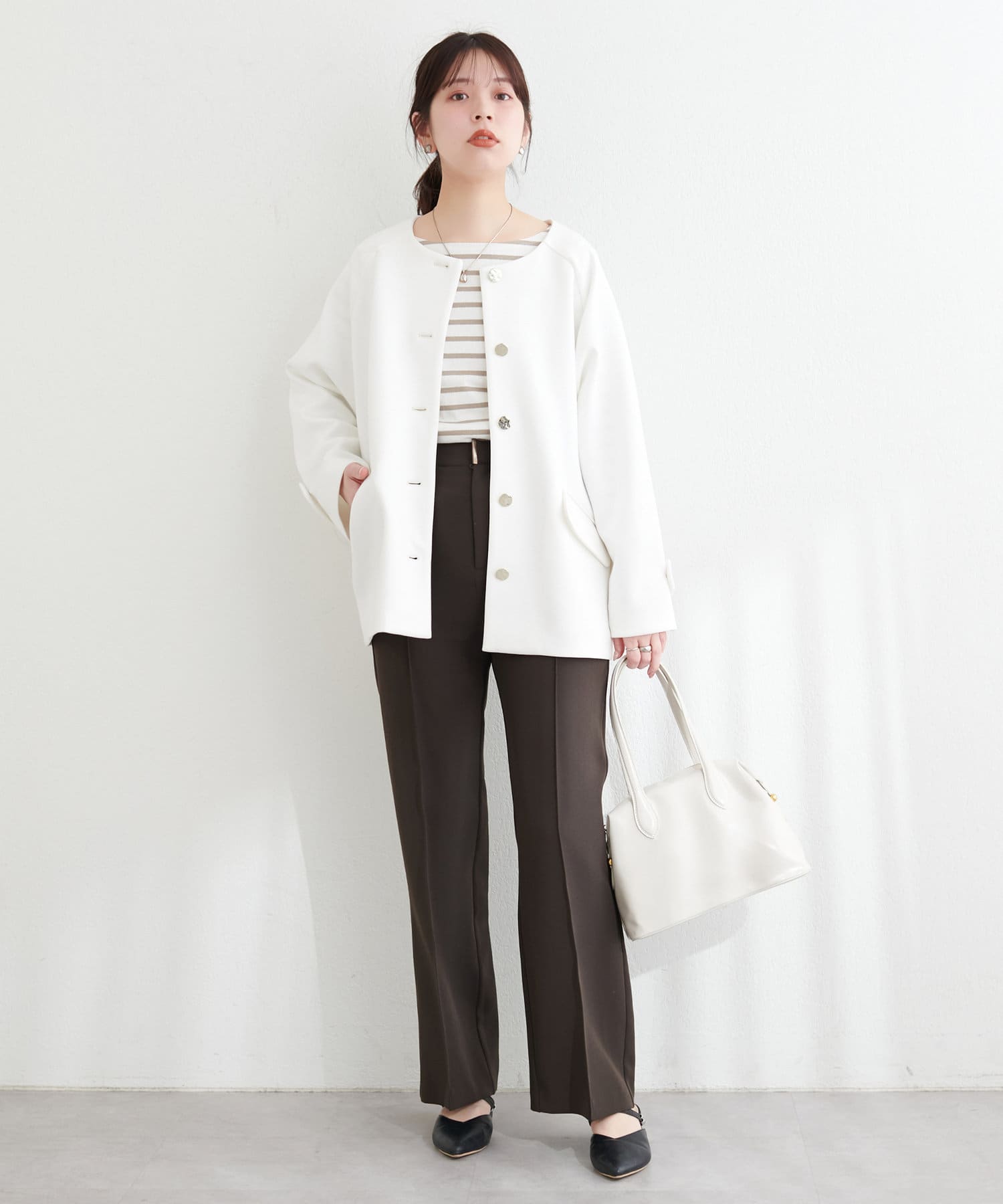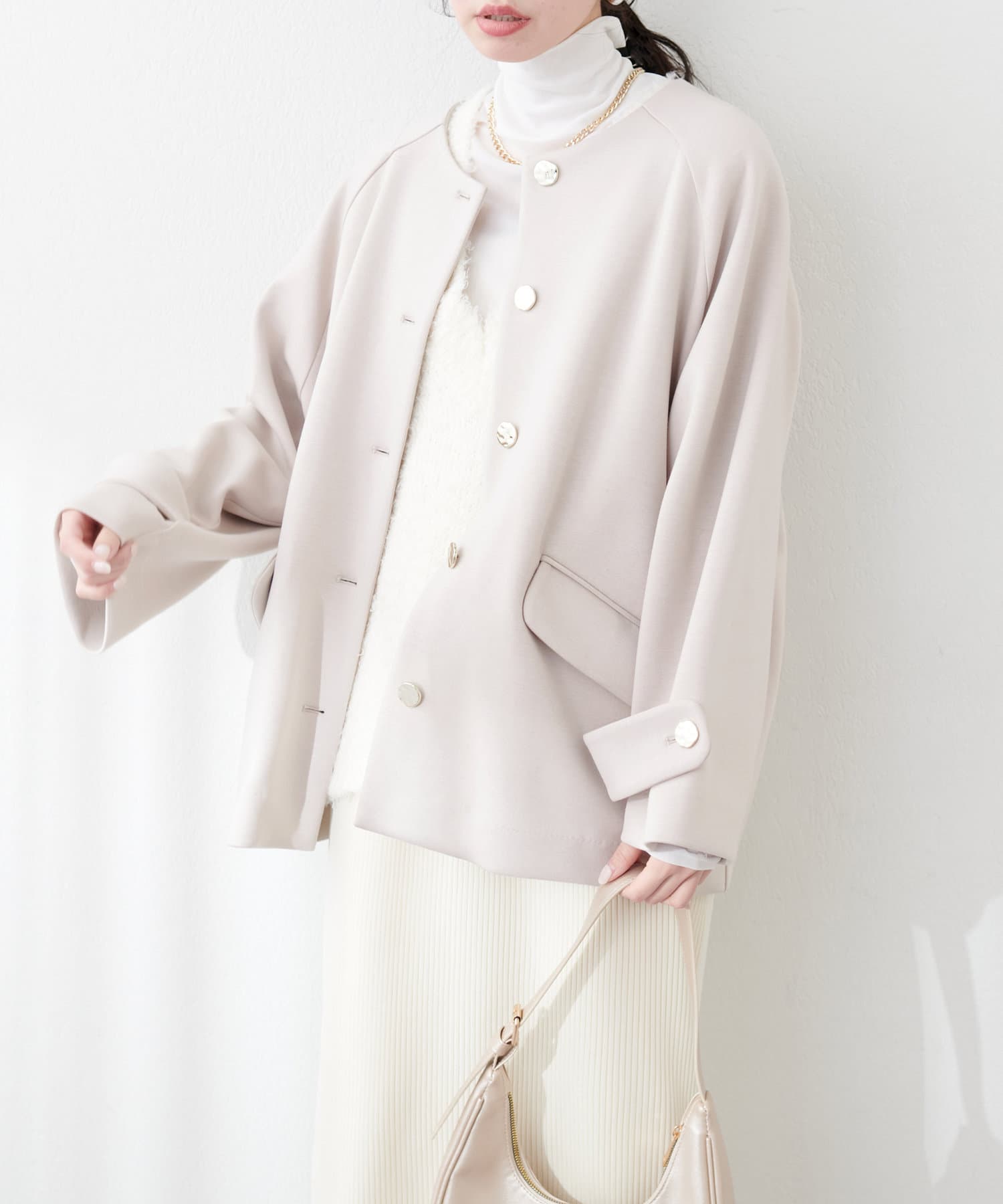 ノーカラーのシンプルなデザインに上品なべこべこ釦がアクセントに。