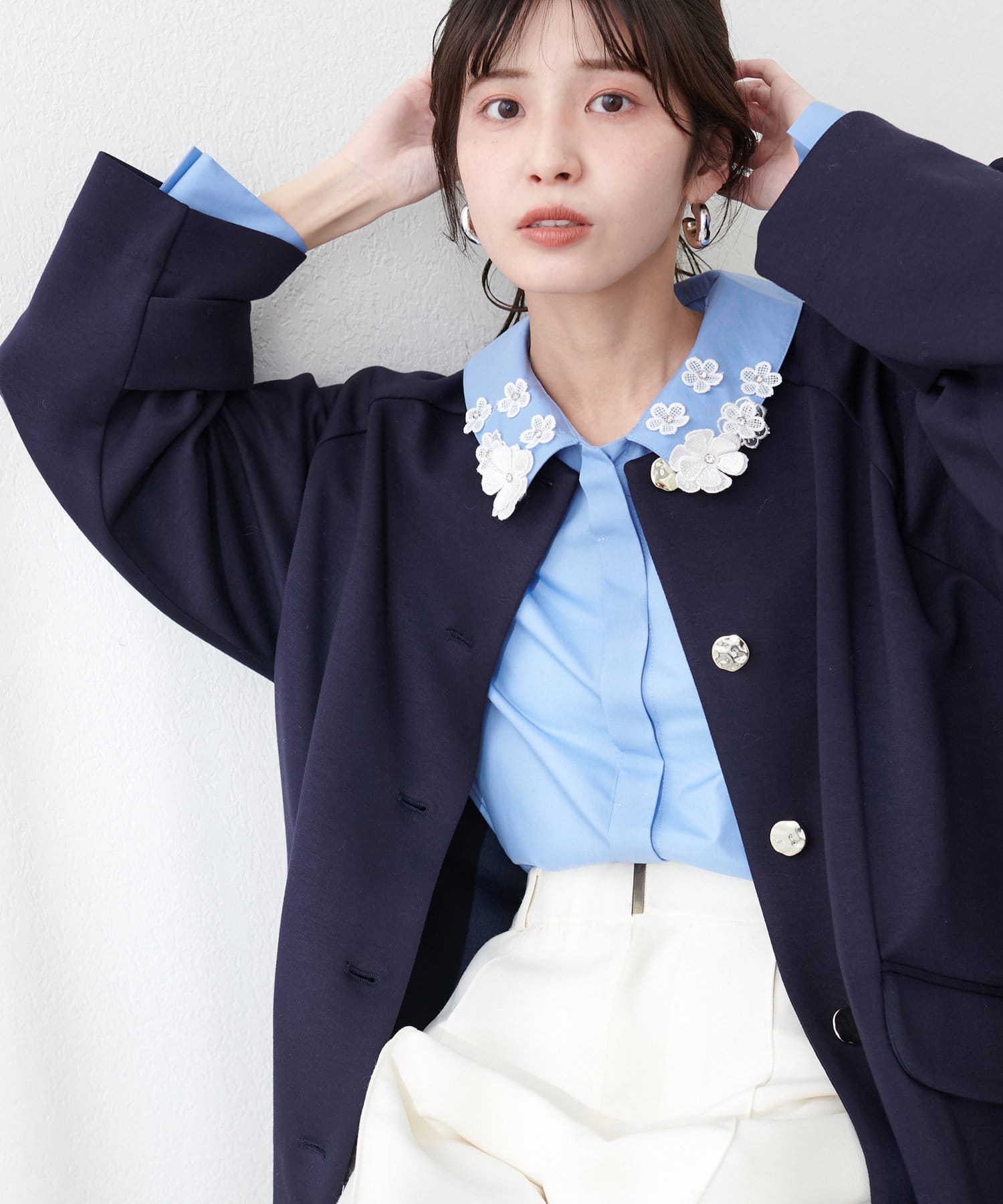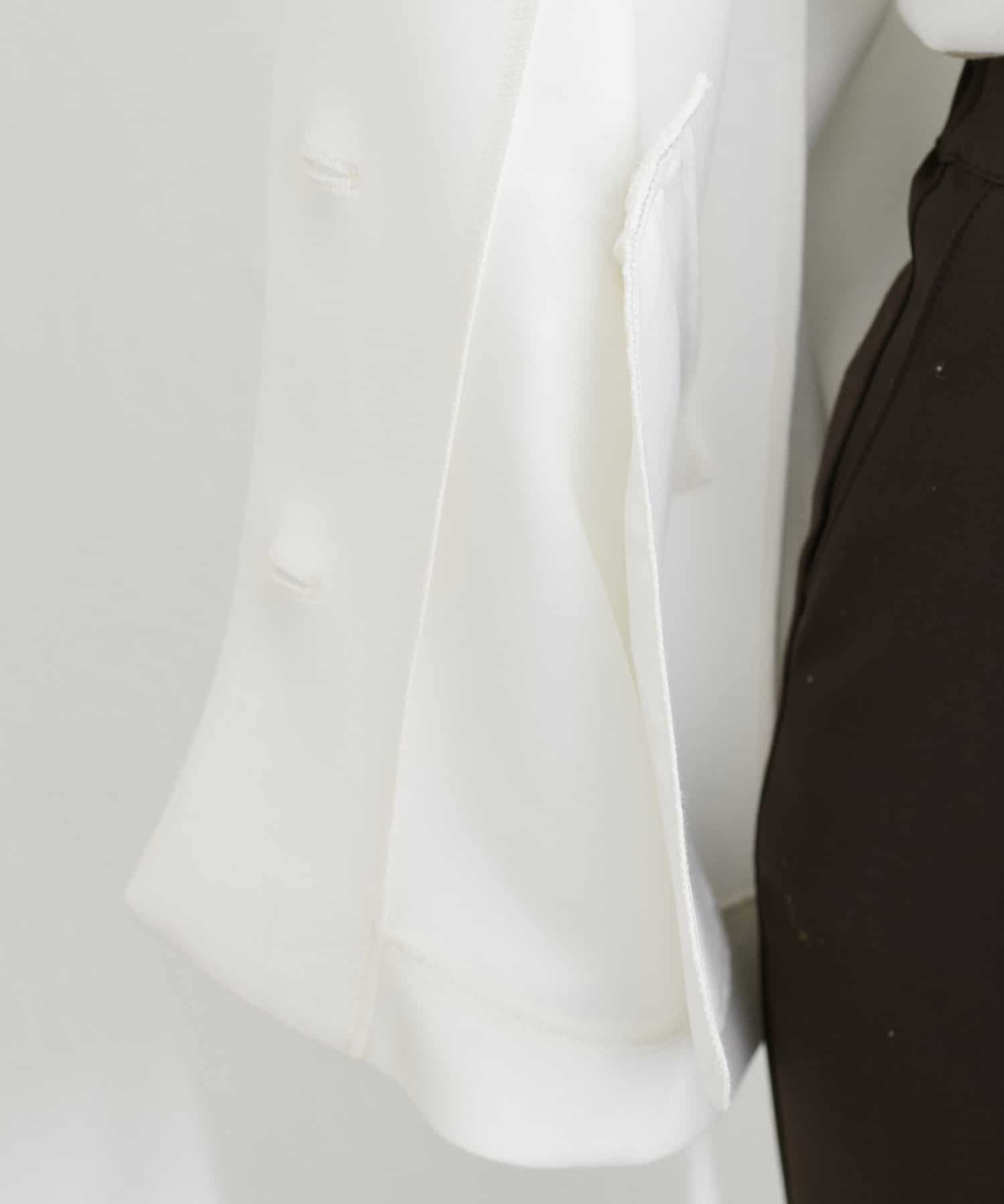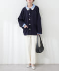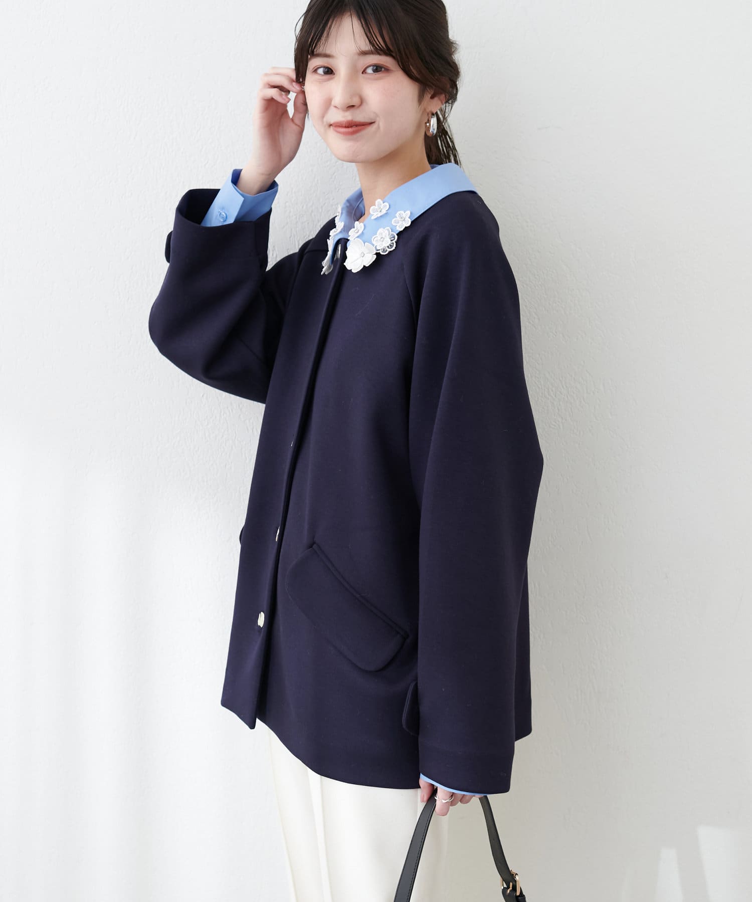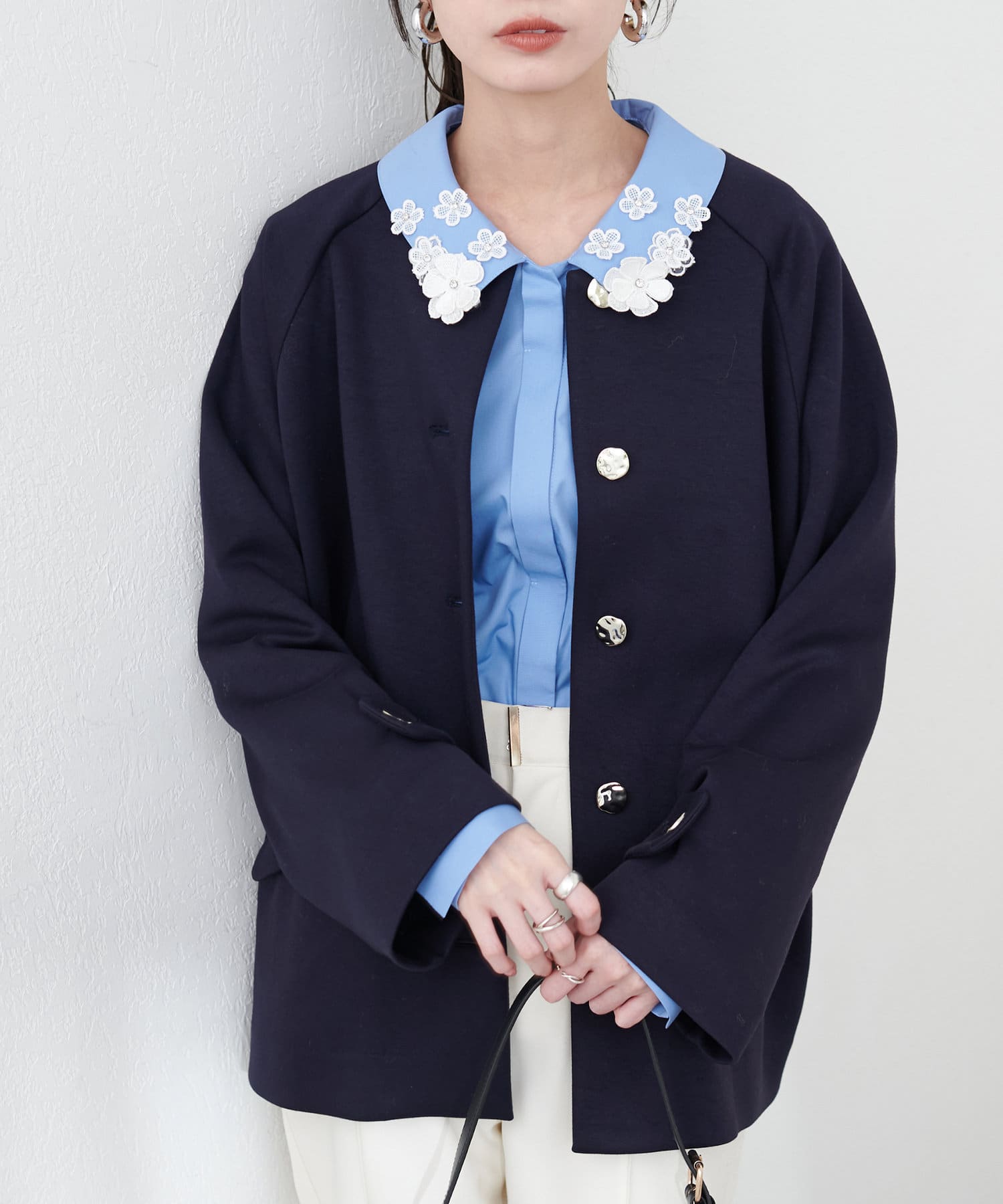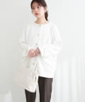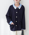 ノーカラーのシンプルなデザインに上品なべこべこ釦がアクセントに。