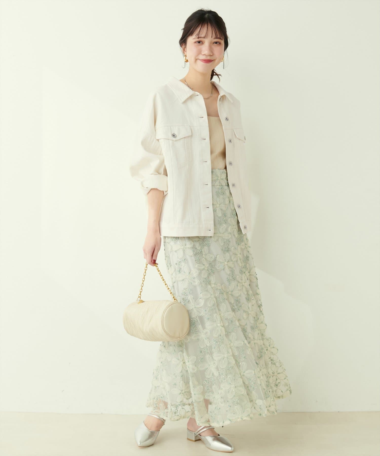 マーメイドシルエットのスカートやキャミワンピースなど女性らしい綺麗めアイテムにラフに羽織って頂くと、