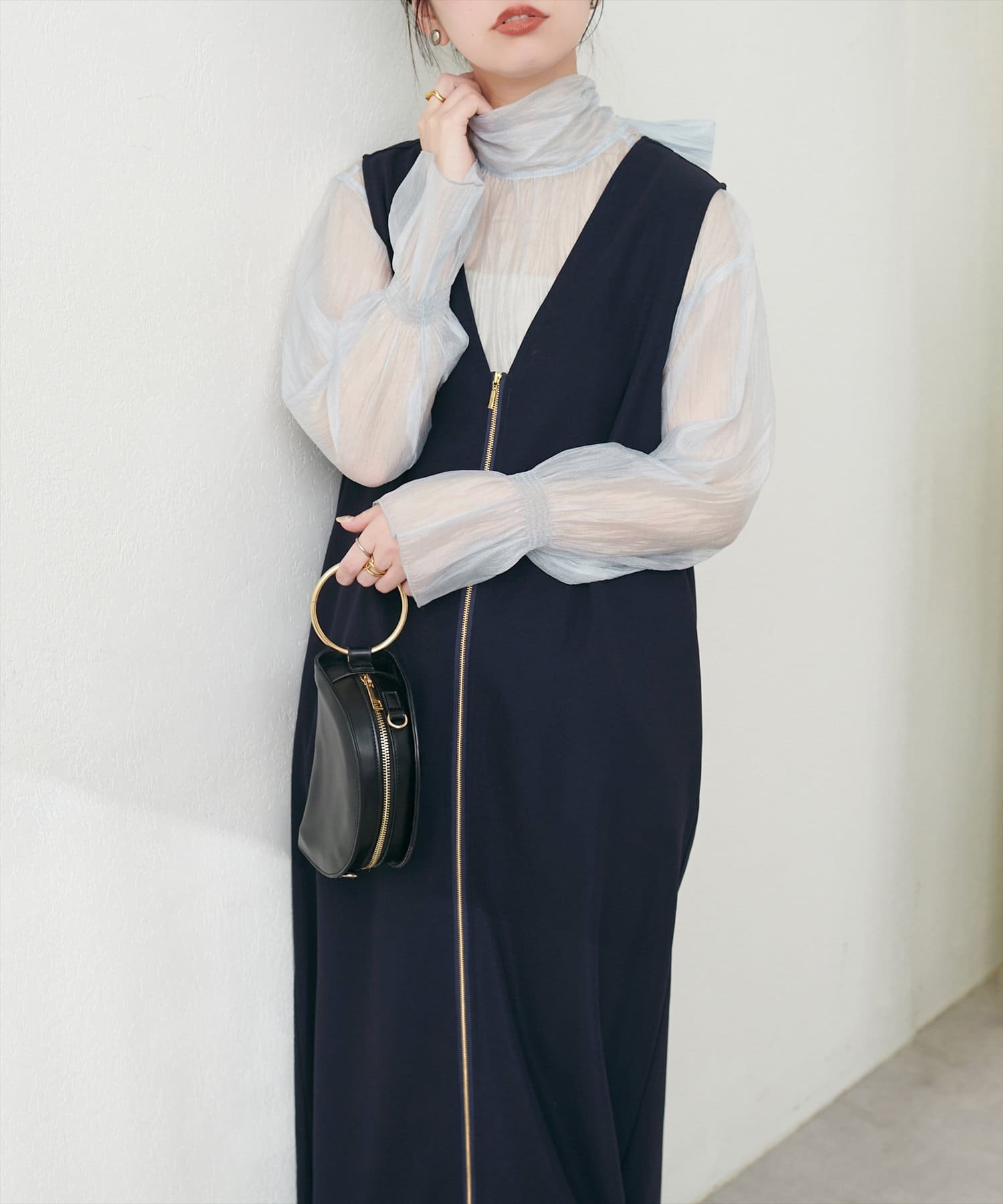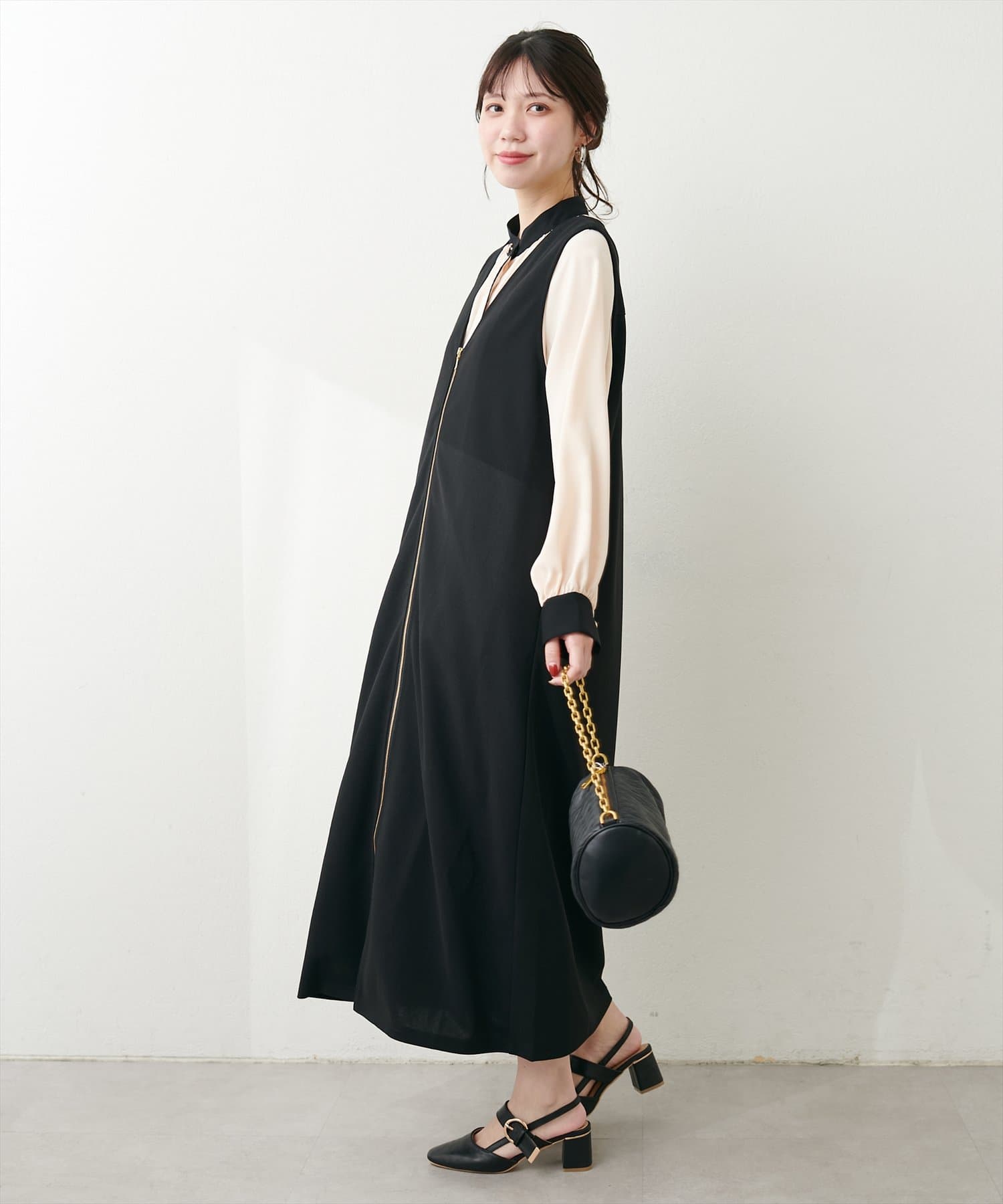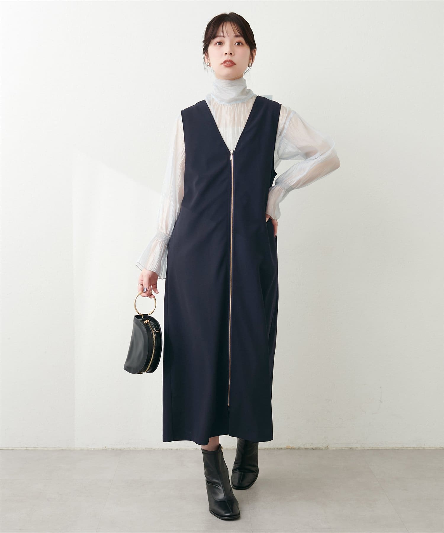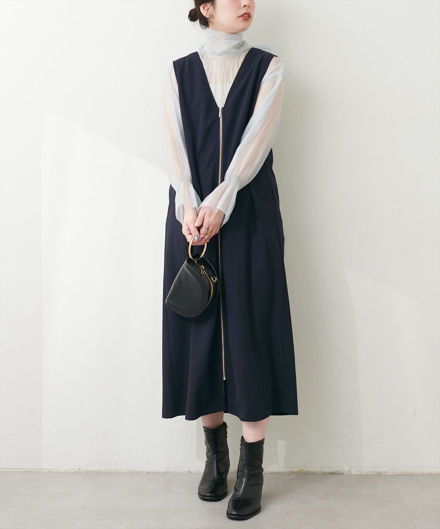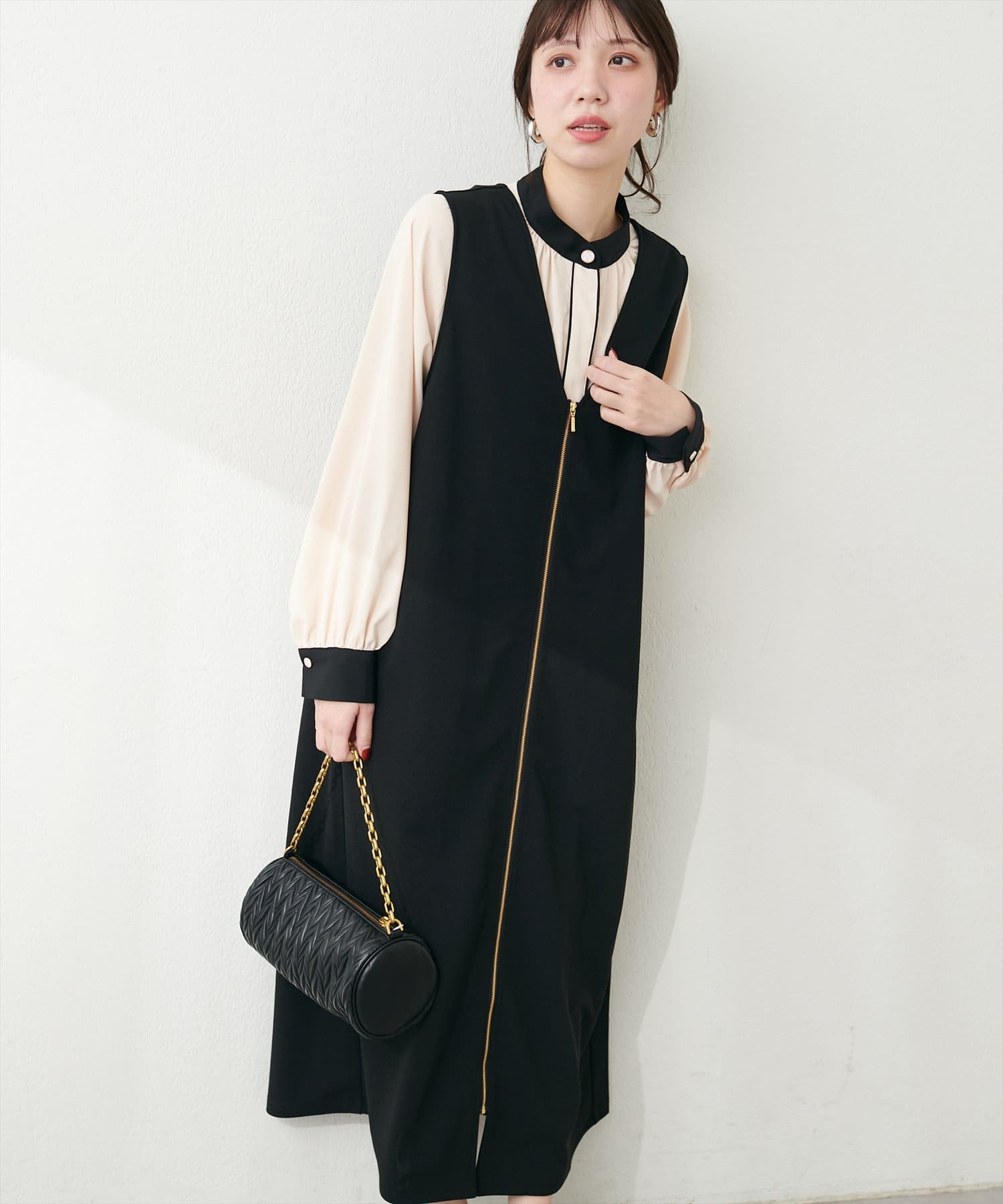 フロントのゴールドジップがコーディネートにアクセントをプラスしてくれるジャンスカ。